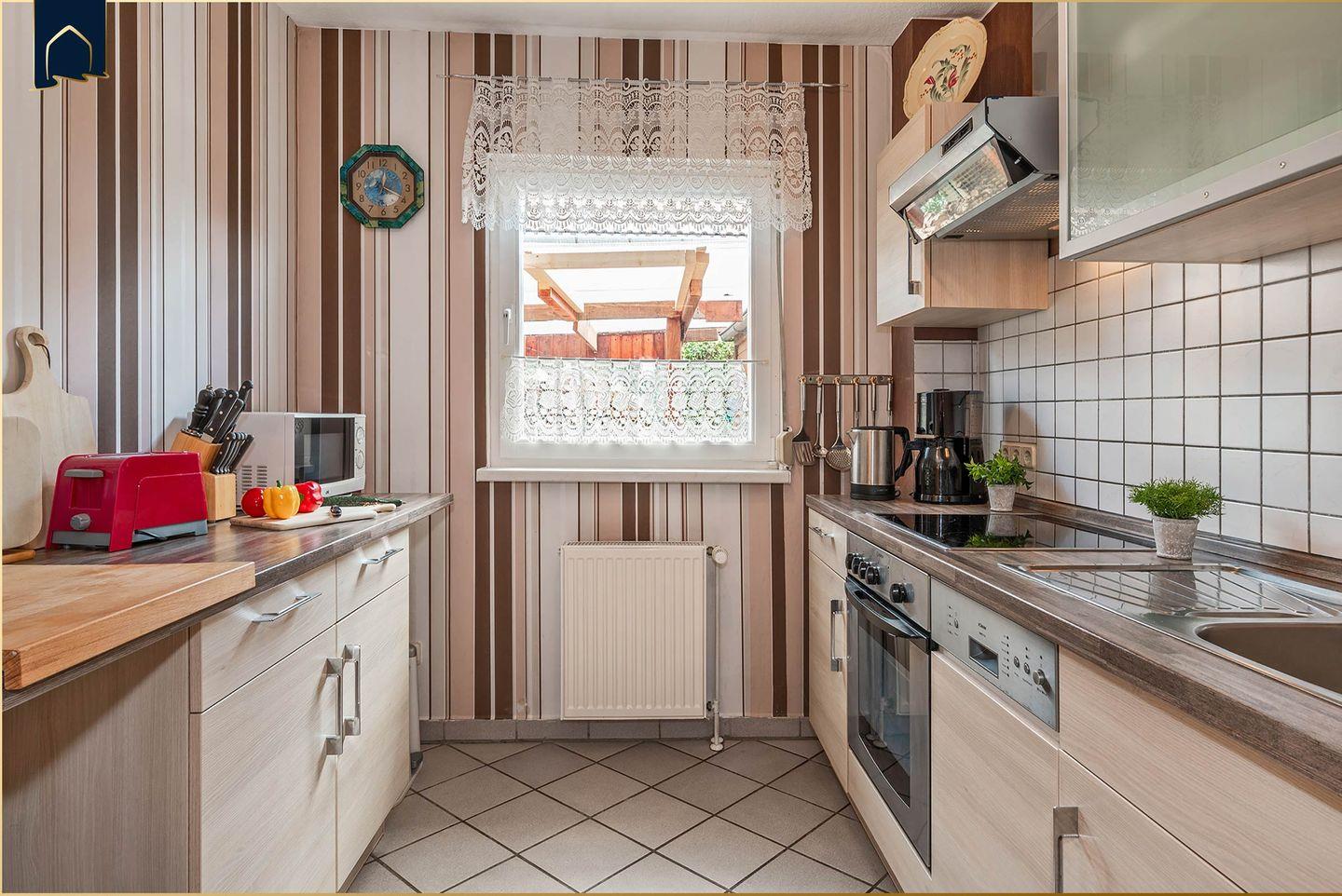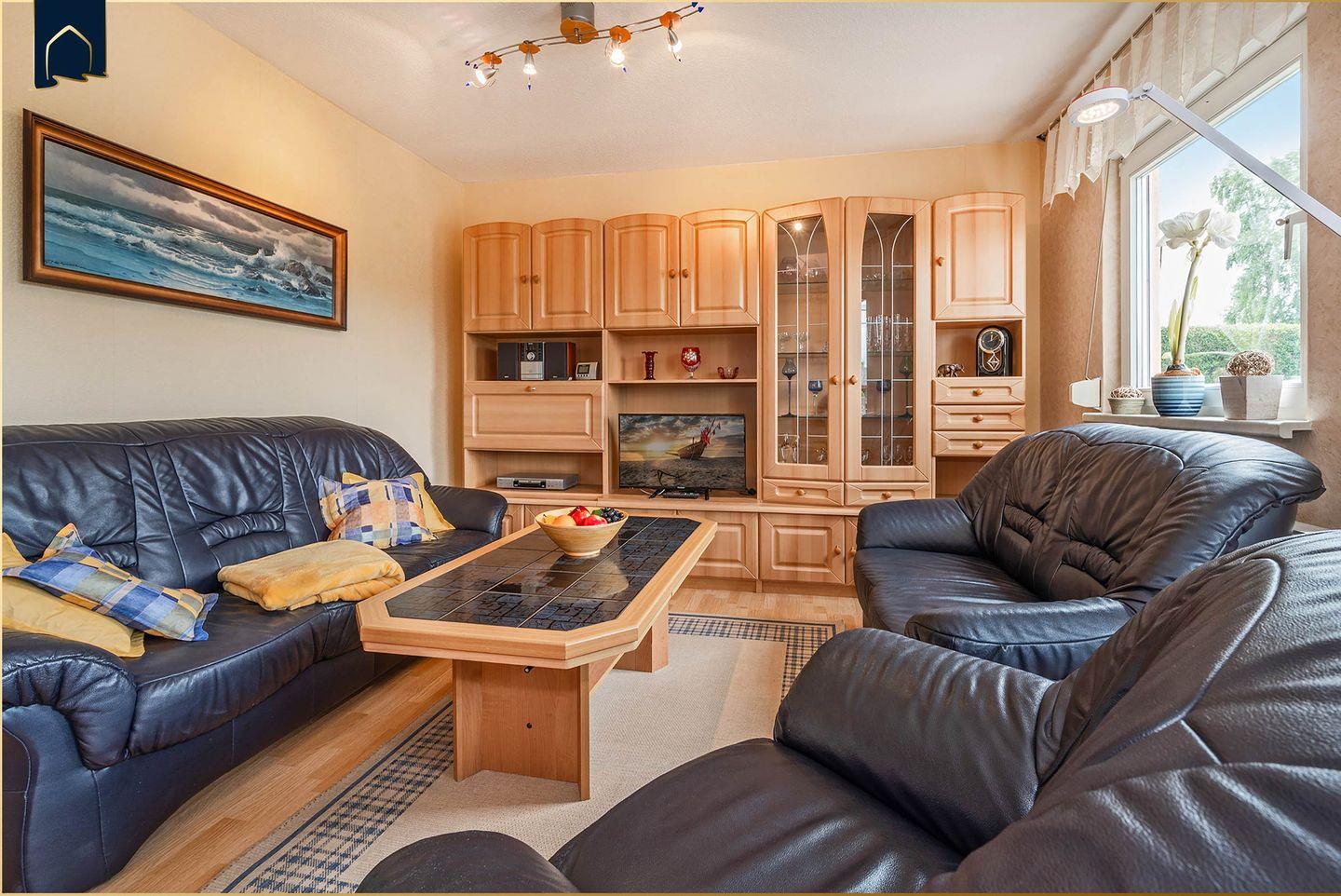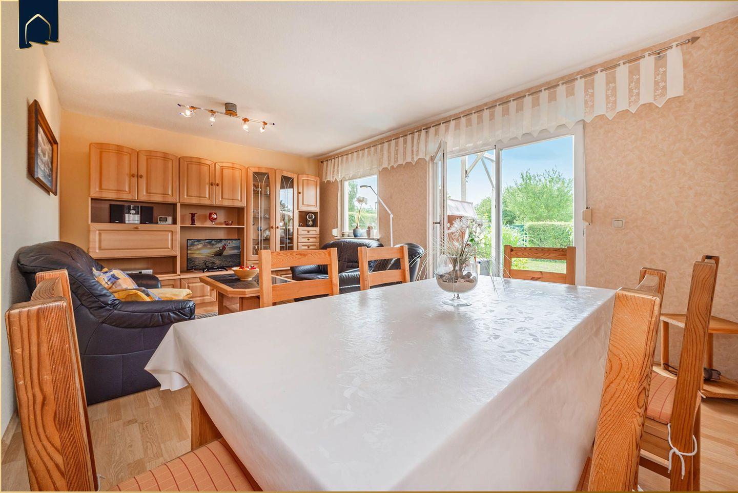 Der große Wohnbereich lädt mit bequemer Sofaecke, TV und Kamin zum Entspannen ein. Die voll ausgestattete Küche mit Backofen, Herd, Mikrowelle, Geschirrspüler, Kühlschrank und Kaffeemaschine lässt keine Wünsche offen. Vom Essbereich mit großem Esstisch gelangt man direkt auf die möblierte Terrasse – perfekt für ein Frühstück im Grünen oder einen Grillabend im Sonnenuntergang. WLAN, Bücher, Radio und Fliegengitter an den Fenstern sorgen für zusätzlichen Komfort.