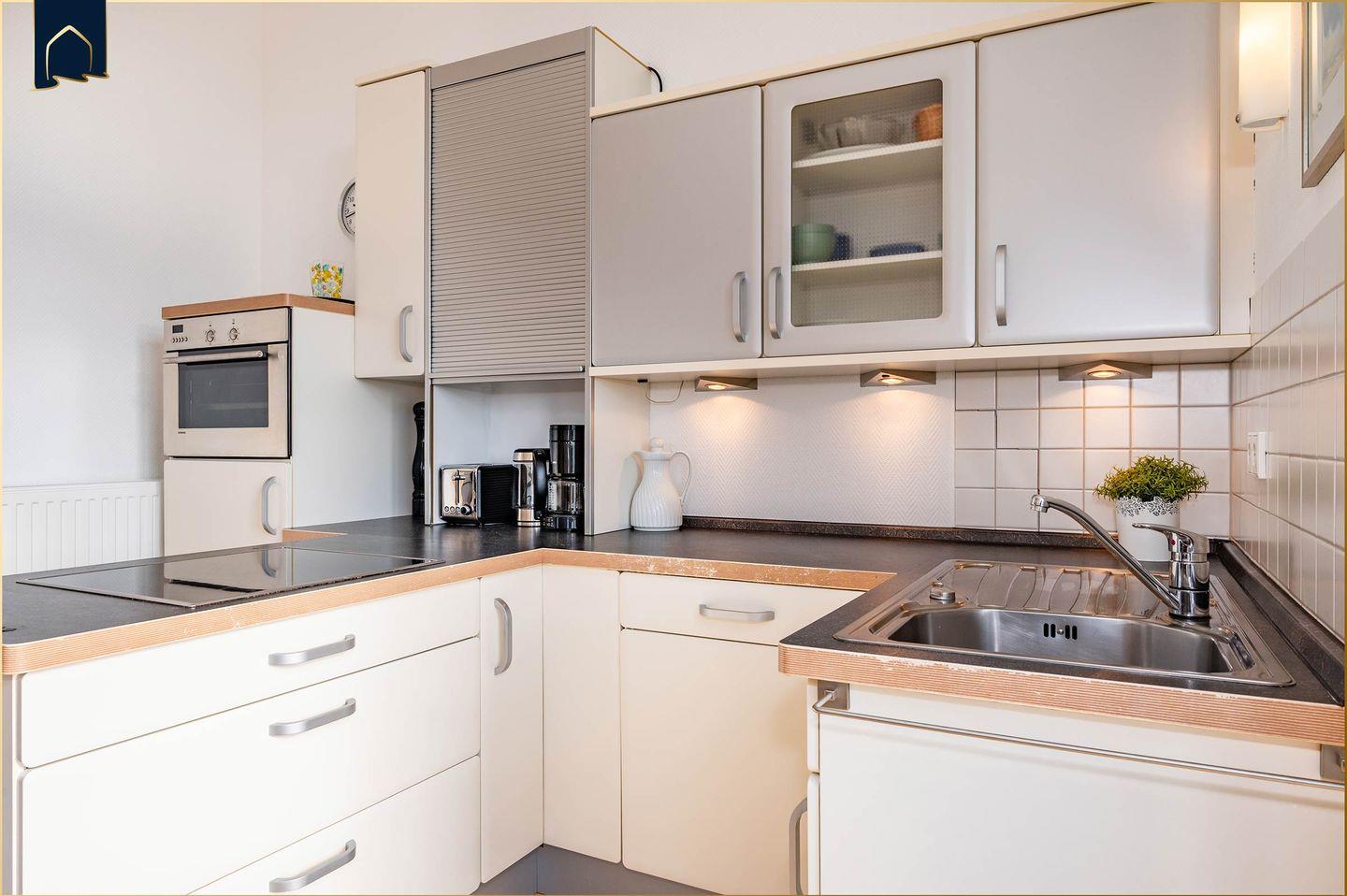 Die offene Küche ist komplett ausgestattet: Geschirrspüler, Backofen, Herd, Mikrowelle, Kühlschrank mit Gefrierfach, Wasserkocher, Toaster, Mixer und Kaffeemaschine stehen bereit. Im Essbereich finden vier Personen bequem Platz. Zwei moderne TVs, WLAN, Radio und ein Schreibtisch runden das Angebot ab. Das stilvolle Badezimmer bietet Badewanne und Dusche, zusätzlich gibt es WC, Waschbecken, Föhn und einen Verbandskasten. Ein Abstellraum für Fahrräder sowie ein Aufzug im Gebäude sorgen für zusätzlichen Komfort.