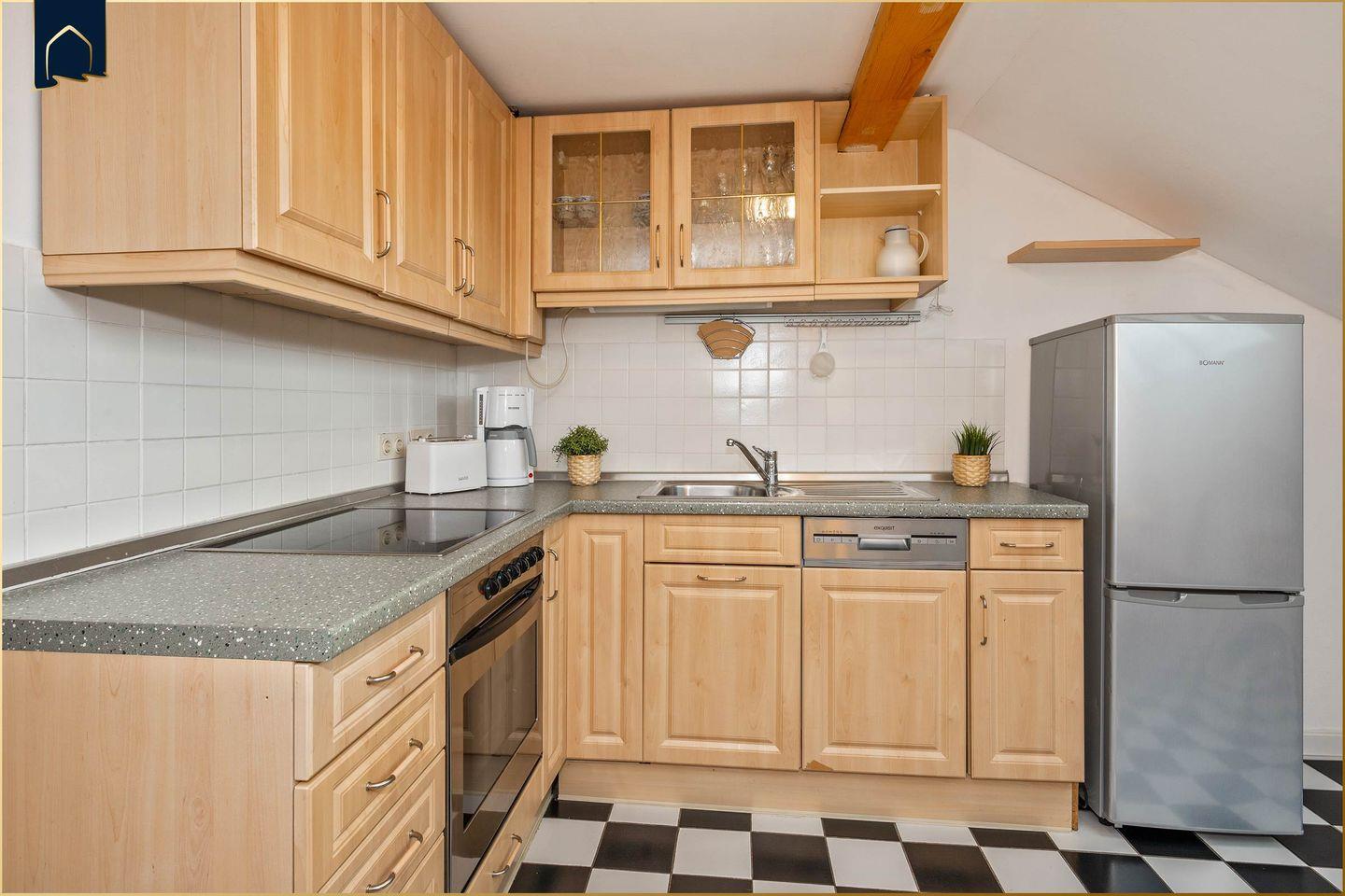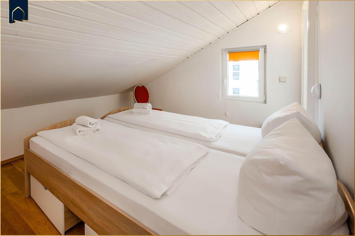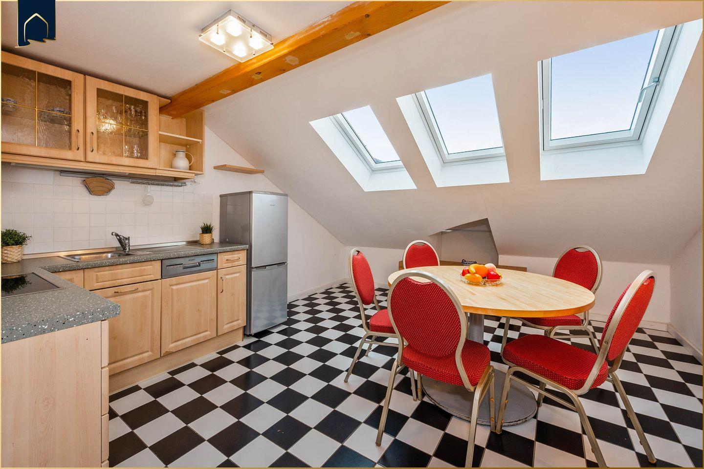 Die Unterkunft erstreckt sich über zwei Etagen und verfügt über drei separate Schlafzimmer, sodass bis zu fünf Personen komfortabel untergebracht werden können. Ein zusätzliches Zustellbett ist ebenfalls vorhanden. Das helle Badezimmer bietet eine Dusche sowie eine Badewanne – ideal für Familien mit Kindern oder zur entspannten Auszeit nach einem aktiven Urlaubstag. Die moderne Küche ist komplett ausgestattet: Herd, Backofen, Gefrierfach, Spülmaschine, Kaffeemaschine, Toaster und viele weitere Küchenutensilien stehen bereit, damit du dich selbst versorgen kannst. Ein gemütlicher Essbereich mit großem Tisch schafft Raum für gemeinsame Mahlzeiten.
