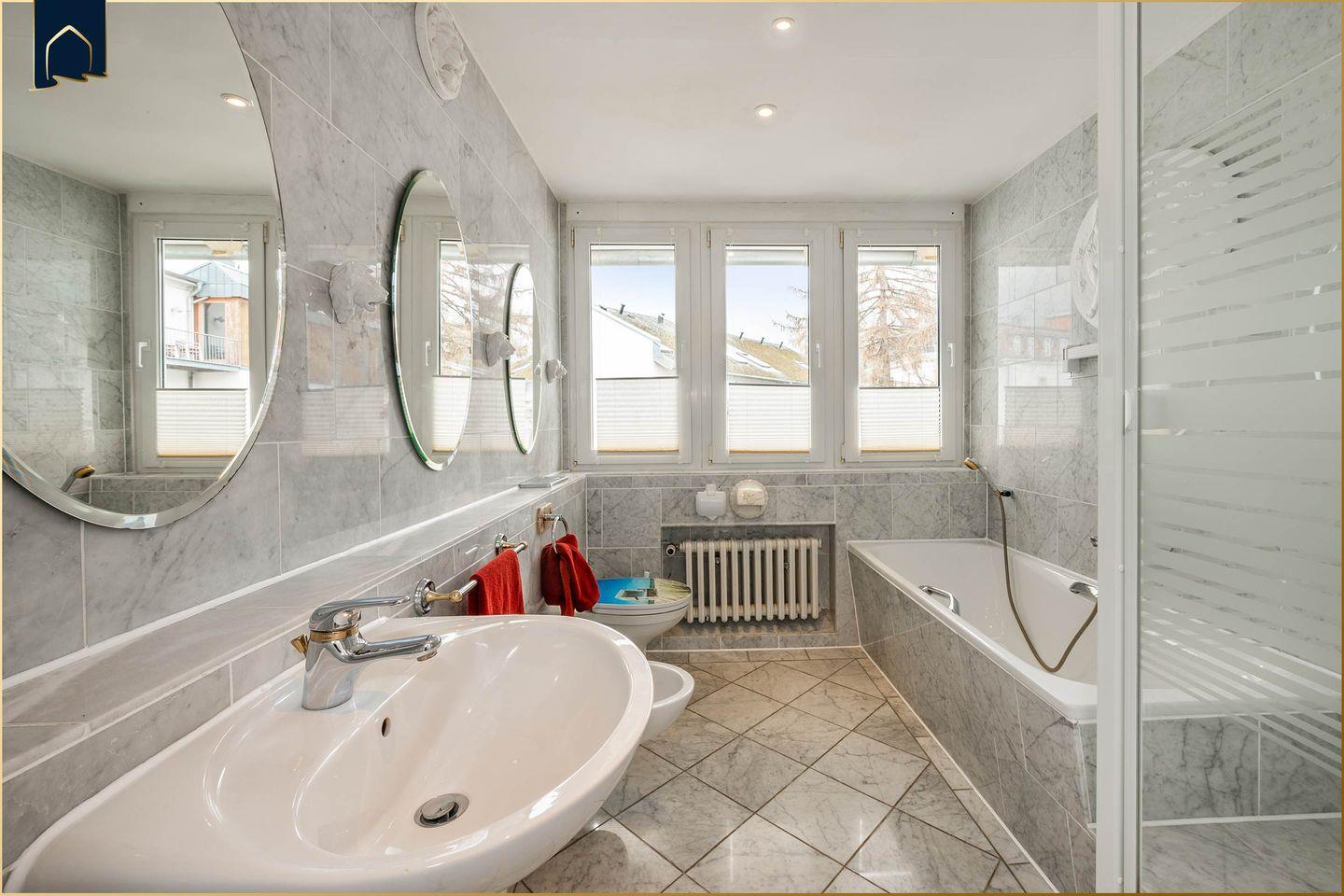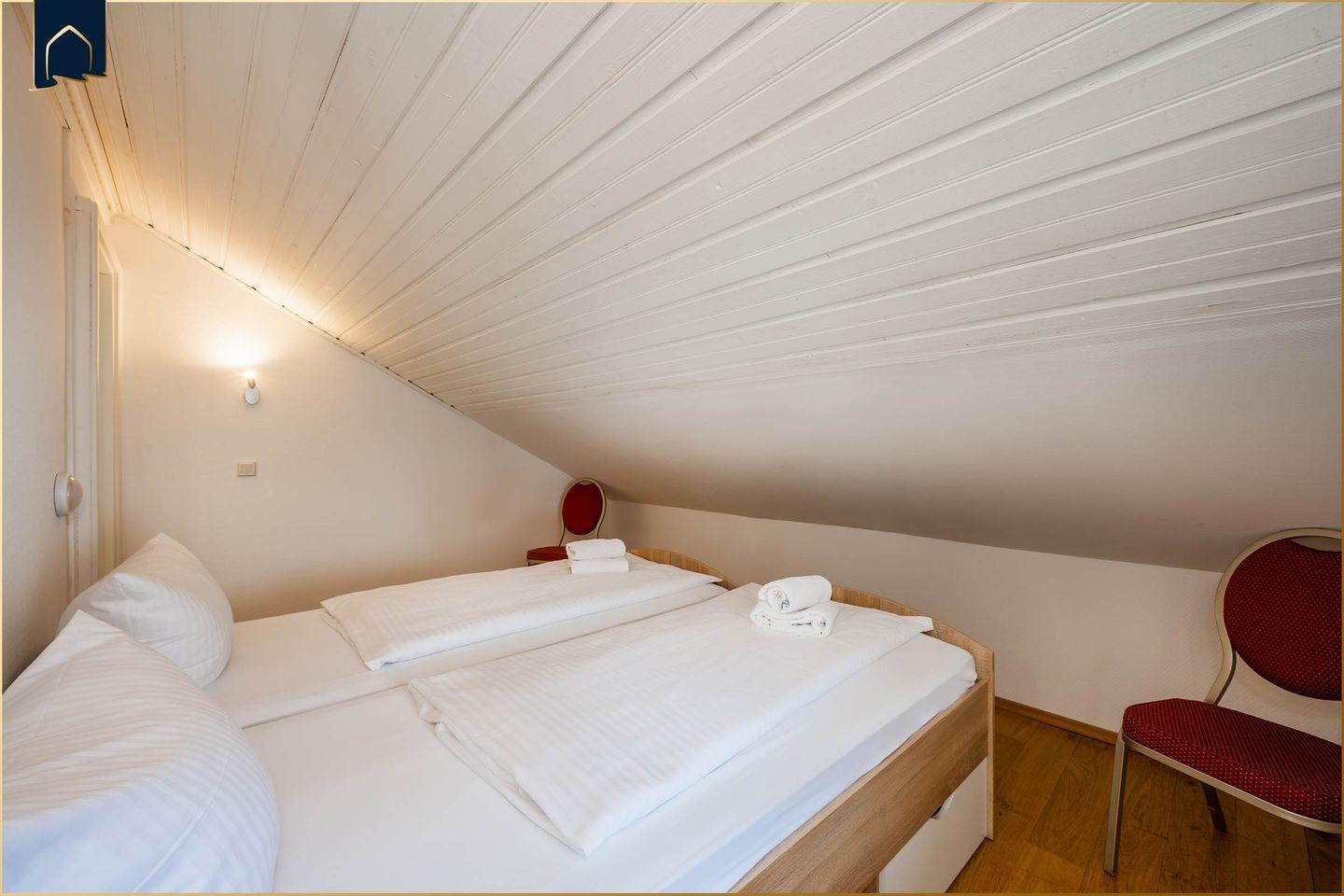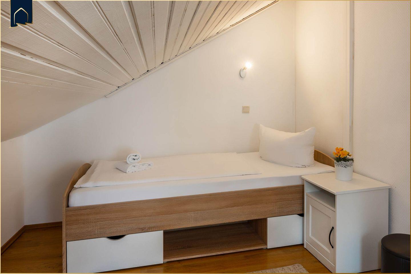 Die Unterkunft erstreckt sich über zwei Etagen und verfügt über drei separate Schlafzimmer, sodass bis zu fünf Personen komfortabel untergebracht werden können. Ein zusätzliches Zustellbett ist ebenfalls vorhanden. Das helle Badezimmer bietet eine Dusche sowie eine Badewanne – ideal für Familien mit Kindern oder zur entspannten Auszeit nach einem aktiven Urlaubstag. Die moderne Küche ist komplett ausgestattet: Herd, Backofen, Gefrierfach, Spülmaschine, Kaffeemaschine, Toaster und viele weitere Küchenutensilien stehen bereit, damit du dich selbst versorgen kannst. Ein gemütlicher Essbereich mit großem Tisch schafft Raum für gemeinsame Mahlzeiten.