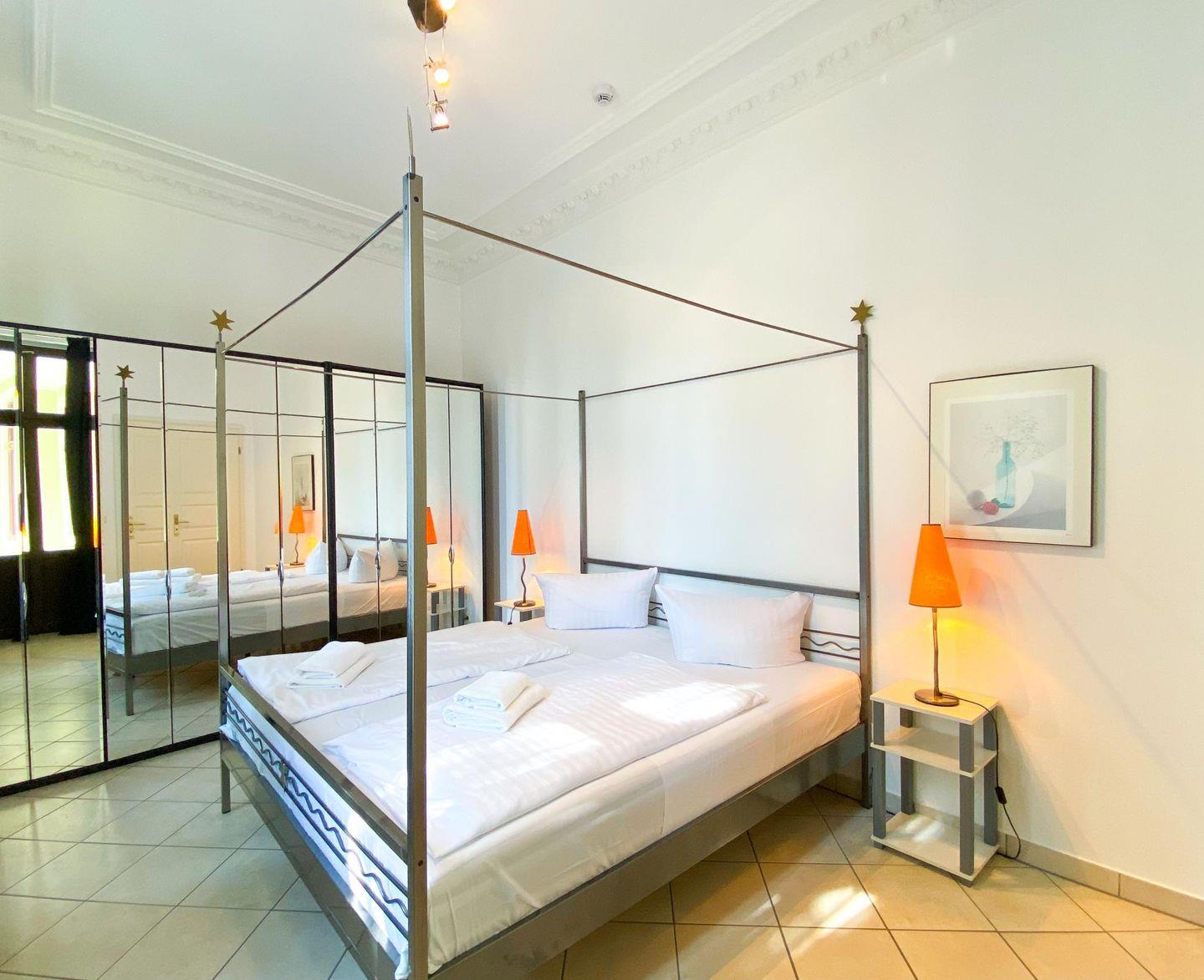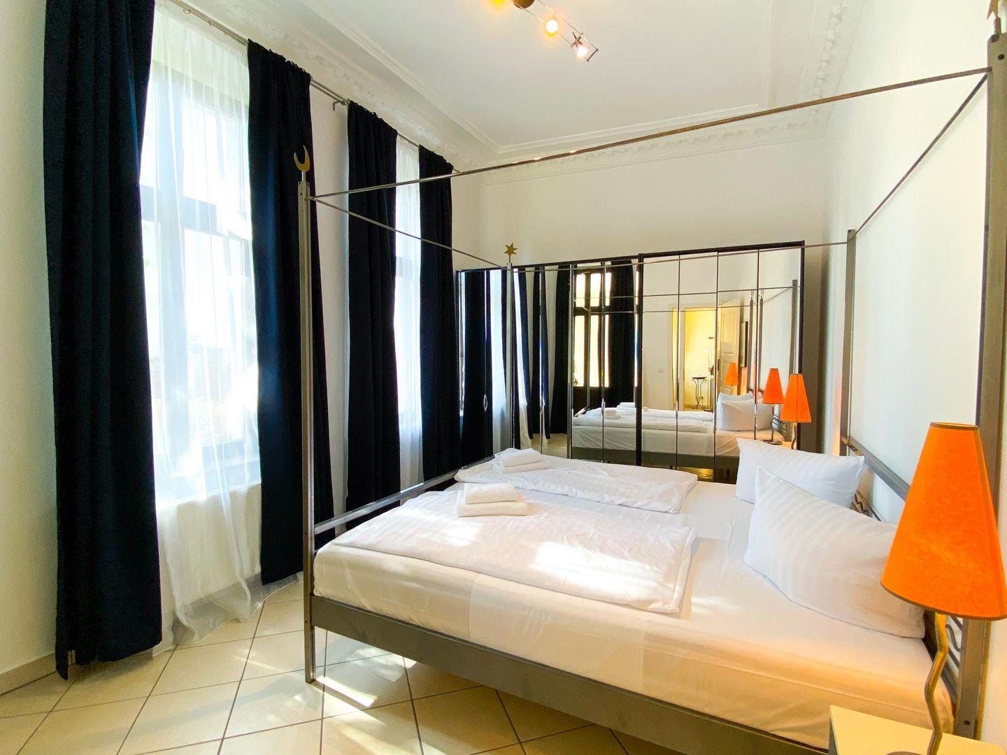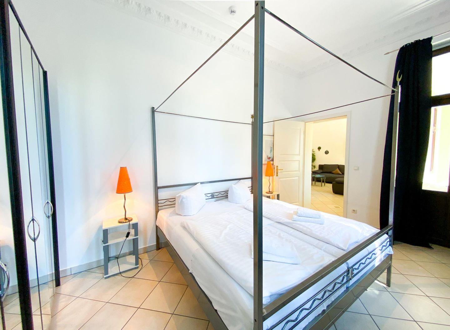 Himmlisch schlafen - das kann man in dem großen Doppelbett mit Baldachin im großzügigen separaten Schlafzimmer. Weitere Schlafmöglichkeiten gibt es im Wohnzimmer, hier können zwei separate Sofas zu bequemen Schlafstätten umgewandelt werden.
