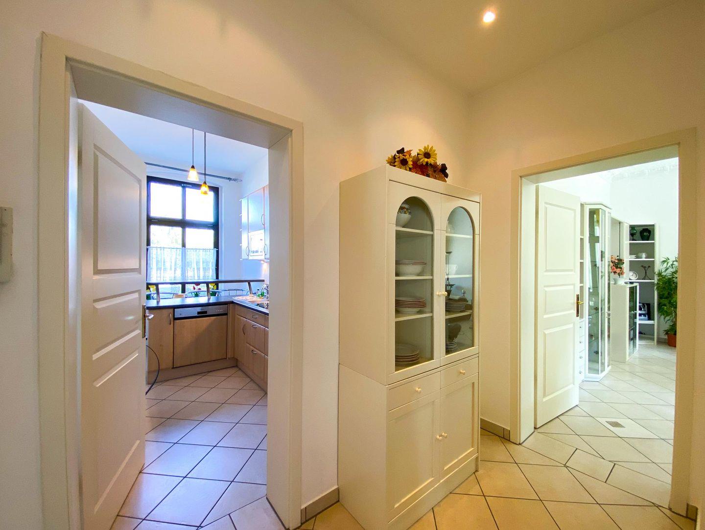 In der gemütlichen separaten Küche lässt es sich herrlich kochen, ohne die Miturlauber zu stören. Für helfende Hände gibt es ein schönes Sitzplätzchen am Küchentresen. Hier kann auch die schnelle Mahlzeit eingenommen werden. Der Wohnbereich ist mit einer komfortablen Sitzecke sowie einem stilvollen Essplatz ausgestattet. Durch die großen Fenster kann viel Licht in die hohen Räume dringen.