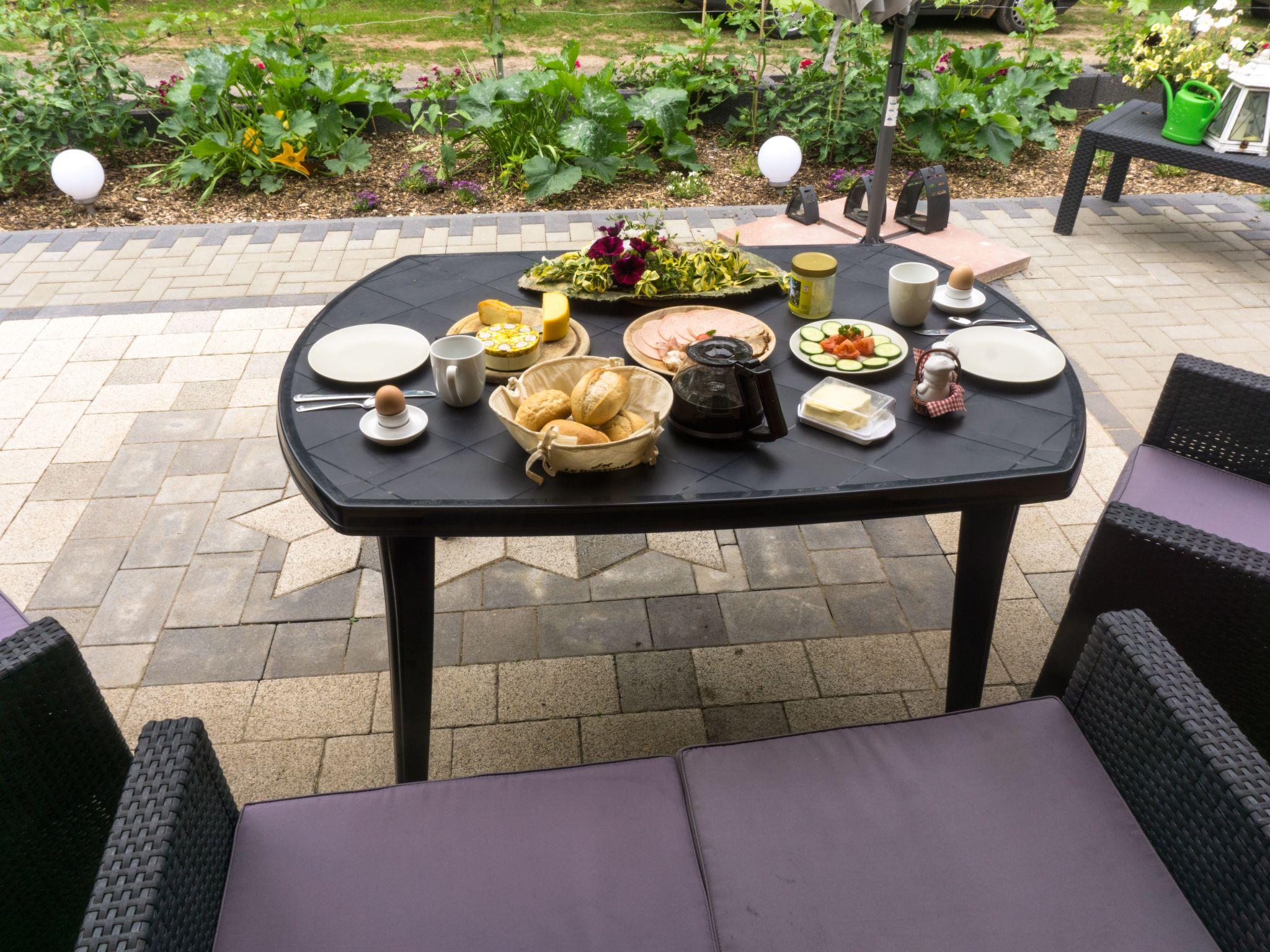 The outdoor area of the holiday home is a real highlight. A spacious terrace, equipped with garden furniture and a parasol, invites you to linger outdoors. The communal garden enriches your stay with a barbecue hut and plenty of space for pets, which are very welcome here. The entire property is fenced, which offers additional privacy and security. Free parking directly at the property rounds off the offer.