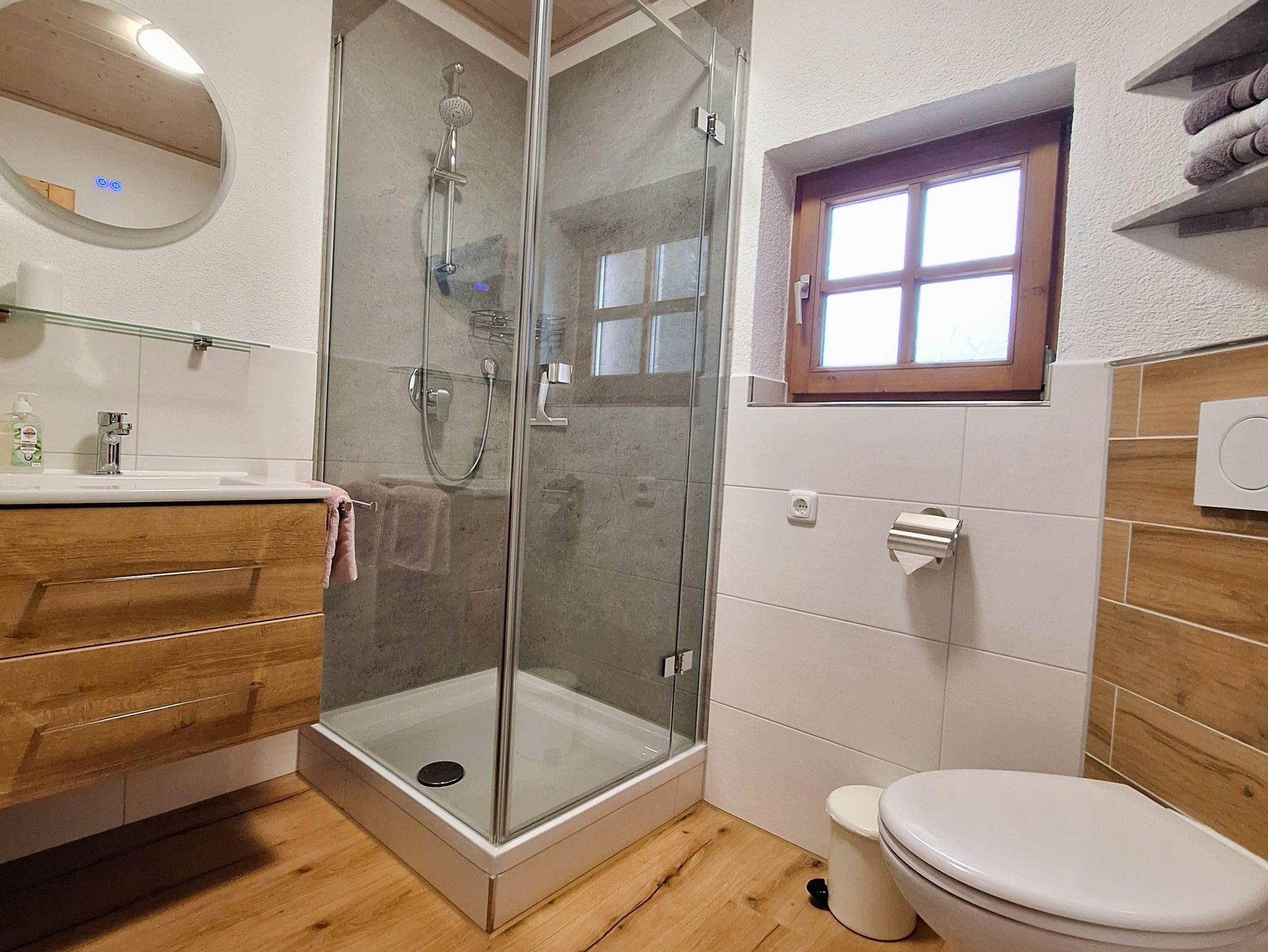 Badezimmer mit Toilette, Waschbecken und Dusche. Hand- und Duschtücher sind in gebuchter Personenzahl in der Wohnung.