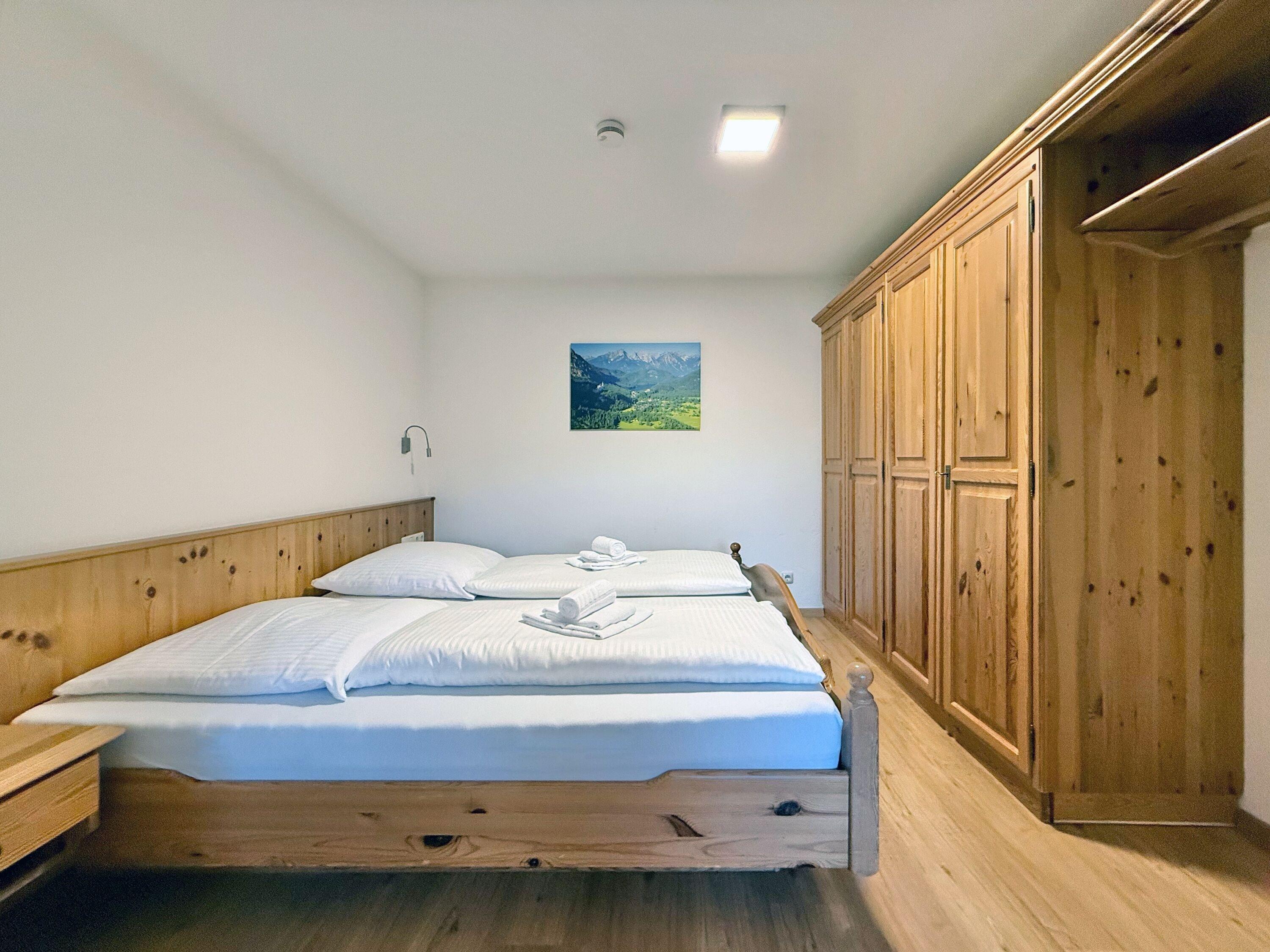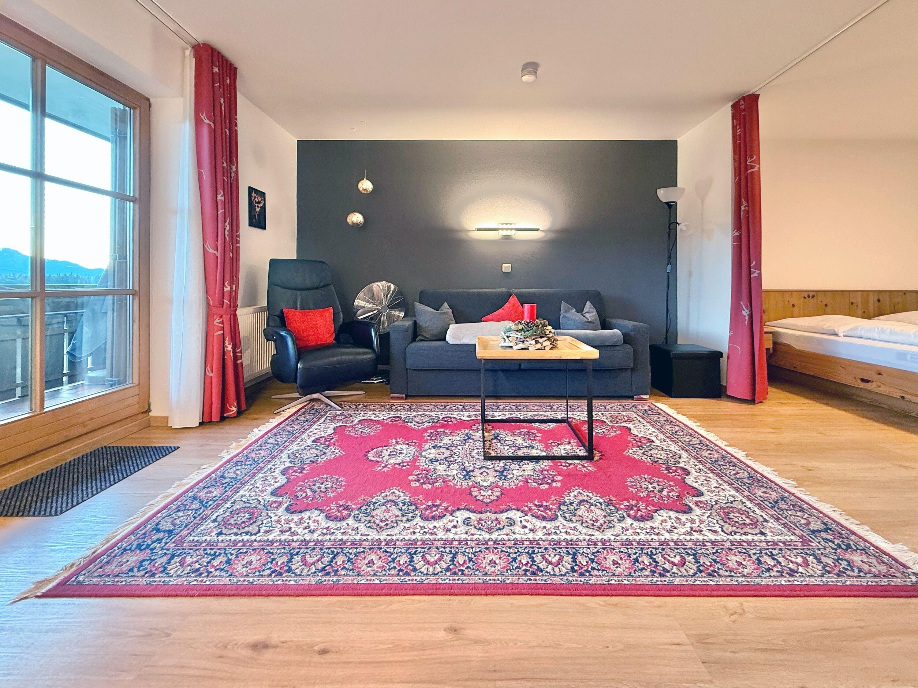Die Ferienwohnung verfügt über einen offen gestalteten Schlafbereich, einen gemütlichen Wohnbereich sowie ein modernes Badezimmer. Das komfortable Doppelbett sorgt für angenehmen Schlafkomfort. Vom Balkon aus genießen Sie entspannte Stunden an der frischen Allgäuer Luft und lassen den Tag ruhig ausklingen.