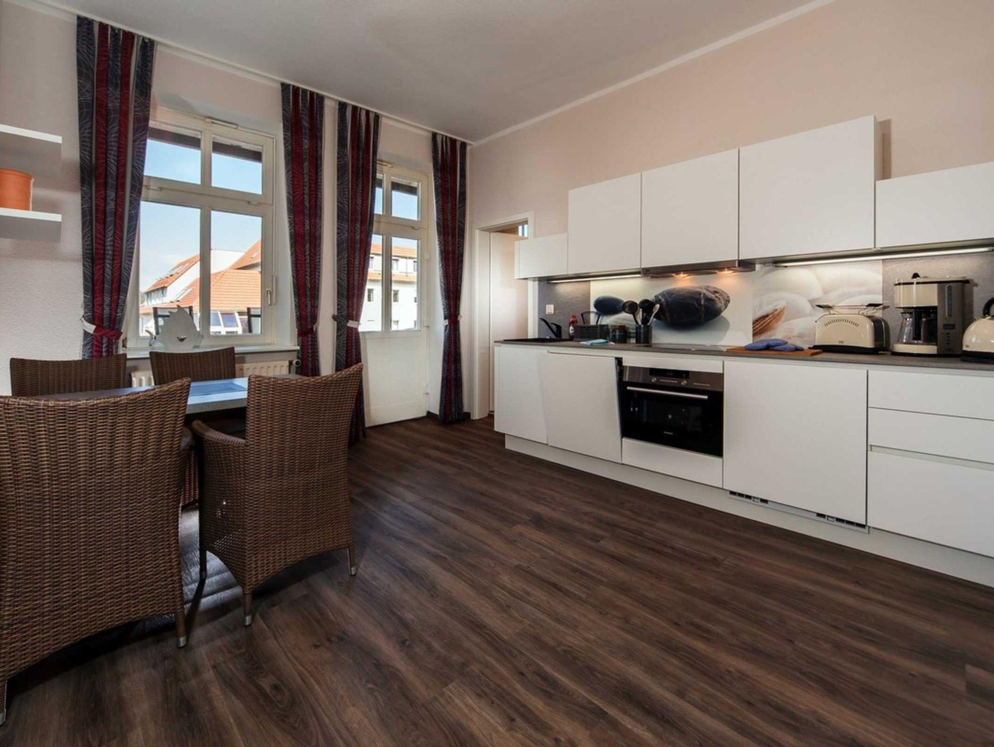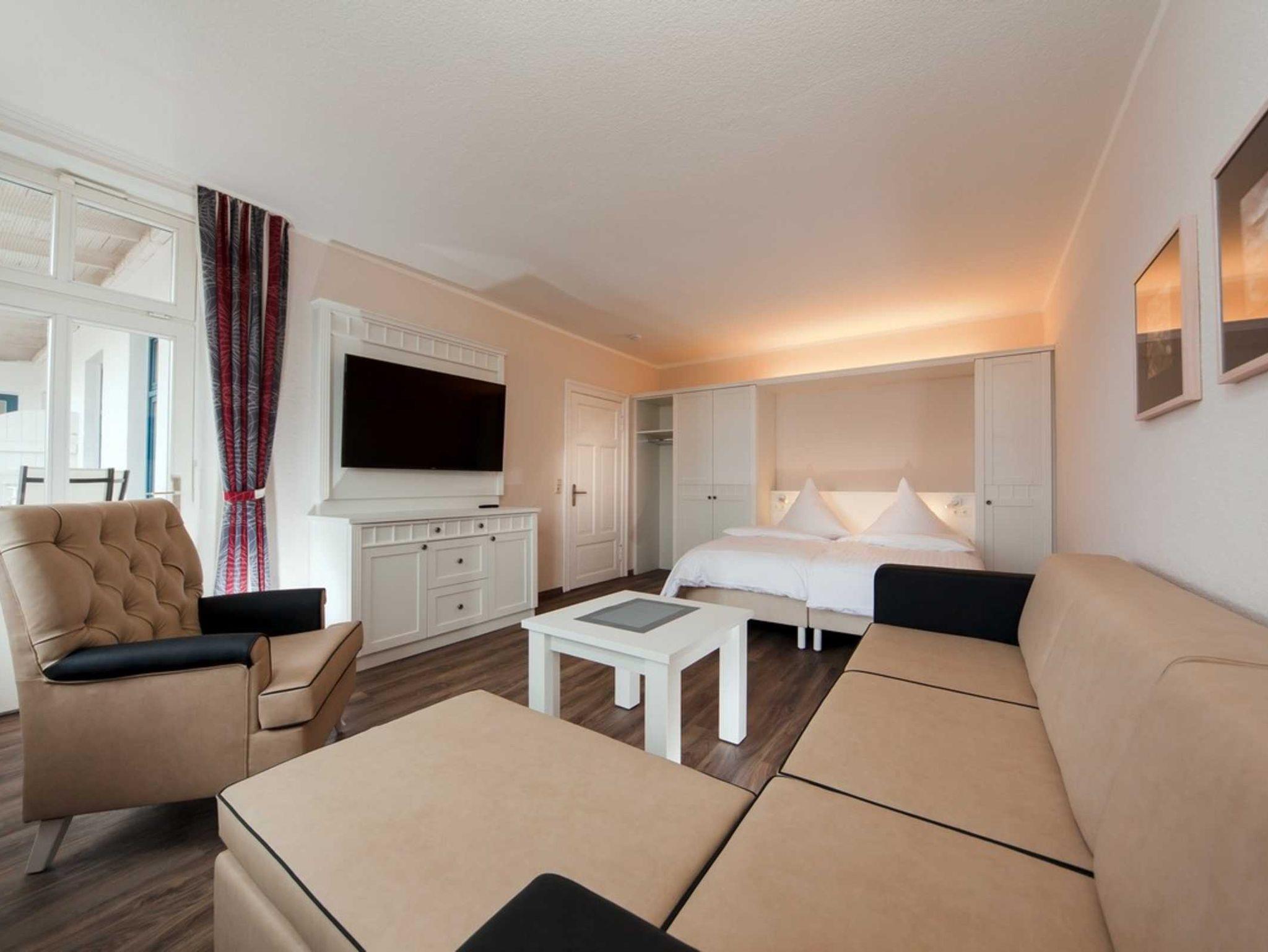 Genießen Sie das grosszügige Appartement mit Wohnküche sowie ein kombiniertes Wohn-Schlafzimmer mit Doppelbett. Auf der Schlafcouch finden 2 weitere Personen erholsamen Schlaf. Sowohl von der Küche, als auch vom Wohn-Schlafzimmer gelangen Sie auf den überdachten Balkon mit Blick auf die Kurstraße.