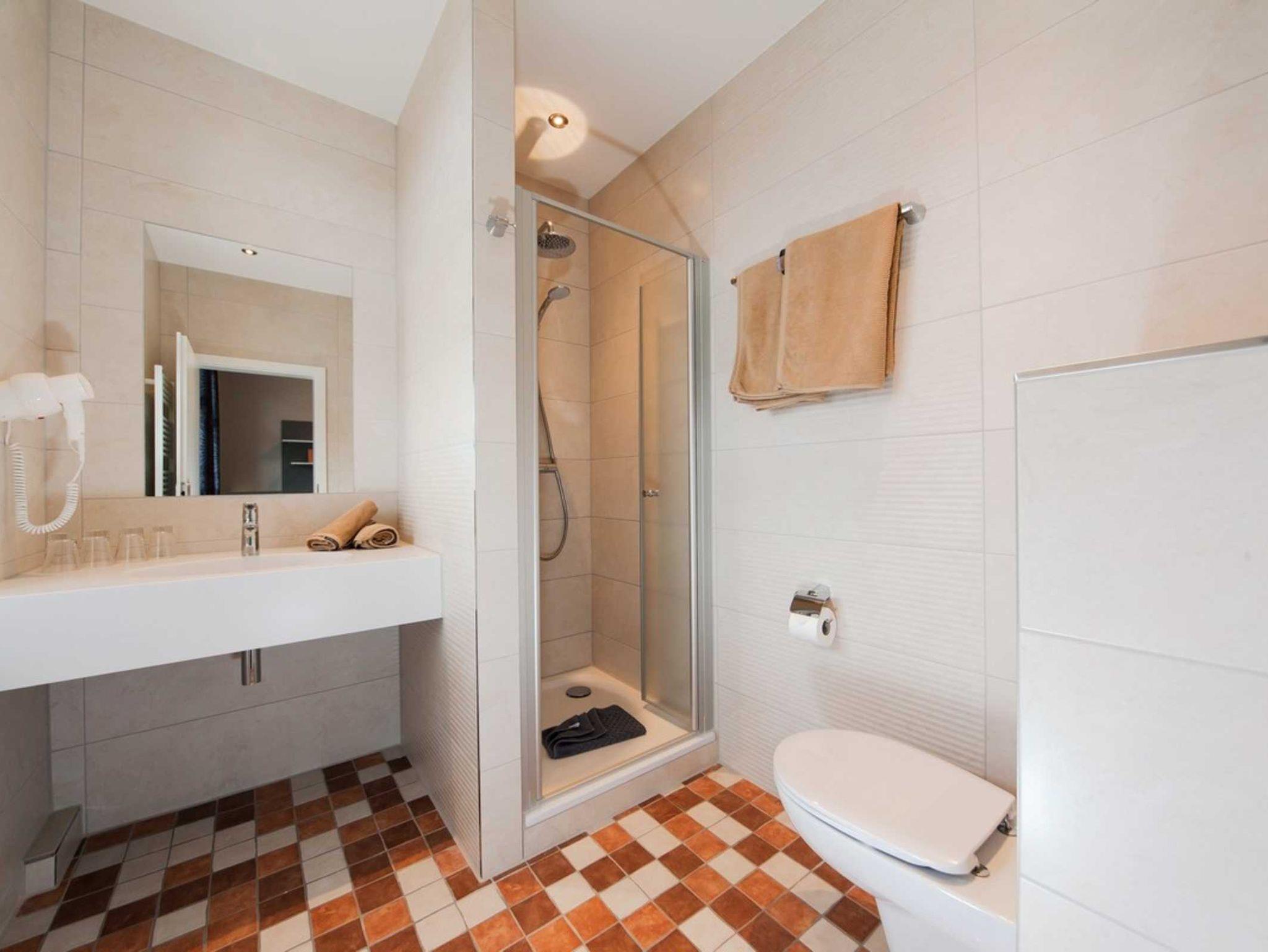 Das Badezimmer ist mit Dusche, Waschtisch, WC, Handtuchheizkörper und Föhn ausgestattet.