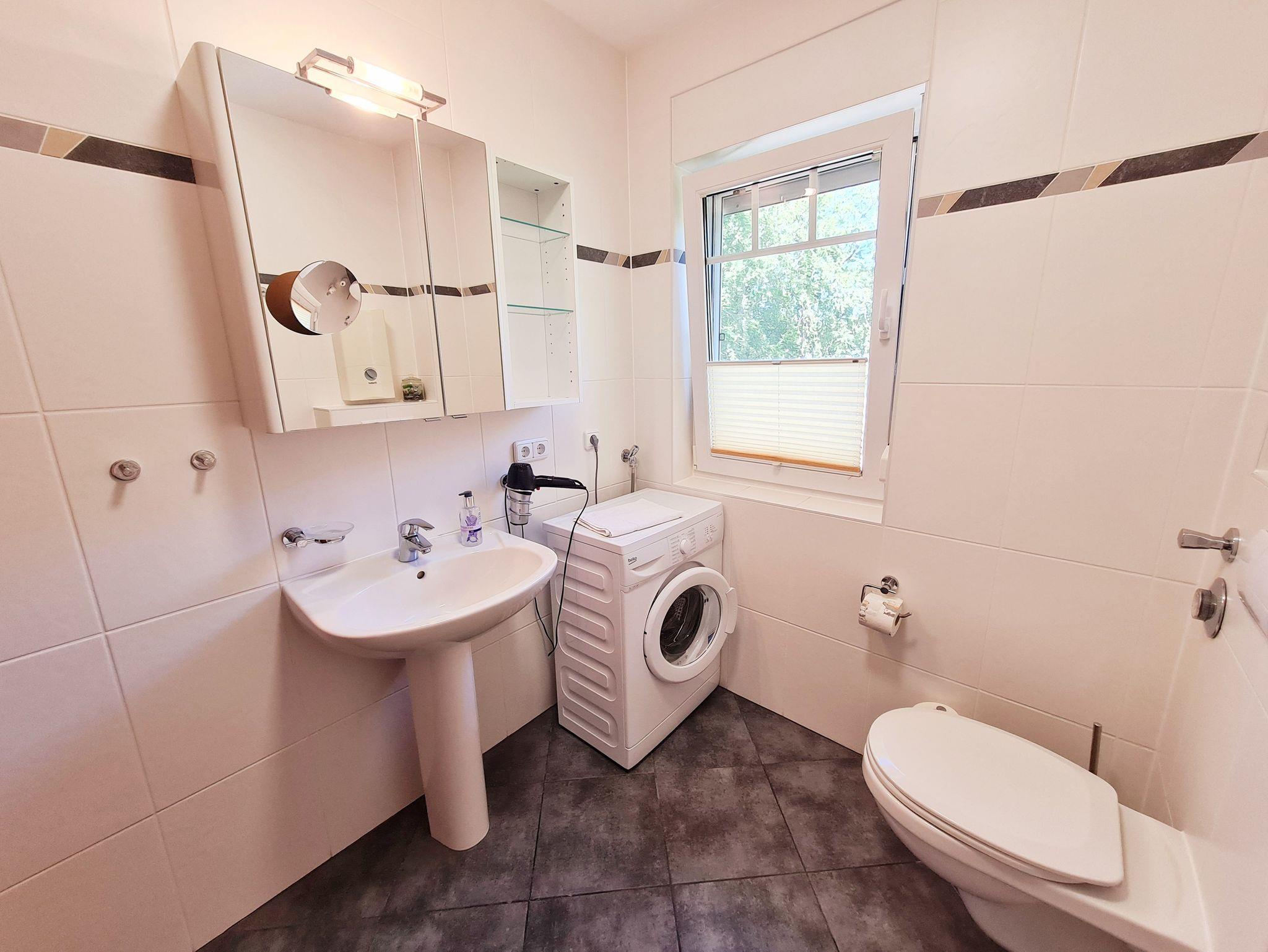 • Bad: mit Fenster, Echtglasdusche mit flachem Einstieg, Waschbecken, Toilette, Spiegelschrank, Handtuchhalter, Waschmaschine, Fön