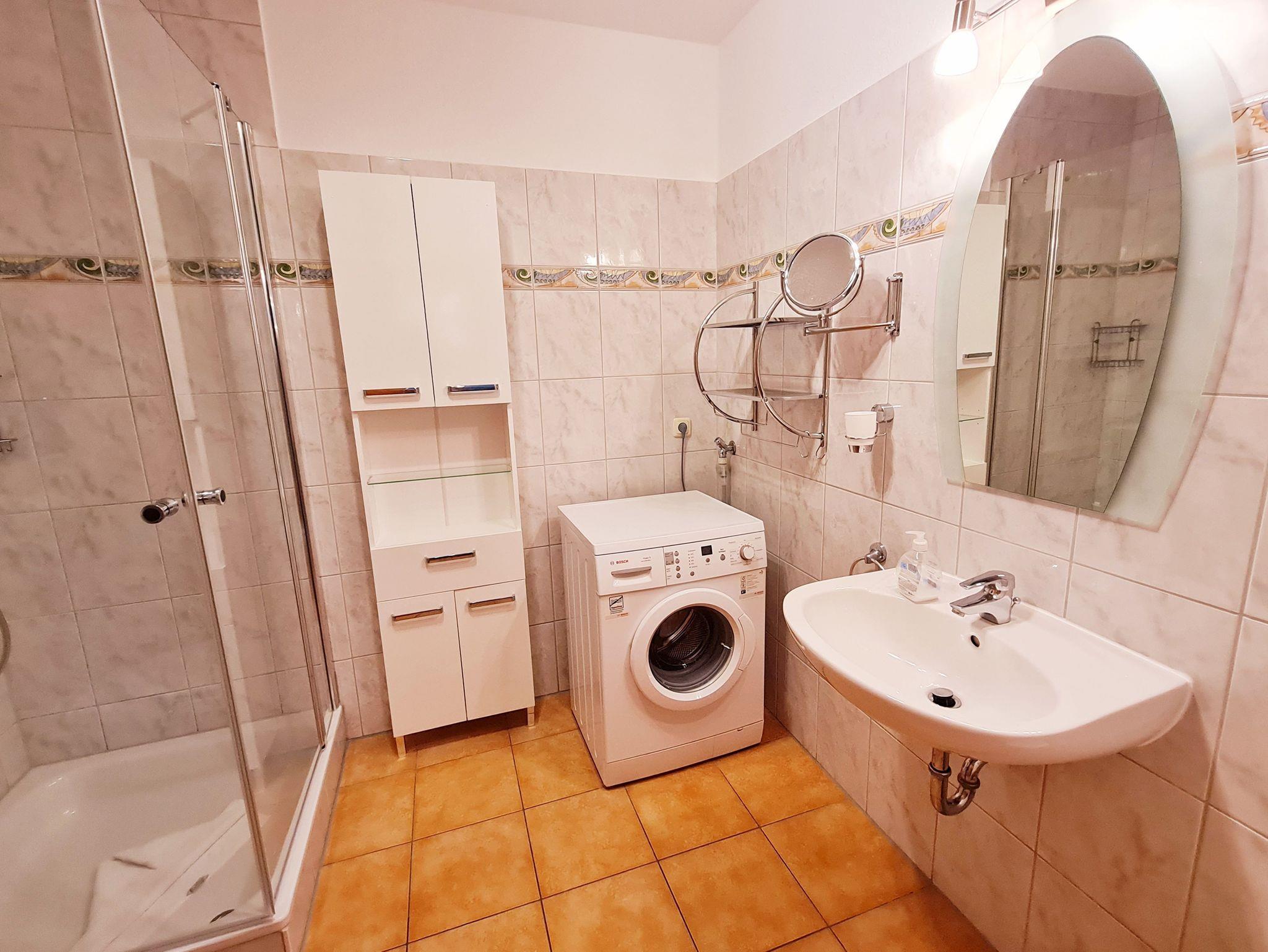 • Bad: ohne Fenster, Dusche, Waschbecken, Toilette, Spiegel, Schrank, Sitzhocker, Waschmaschine