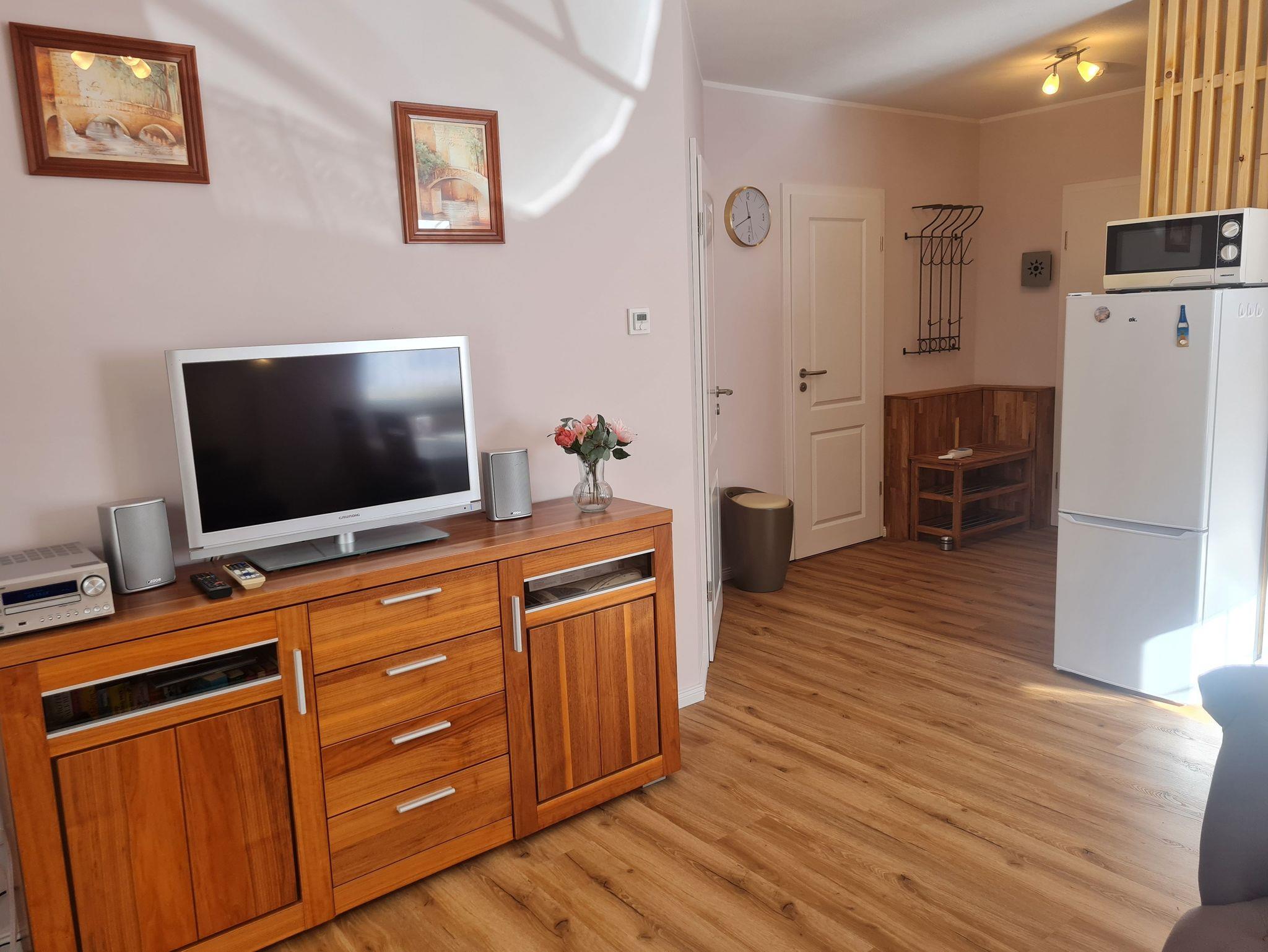 • Wohnzimmer: gemütliche Schlafcouch mit 150x200 m Liegefläche, Farb-TV, Sideboard, 2 Sessel, Tisch, Radio mit CD, Leselampe