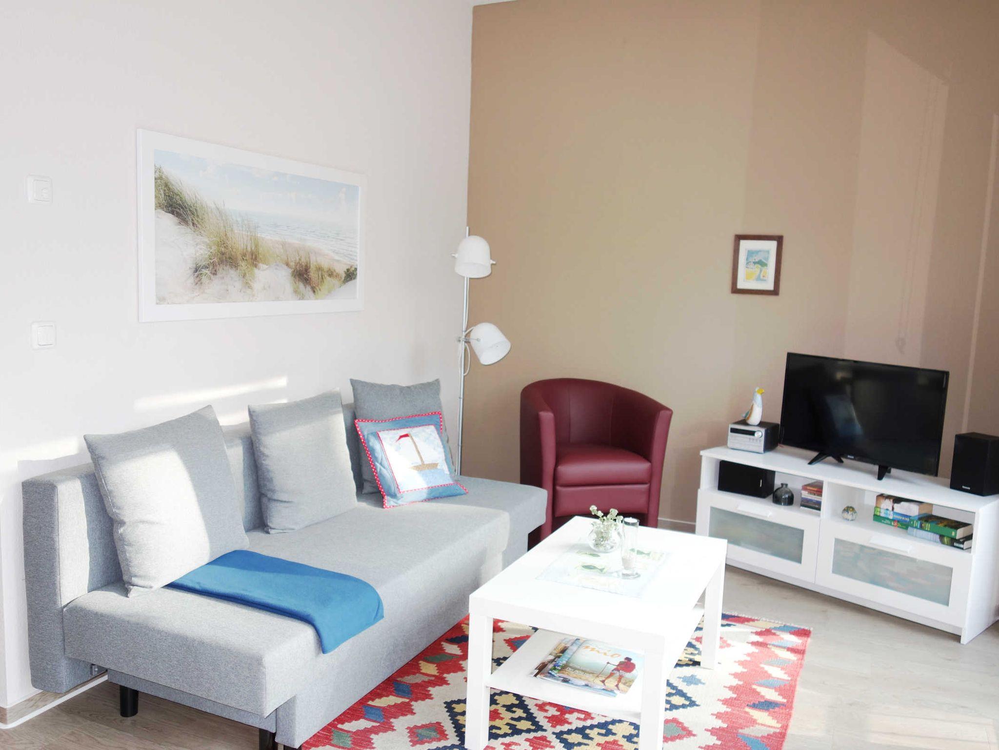 Das helle Wohnzimmer verfügt über eine Couch und einen Flachbildfernseher sowie über ein Radio mit integriertem CD-Player.