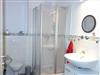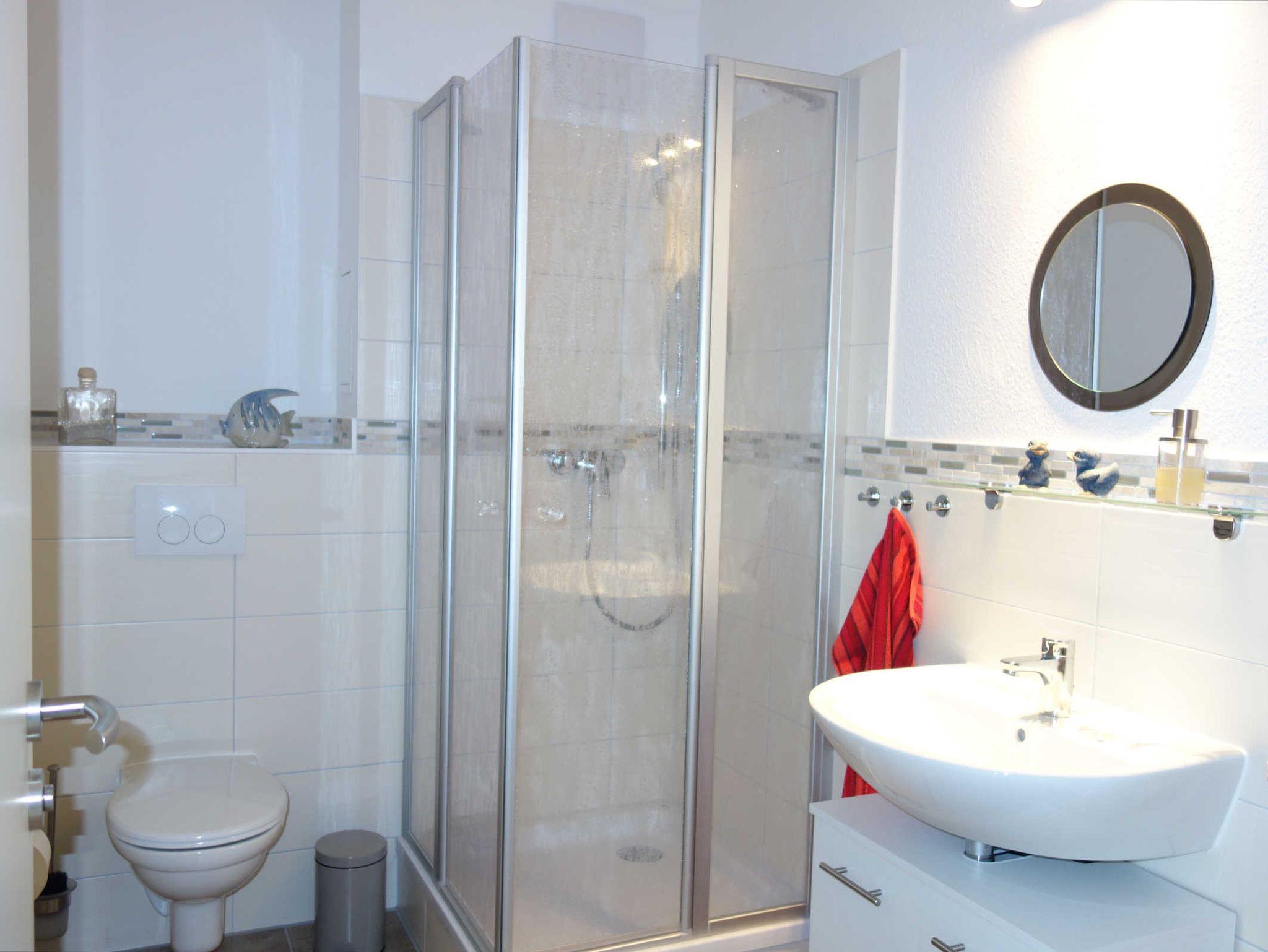 Im Bad sind die Dusche, das WC, ein Waschtisch und ein Badregal.