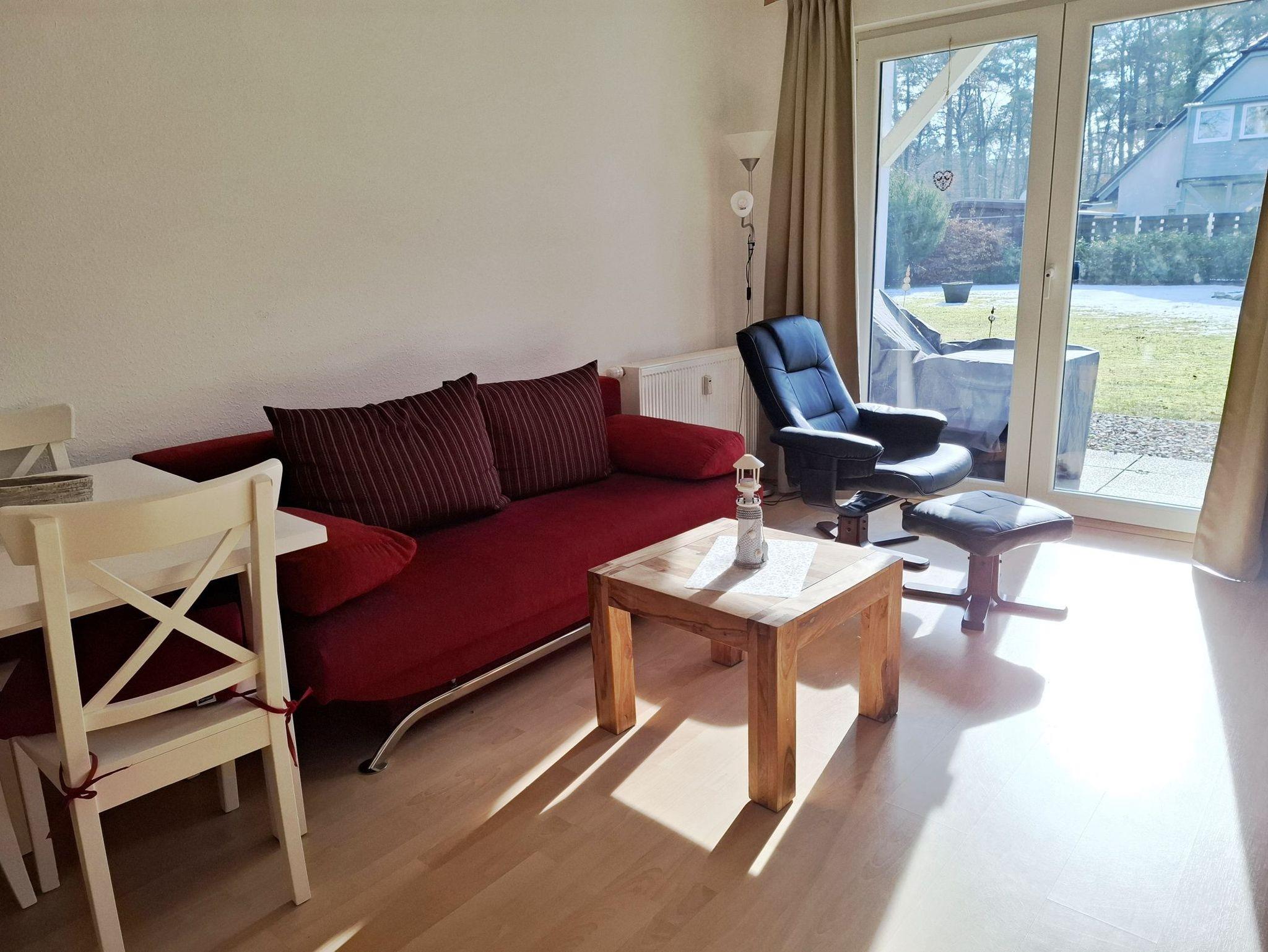 Diese 2-Zimmer-Erdgeschoss Wohnung im Haus Waldkauz lädt Sie zu einem Traum-Urlaub für bis zu 3 Personen ein. Im geräumigen Wohnzimmer befinden sich eine Couch und ein Fernseher. Die offene Küche verfügt über einen Kühlschrank mit Gefrierfach, einen Geschirrspüler, eine Mikrowelle, einen Backofen, ein Cerankochfeld (4 Platten), eine Kaffeemaschine und einen Wasserkocher. Im Schlafzimmer befinden sich ein Doppelbett mit 2 einzelnen Matratzen (je 90 cm x 200 cm), ein Einzelbett (90 cm x 200 cm) sowie ein Kleiderschrank. Im Bad befinden sich das WC, eine Waschmaschine und eine Dusche. Das Schmuckstück dieser schönen Unterkunft ist die große Sonnen-Terrasse, auf welcher Sie so manche sonnige Stunden verbringen können. Zudem können Sie eine Gemeinschafts-Münz-Sauna für noch mehr Entspannung und einen Grillplatz mit benutzen. Ihr Auto parken Sie direkt neben dem Haus.
