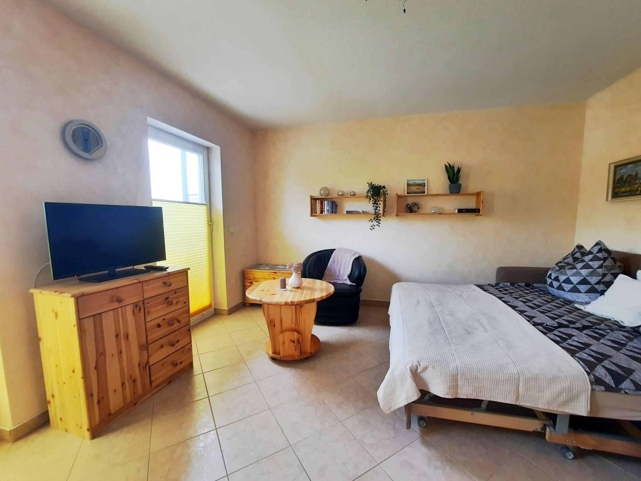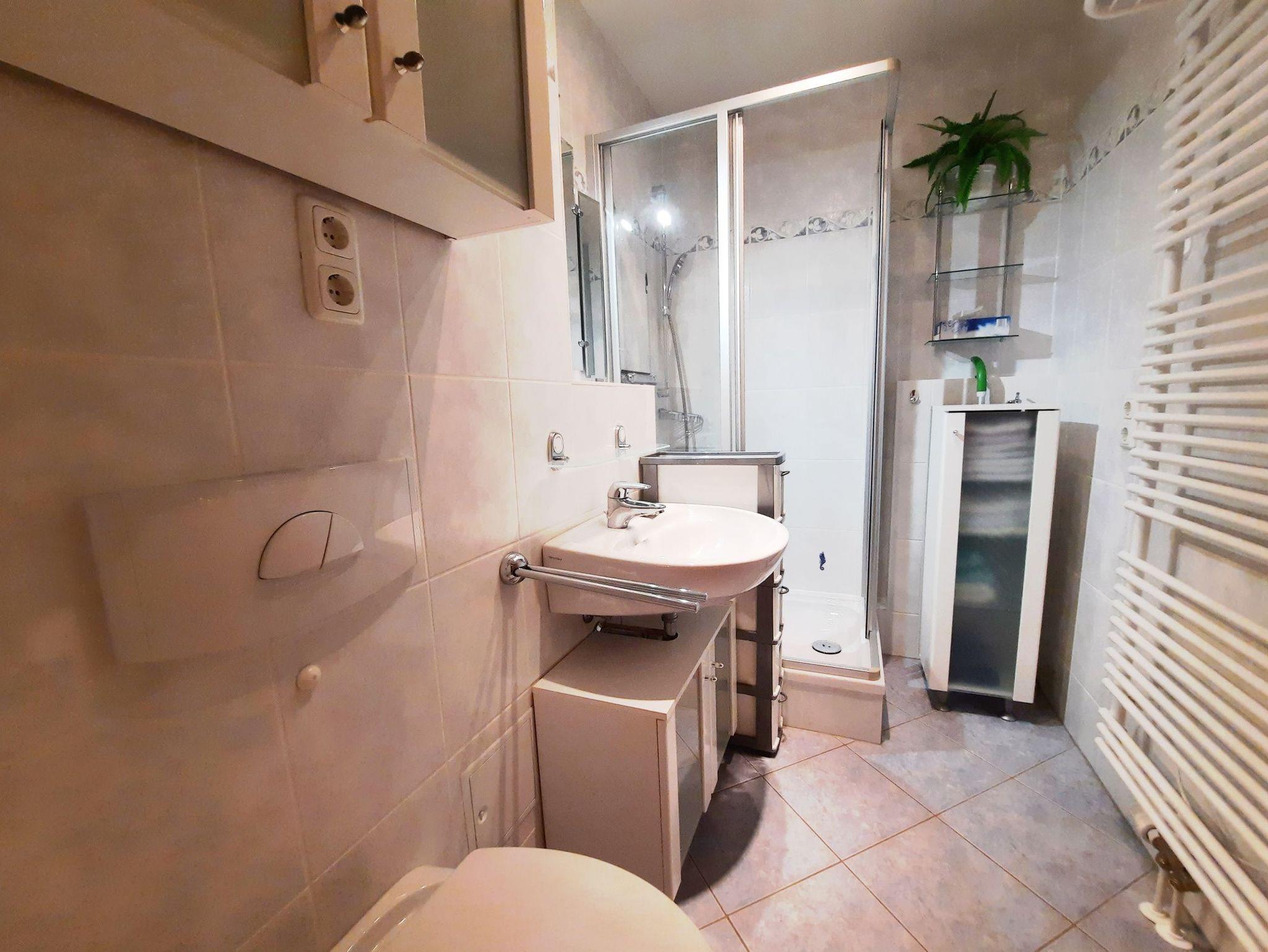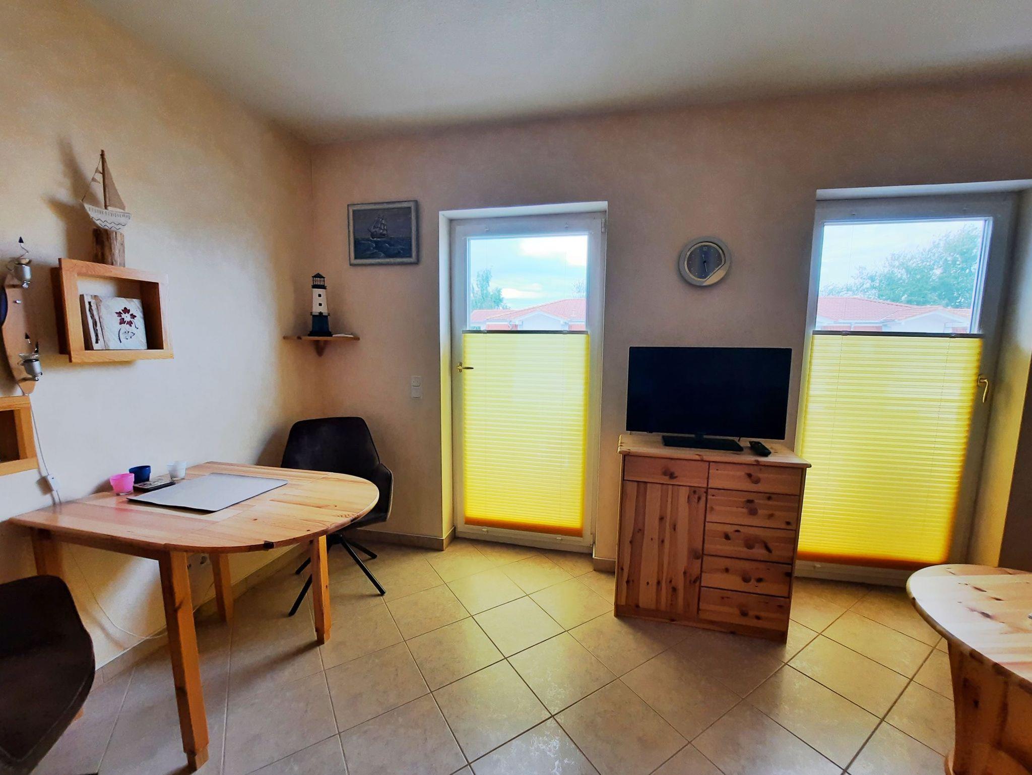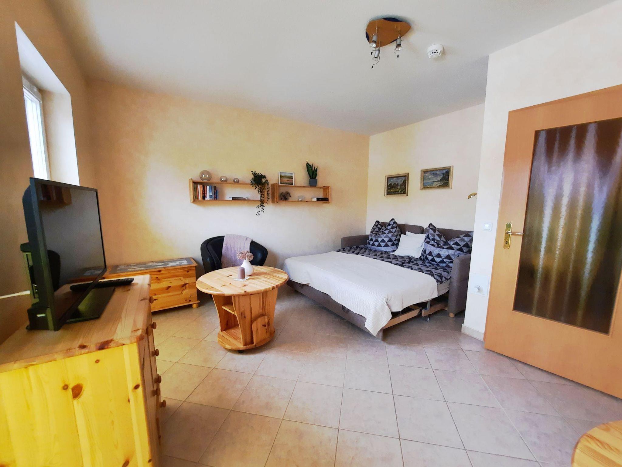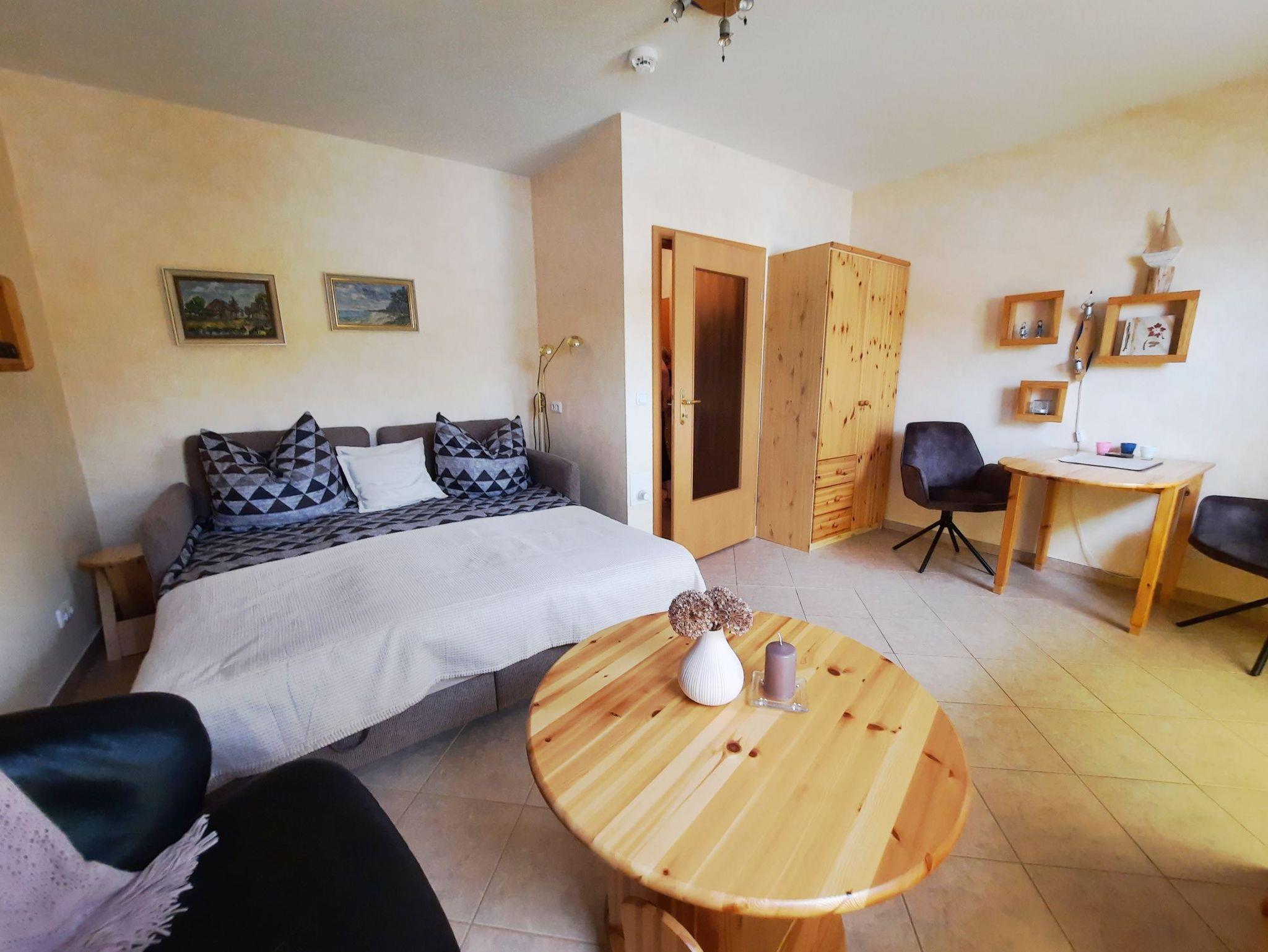 Diese schöne, praktisch eingerichtete Ferienwohnung für 2 Personen ist der ideale Ausgangspunkt für Ihre Urlaubsunternehmungen in und um Graal-Müritz. Der kombinierte Wohn- und Schlafbereich empfängt Sie mit einer Schlafcouch, 2 Sitzmöglichkeiten und einem Fernseher. Von hier aus gelangen Sie zum großen Balkon mit Gartenmöbeln. Die kleine Pantryküche ist mit 2 Kochfeldern, einer Mikrowelle, einer Kaffeemaschine und einem Wasserkocher ausgestattet. Das Bad ist mit einer Dusche und einer Handtuchheizung ausgestattet. Die gesamte Ferienwohnung verfügt über Plissees und elektrischen Rollläden. Zur Wohnung gehört ein PKW-Stellplatz vor dem Haus.