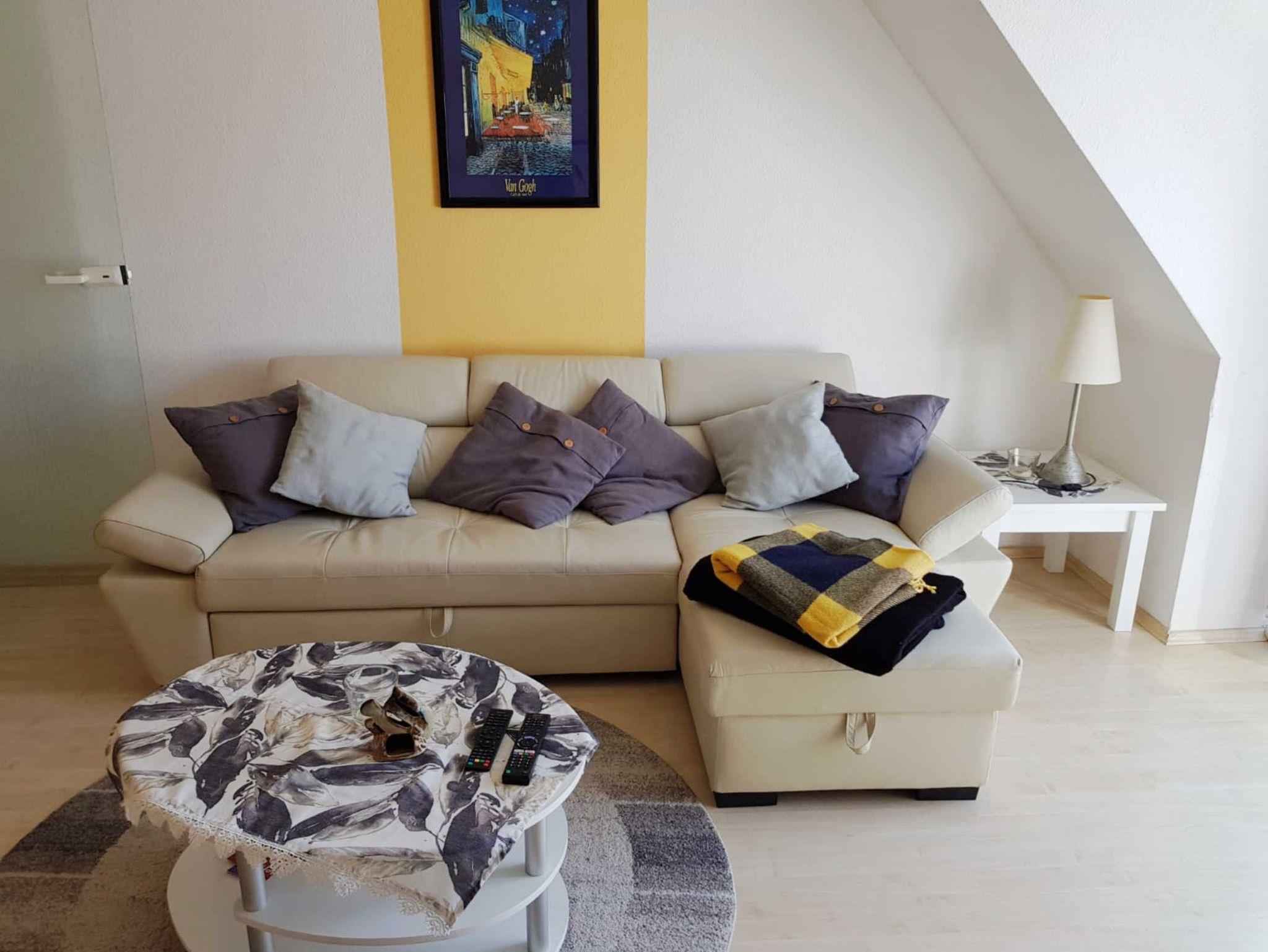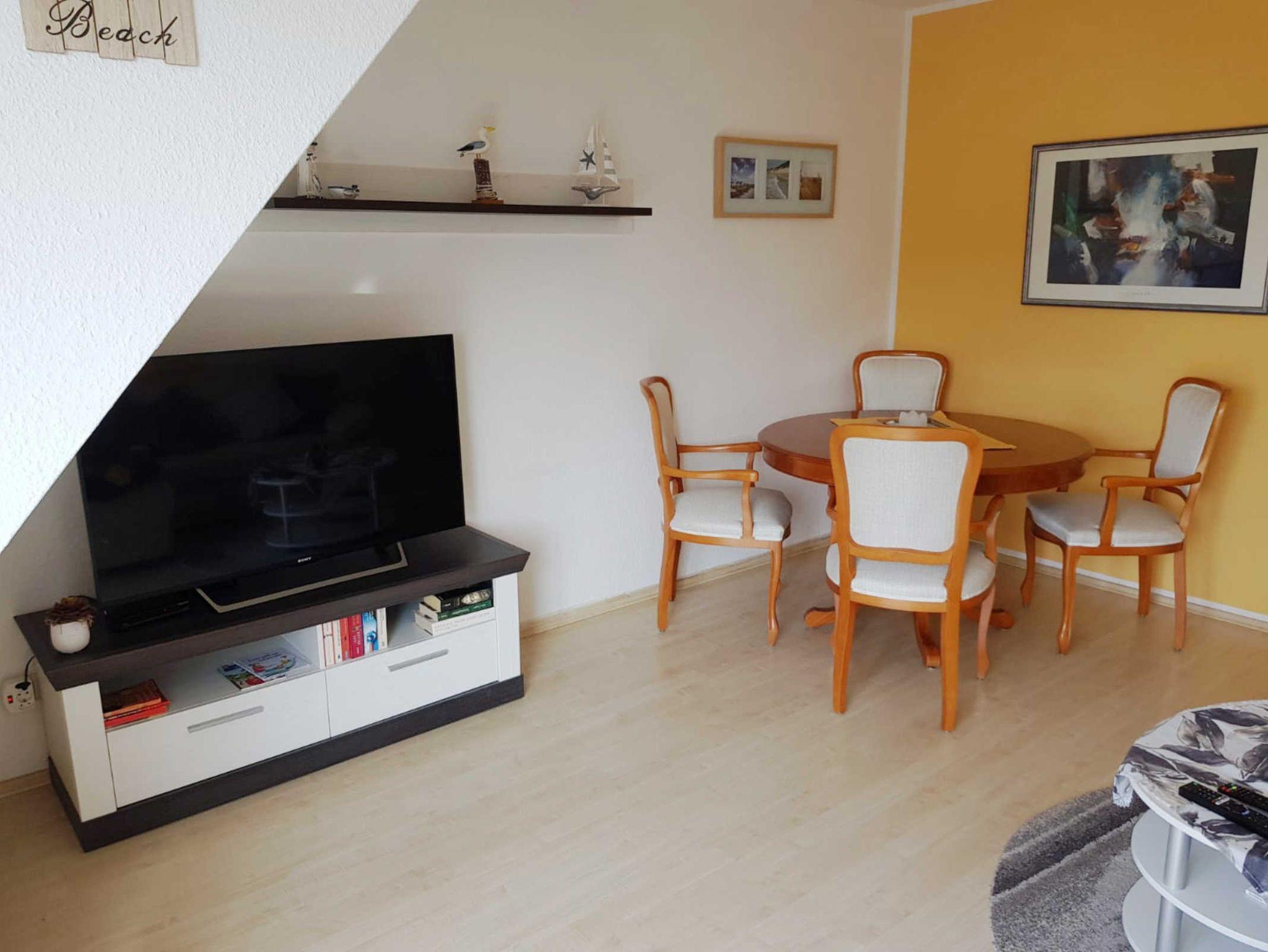 Das Wohnzimmer ist mit einer Schlafcouch, einer Essecke mit einem Tisch und 4 Stühlen sowie einem Radio und einem Fernseher ausgestattet.