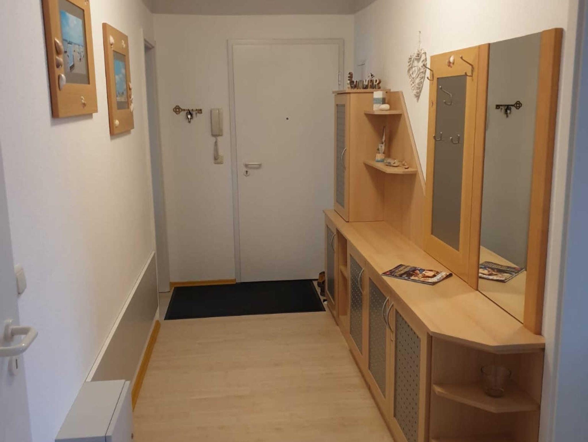 2 Zimmer Ferienwohnung in der Kastanienallee mit einem Wohnzimmer mit Couch und Fernseher, ein Bad mit einer Dusche und einem WC, eine Küche mit einem Backofen und einem Kühlschrank, ein Schlafzimmer mit einem Doppelbett. Zu der Ferienwohnung gehören ein Balkon und ein PKW-Stellplatz.