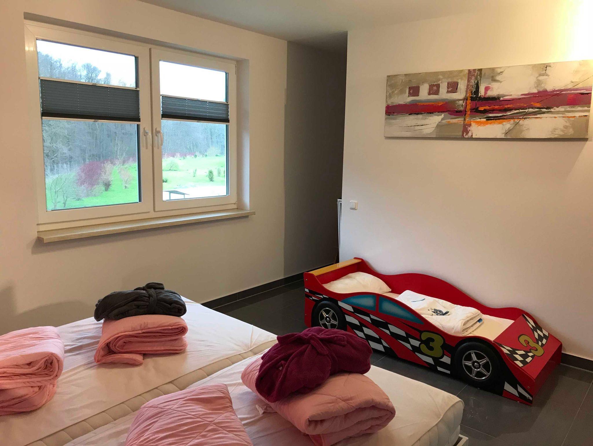 Die ca. 87 qm große Maisonette-Ferienwohung bietet auf der 1. Ebene einen großzügigen offenen Eingangsbereich, Dusche mit Fenster, Gäste-WC, Hauptschlafzimmer mit Doppelbett (180x200) und ein separates festes Kinderbett als Rennwagen. Der Schlafbereich ist zum Waldgebiet ausgerichtet, hier gibt es zu keiner Zeit Straßenlärm.
