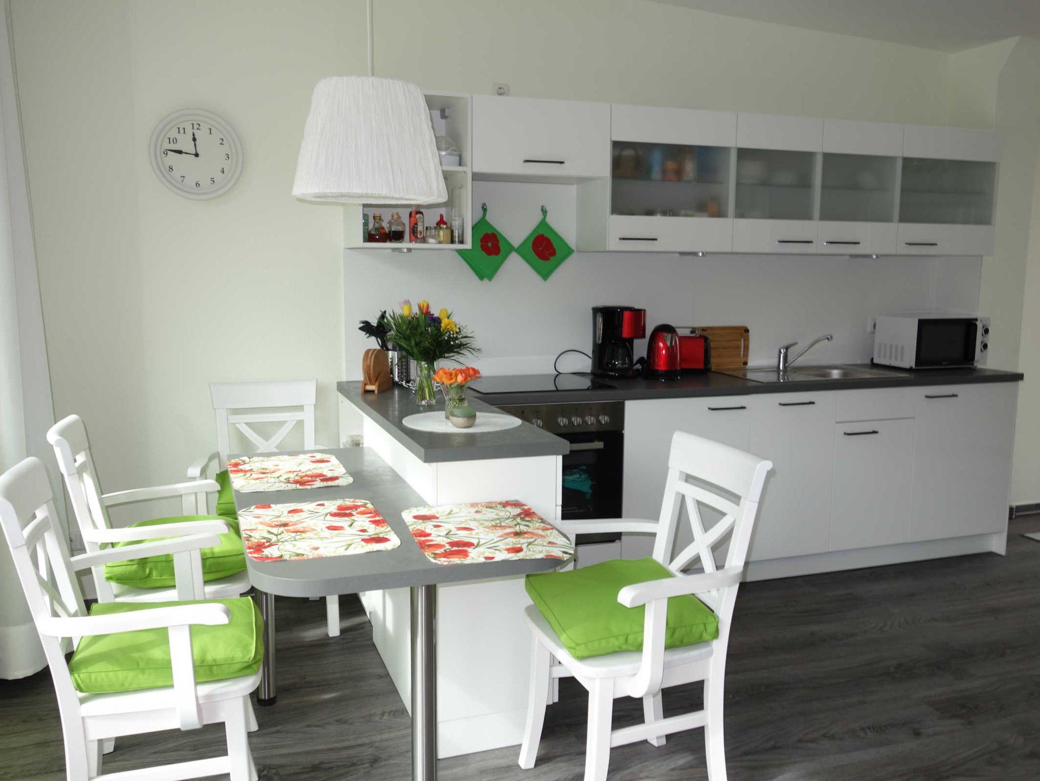 ? Küche mit 4 Ceranfeldern und Backofen, Spülmaschine, Toaster, Kaffeemaschine, Wasserkocher, Mikrowelle mit Grillfunktion, Eierkocher und Kühlschrank mit 3-Sterne-Gefrierfach