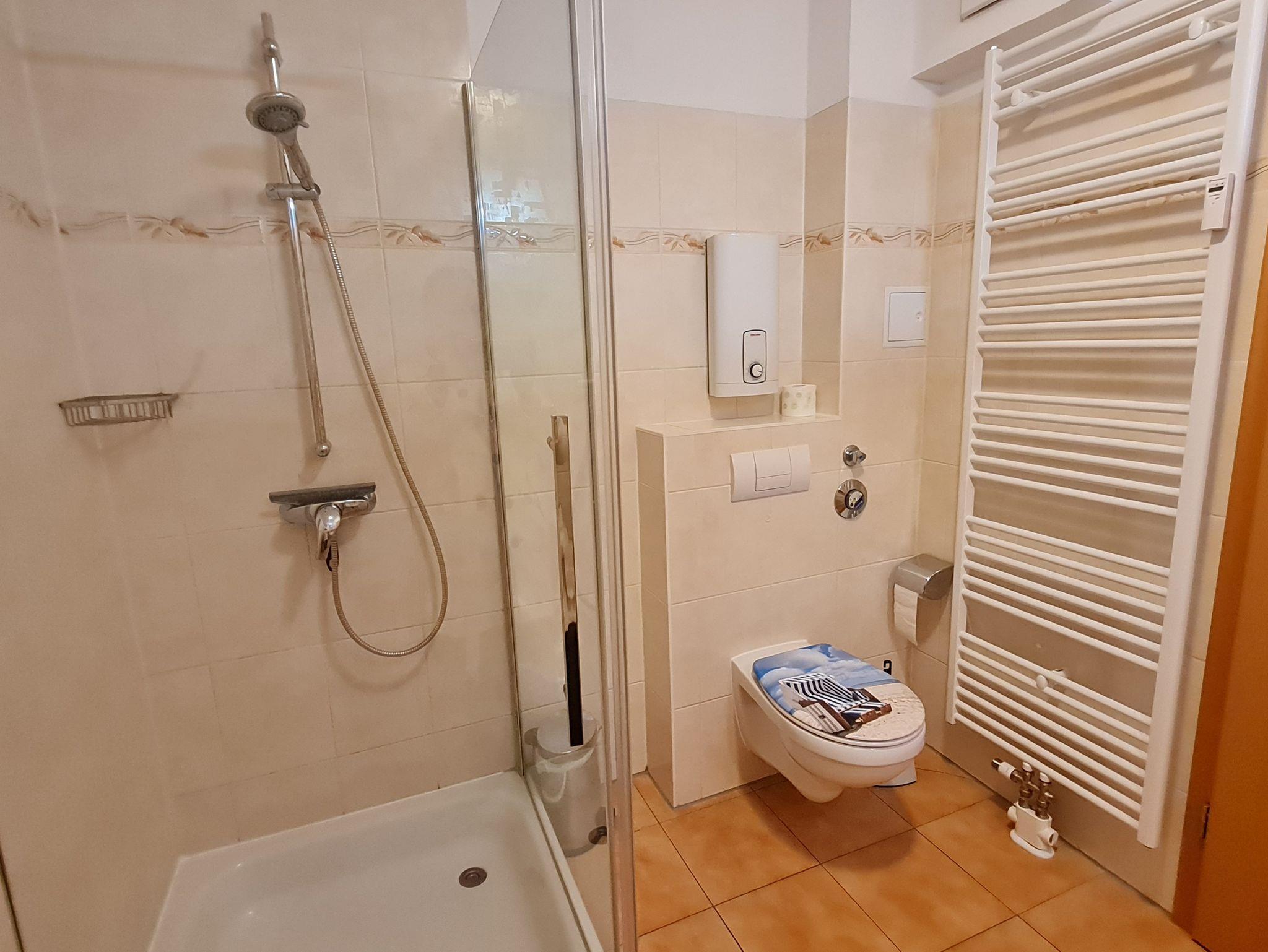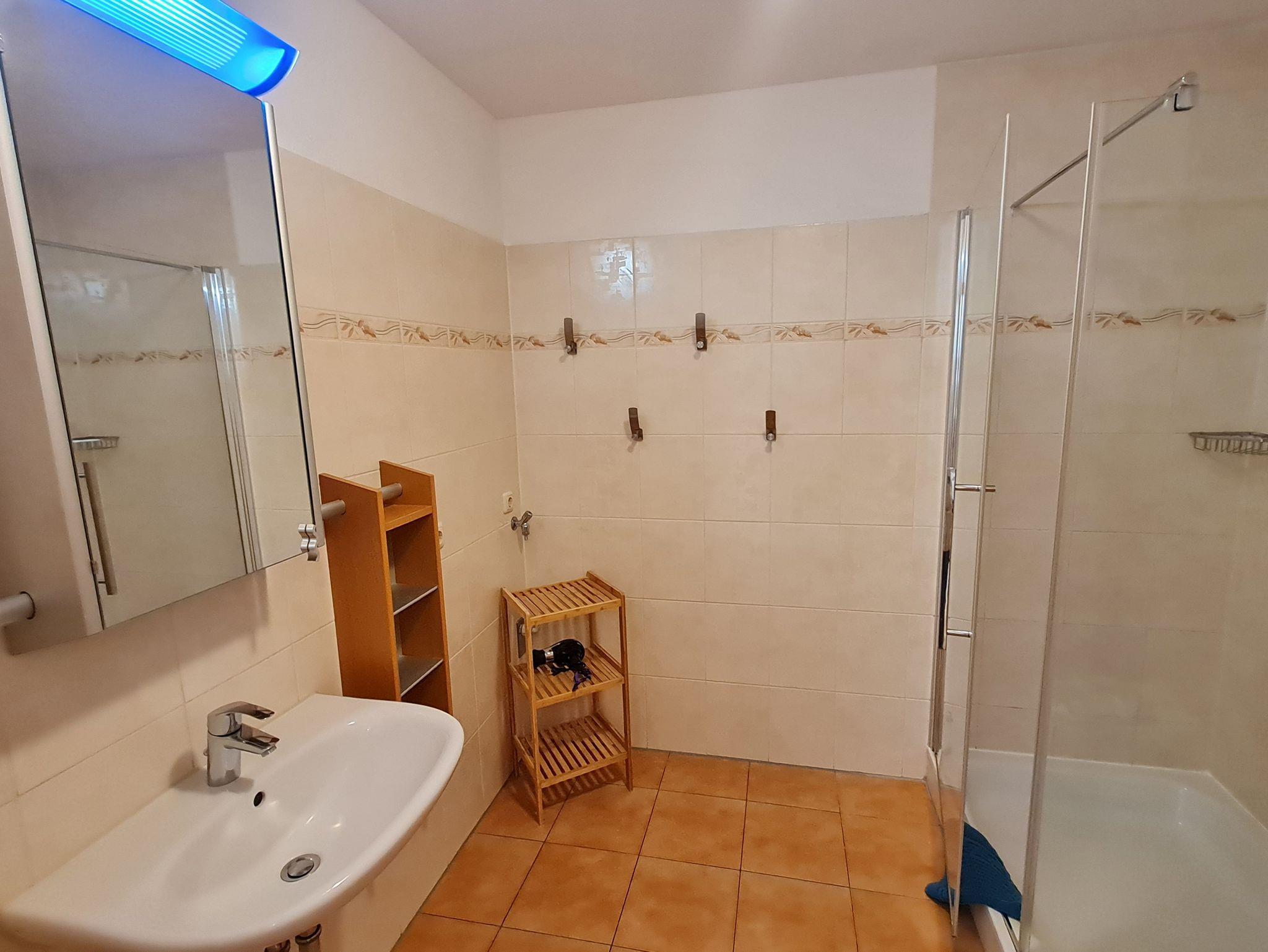 • Bad: ohne Fenster, Dusche, Waschbecken, Toilette, Spiegelschrank mit Ablagemöglichkeiten, Regal, Handtuchhaken