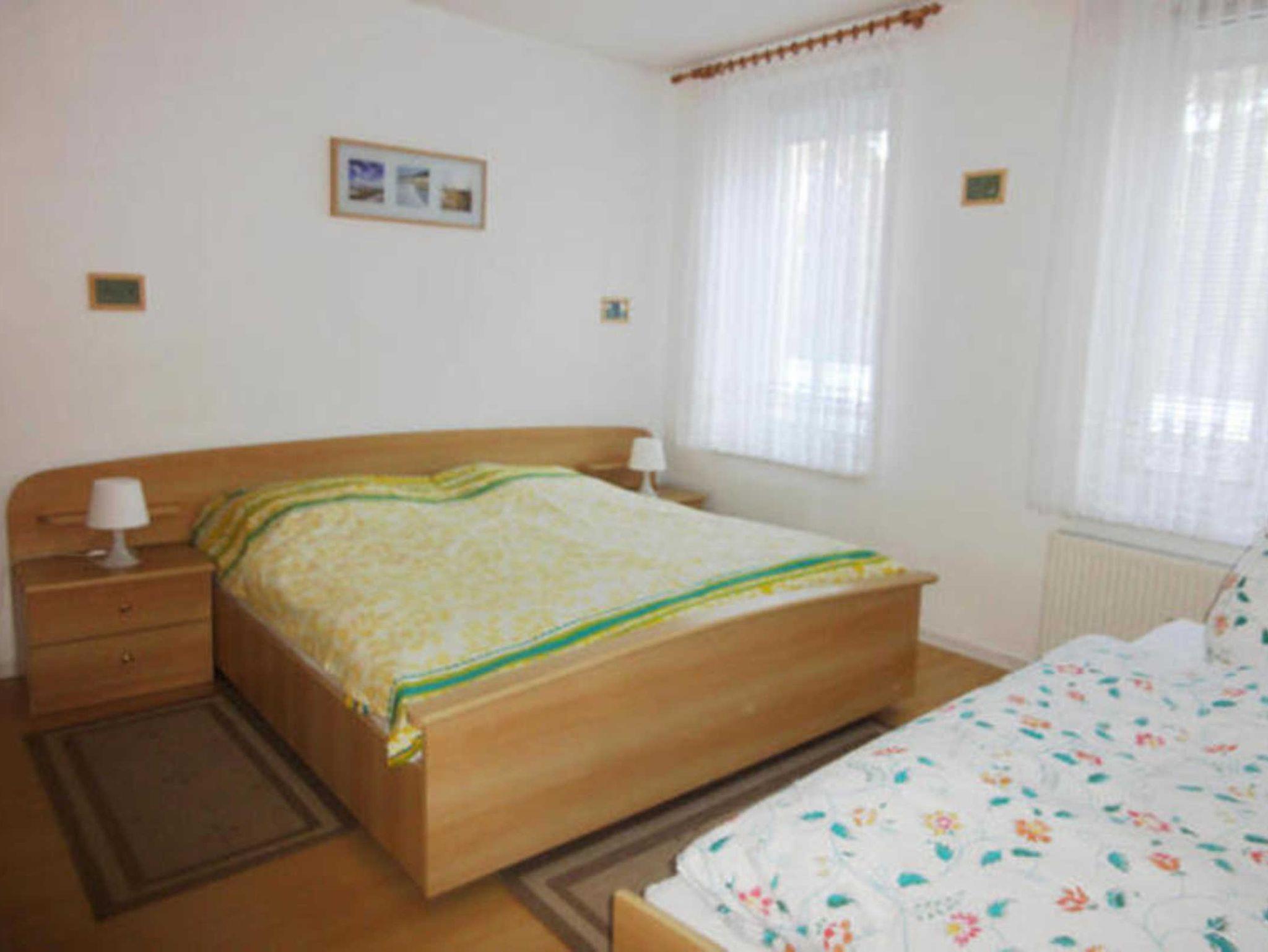 Das Schlafzimmer verfügt über ein Doppel- und ein Einzelbett sowie über einen Kleiderschrank.