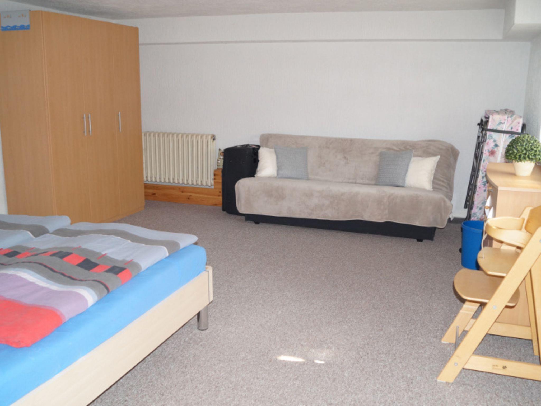 Das Bad mit Fenster ist gefliest und verfügt über ein Waschbecken, ein WC und eine Badewanne. Das Schlafzimmer ist ausgestattet mit einem Doppelbett, einem Sideboard, einer Schlafcouch (als Aufbettung nutzbar) und einem Kleiderschrank. Hier ist auch genügend Platz für die Aufstellung des Babyreisebettes.