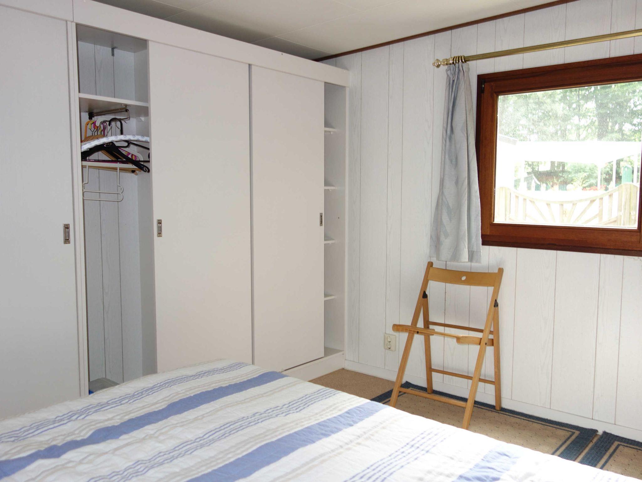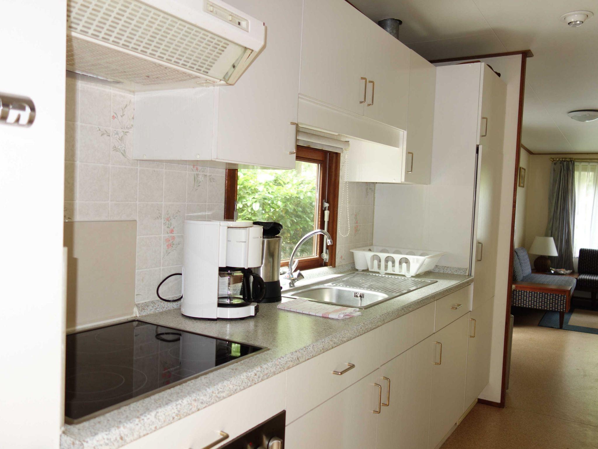 Im Ferienhaus befinden sich 2 kleine Schlafzimmer (eines mit frz. Bett, eines mit Etagenbett), ein Wohnzimmer mit Couch und Fernseher, ein Bad mit Dusche und WC, ein Esszimmer mit Esstisch und Stühle und eine Miniküche mit Kühlschrank.