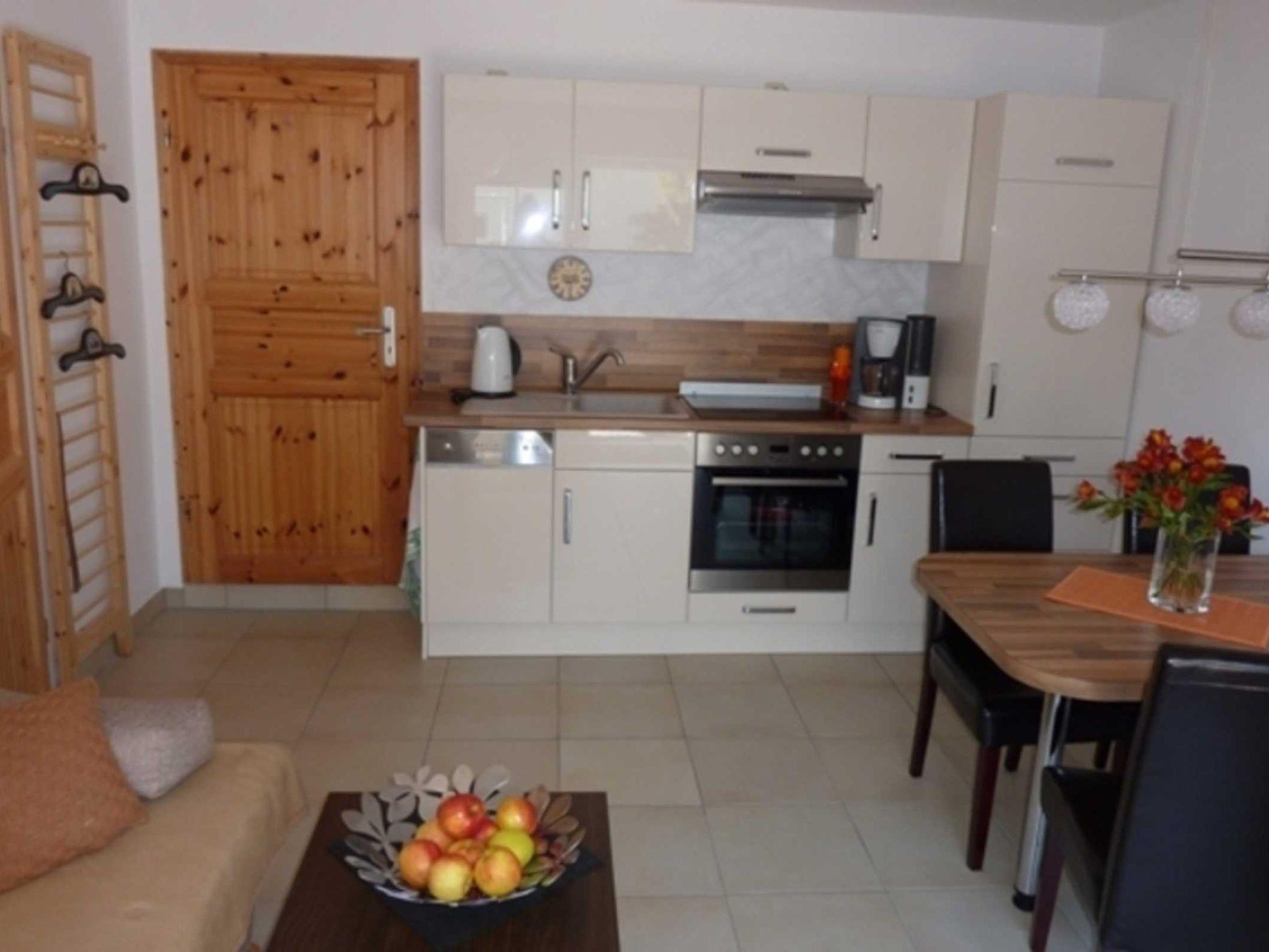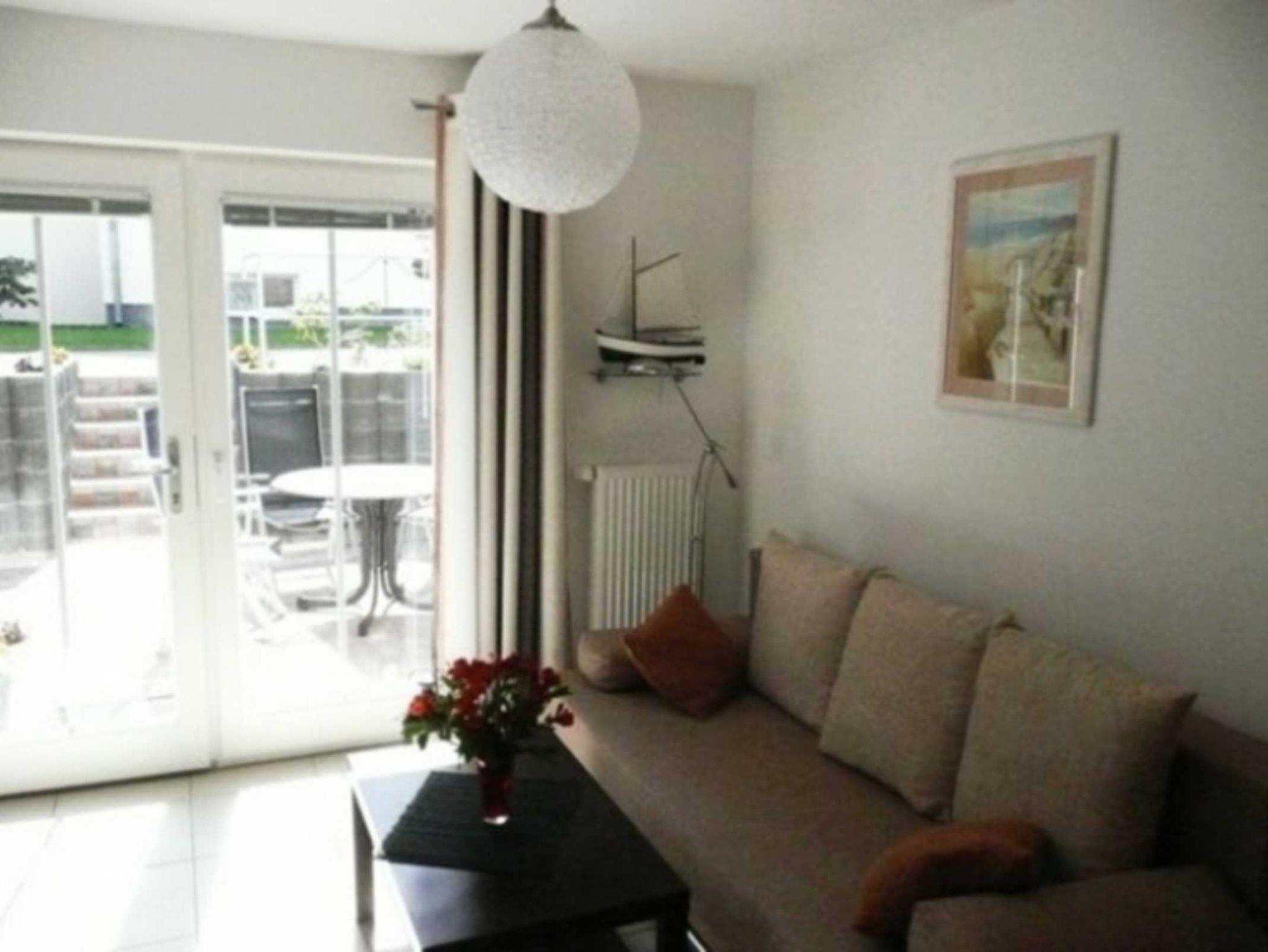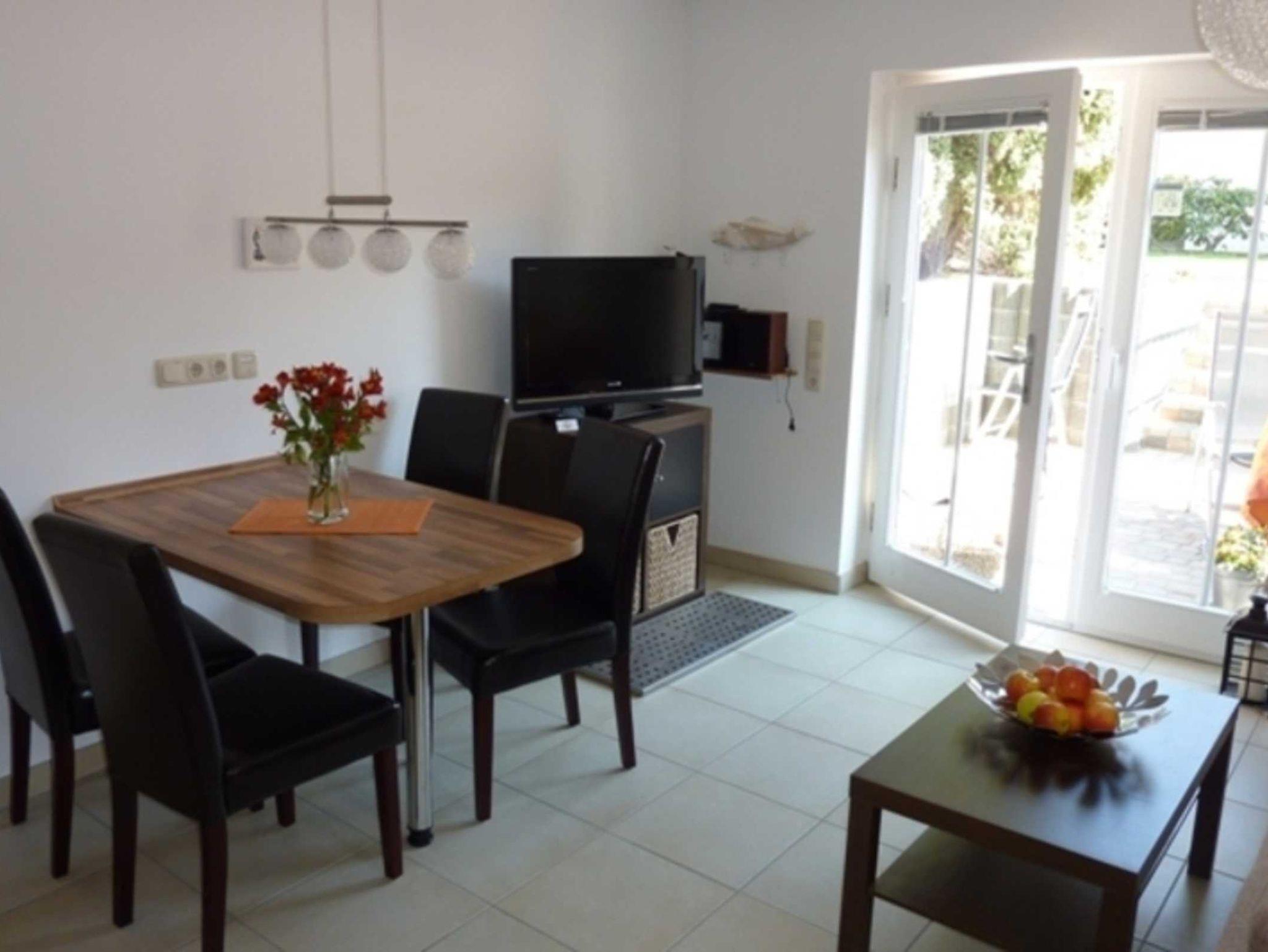Das Wohnzimmer verfügt über einen Full-HD-TV, eine Hifi-Anlage, eine Schlafcouch und eine Einbauküche.