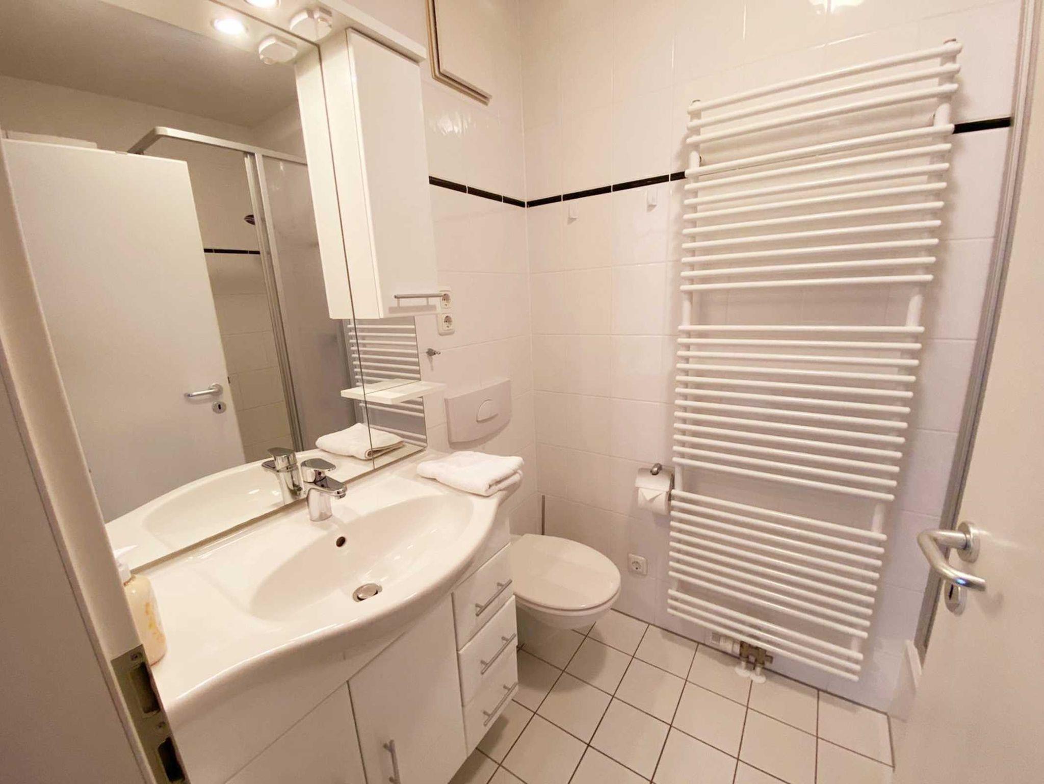 • Bad: ohne Fenster, Dusche, Waschbecken, Toilette, Spiegel, Schrank, Handtuchheizkörper, Waschmaschine
