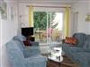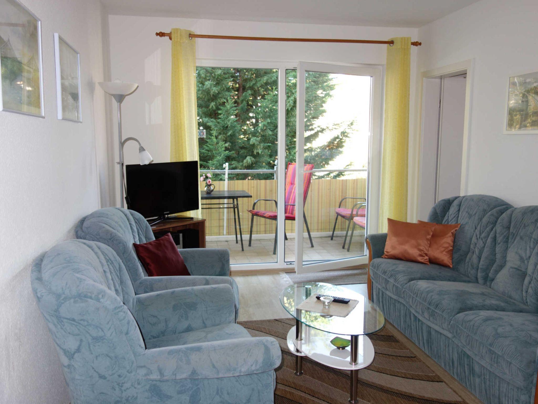 Im Wohnzimmer stehen eine Couch, 2 Sessel sowie ein Flachbildfernseher und ein Radio mit CD-Player.
