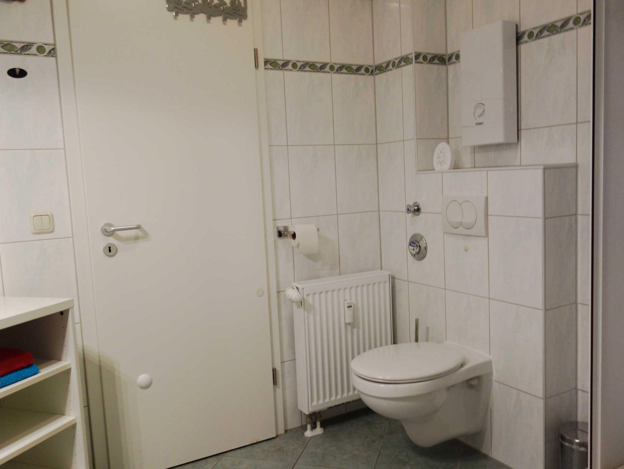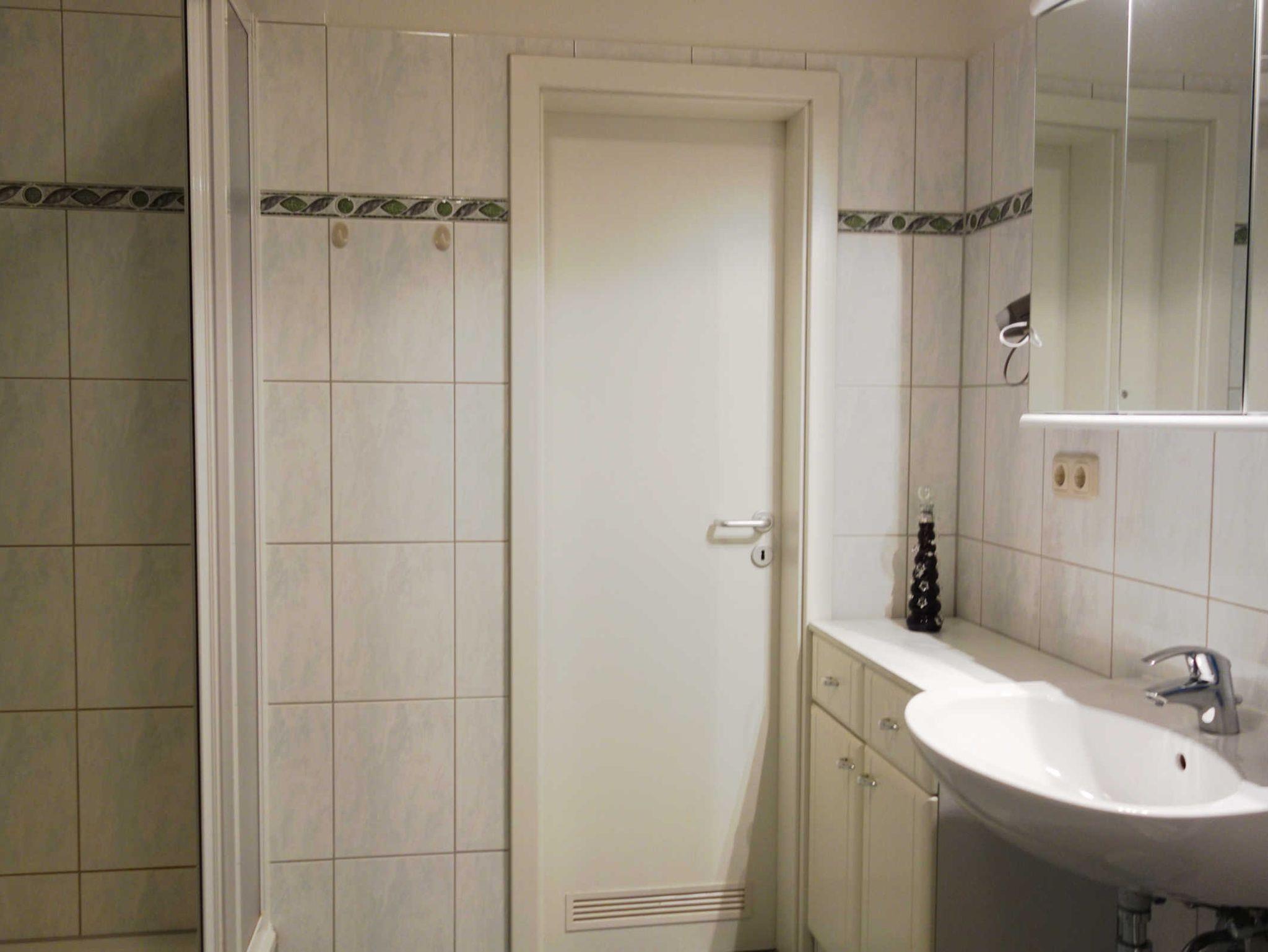 Das Bad verfügt über eine Dusche, einen Waschtisch und ein WC.