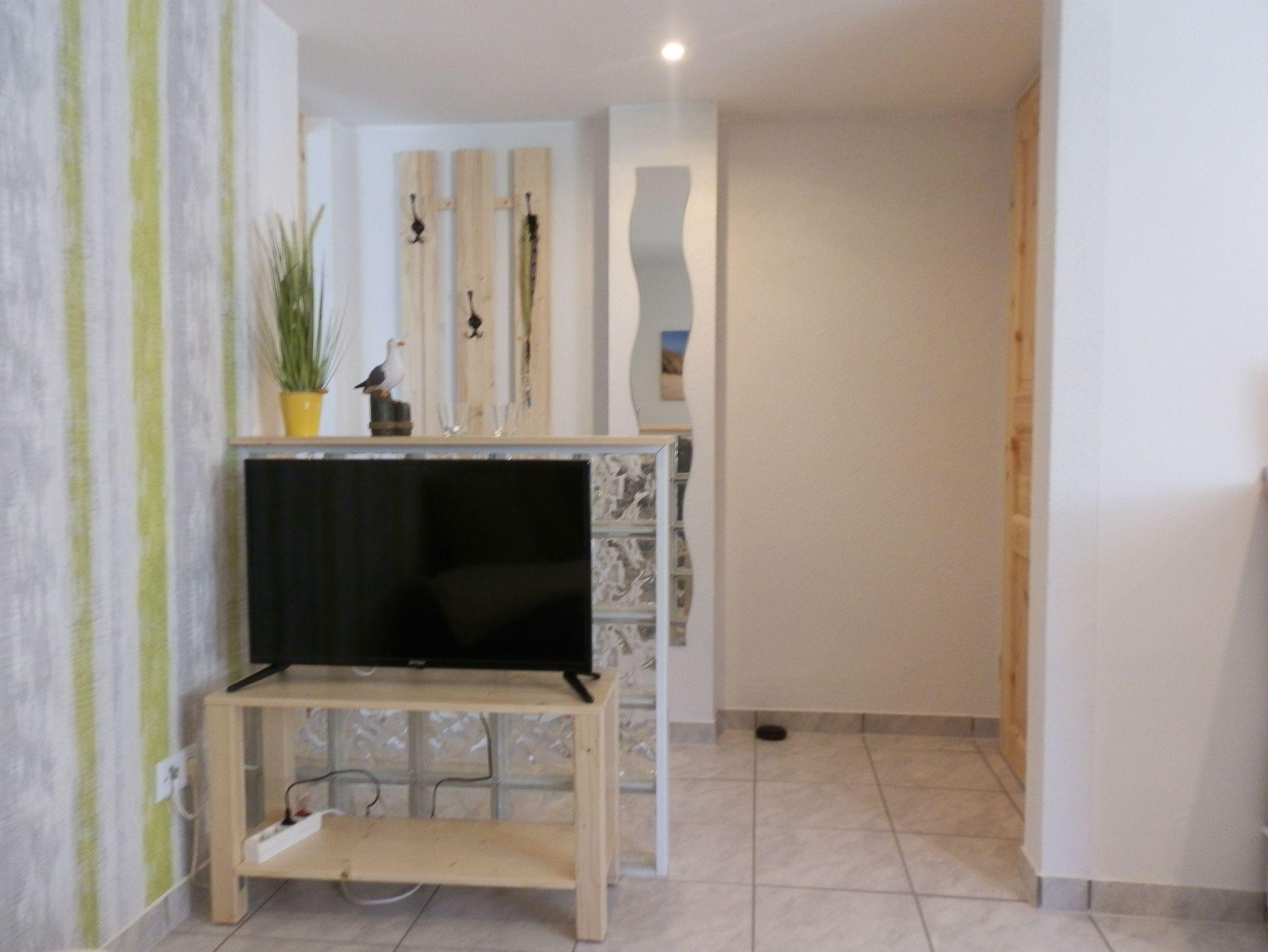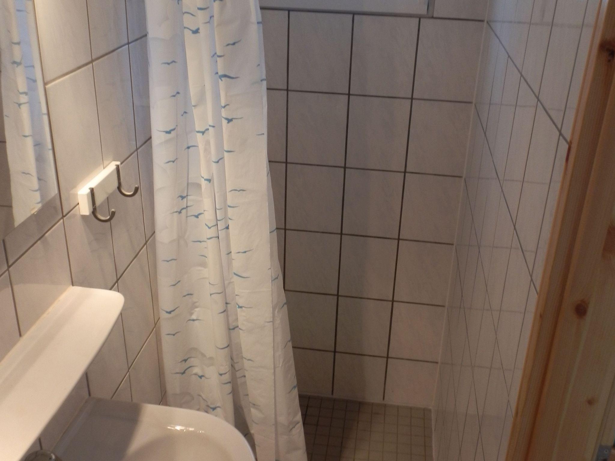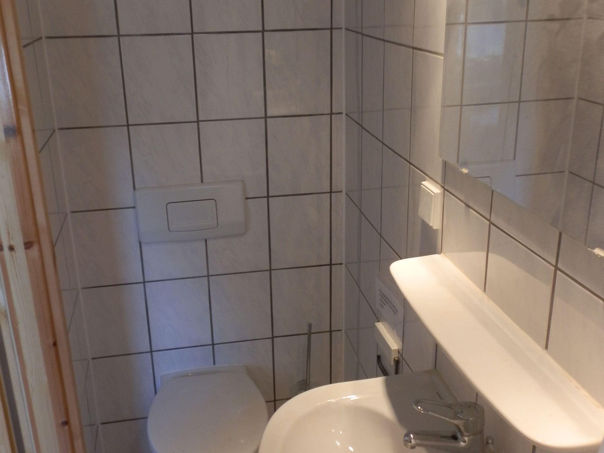 Das kleine Bad ist mit Dusche und WC ausgestattet. Handseife und eine Rolle Toilettenpapier stehen als Erstausstattung zur Verfügung. Föhn und Bügeleisen sind auf Nachfrage erhältlich.