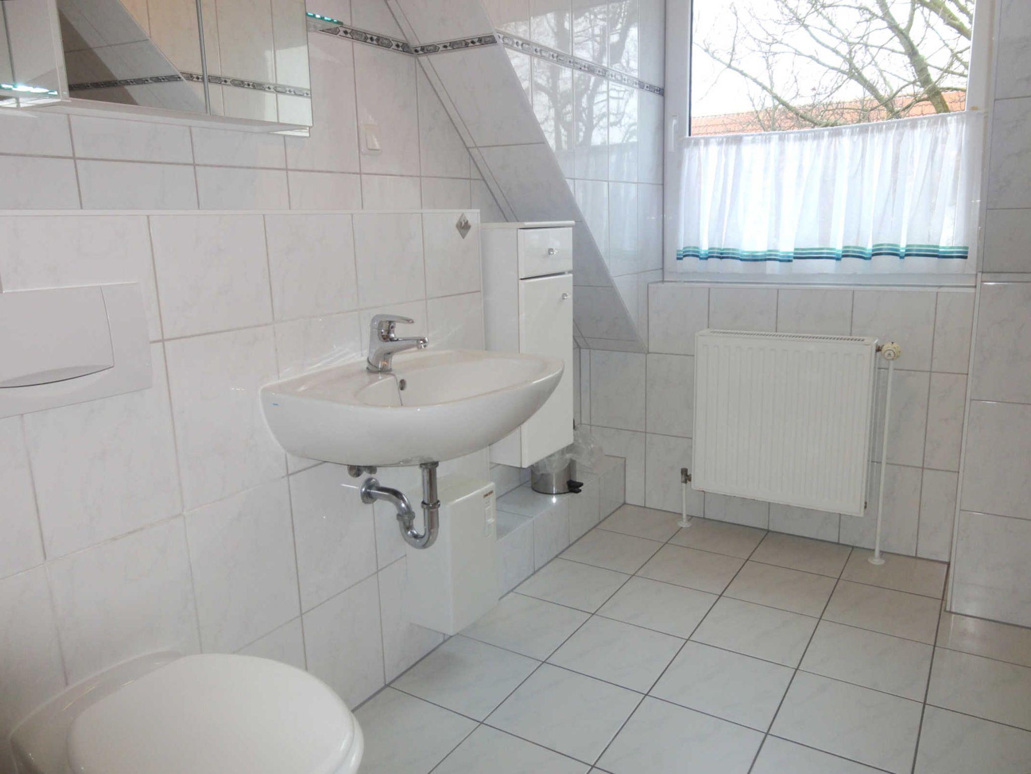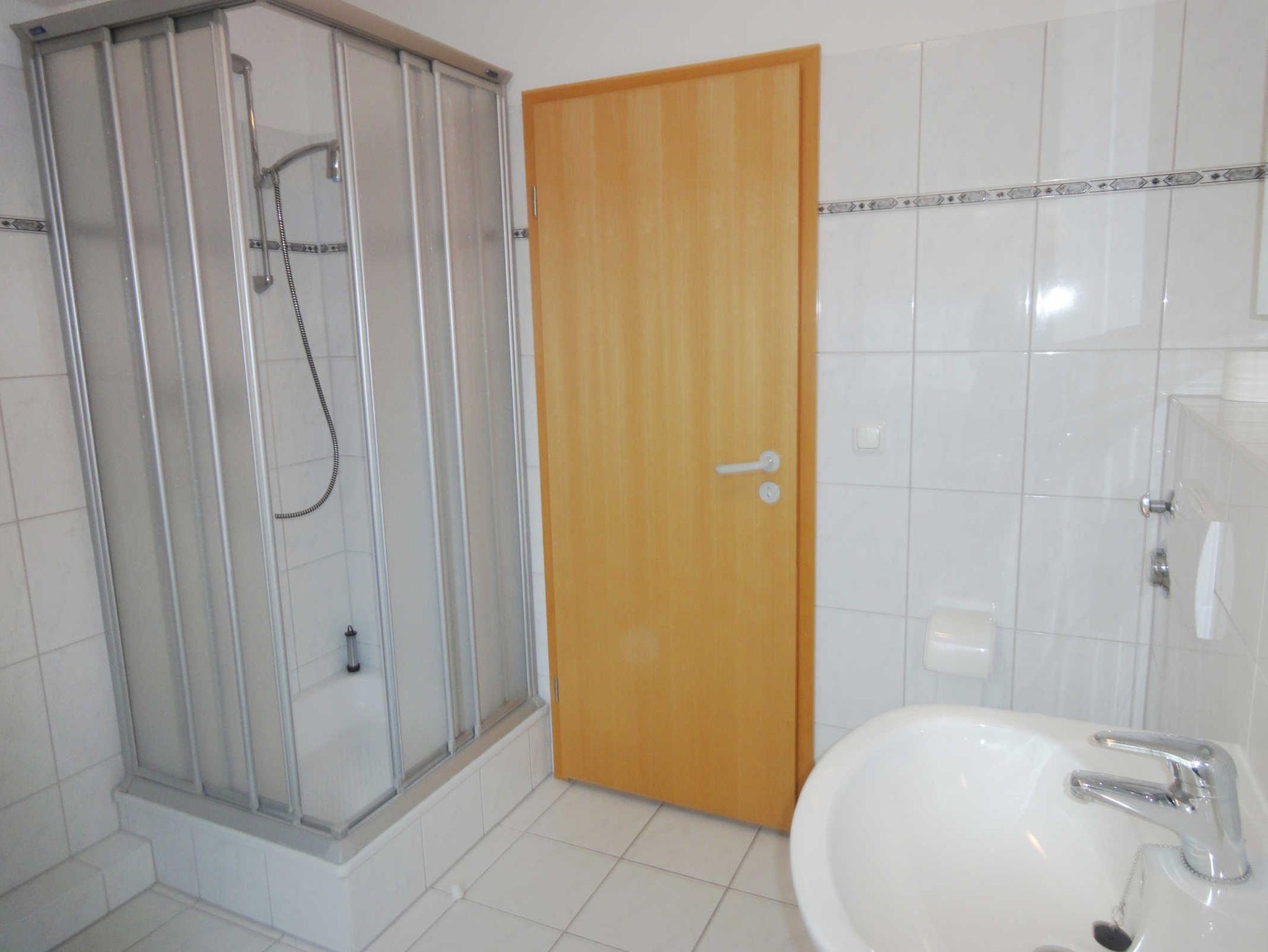 Das geflieste Bad ist mit einer Dusche, einem Waschtisch und einem WC ausgestattet.