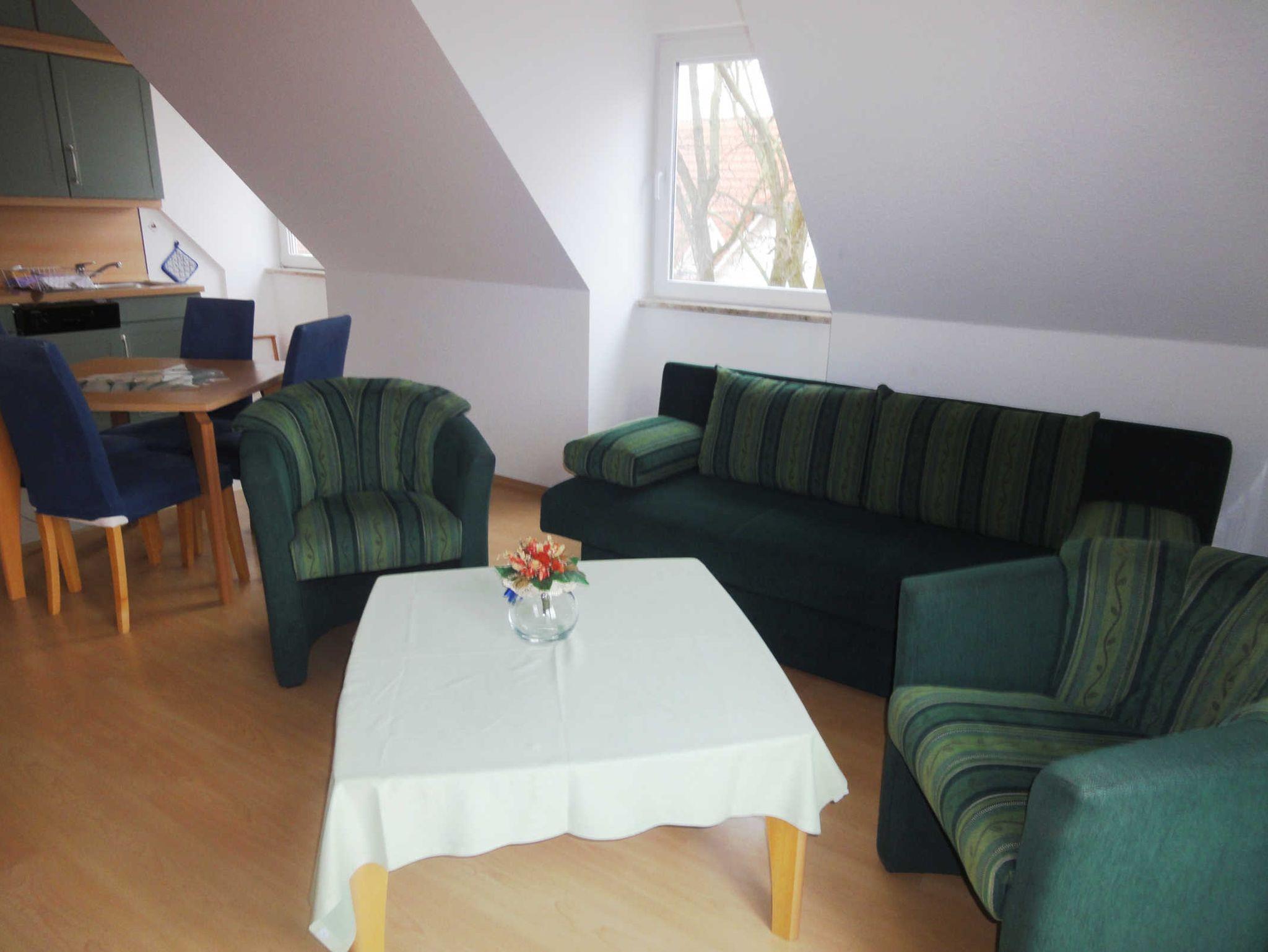 Der Wohn- und Schlafbereich ist mit einer Schlafcouch für 2 Personen ausgestattet und verfügt über eine kleine Stereo Anlage mit CD-Player sowie einen Flachbildfernseher. Zu dem Appartement gehört ein Balkon mit Richtung gen Süden.