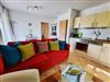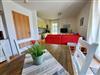 Die Küchenzeile ist in das Wohnzimmer integriert und verfügt u.a. über einen Geschirrspüler, einen Backofen, ein Ceranfeld mit 4 Kochfeldern, einen Kühlschrank mit Gefrierfach, eine Mikrowelle, einen Wasserkocher und eine Kaffeemaschine.