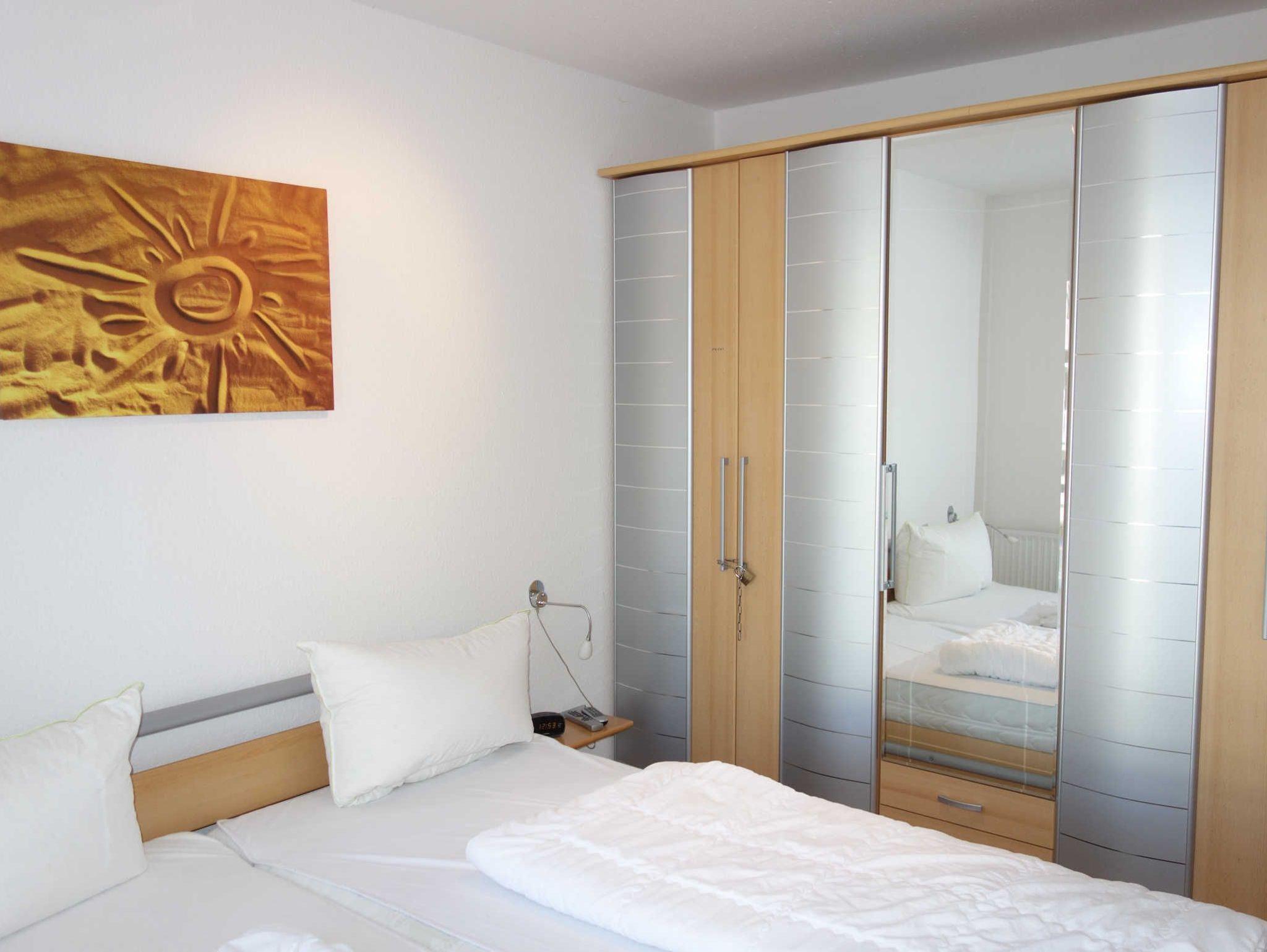 Im Schlafzimmer steht ein Doppelbett und ein Kleiderschrank mit einem großem Spiegel.
