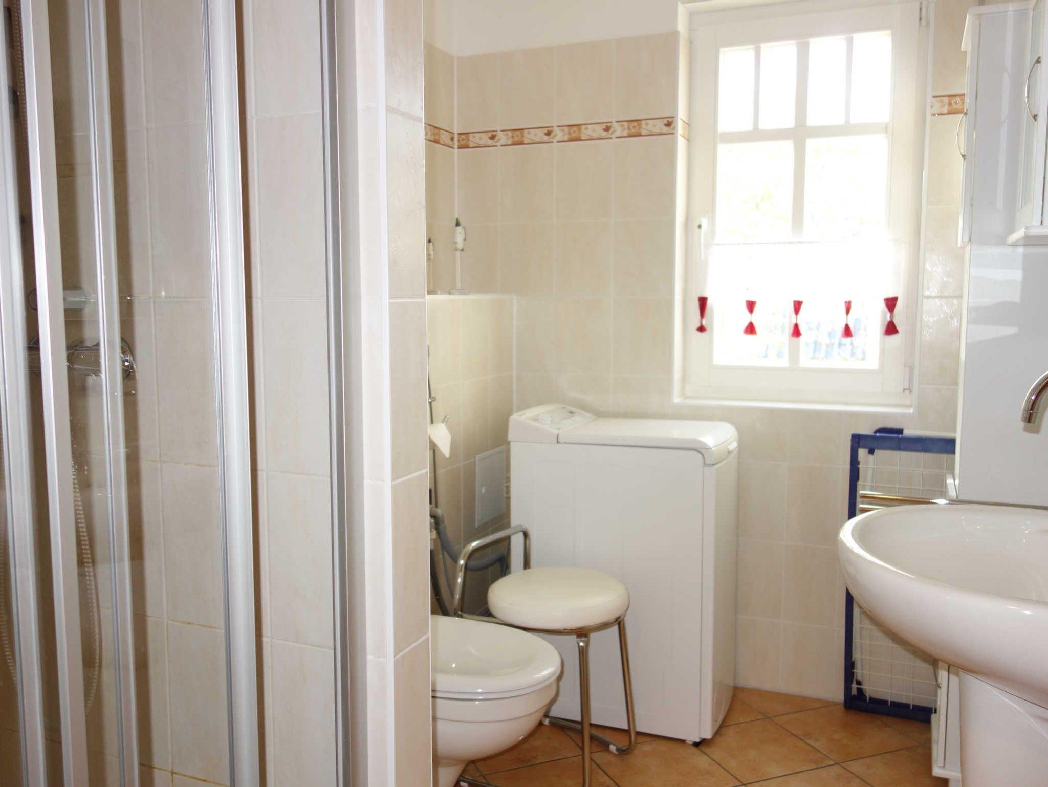 Das Bad hat ein Fenster und verfügt über eine Dusche, einen Waschtisch und ein WC.