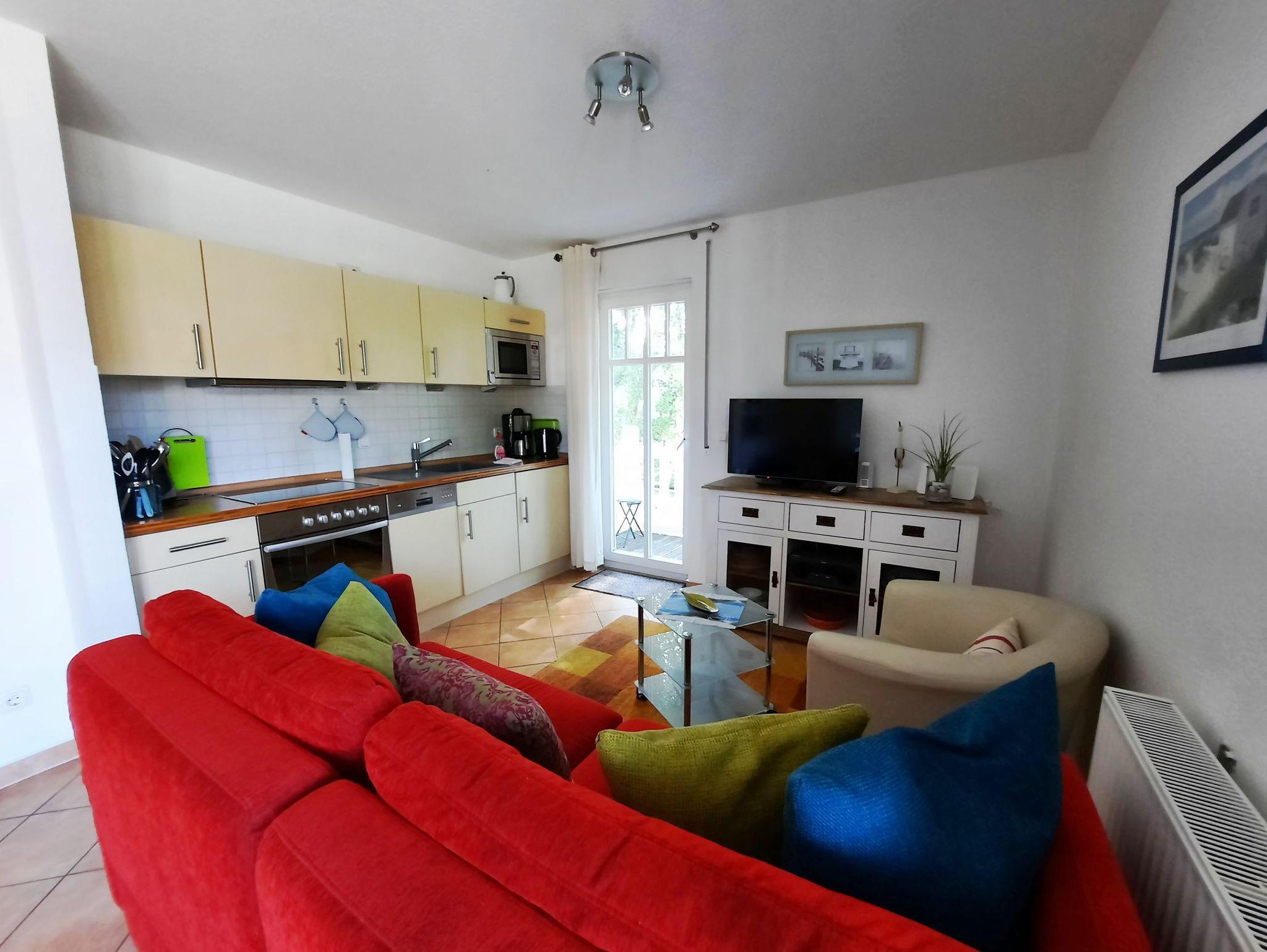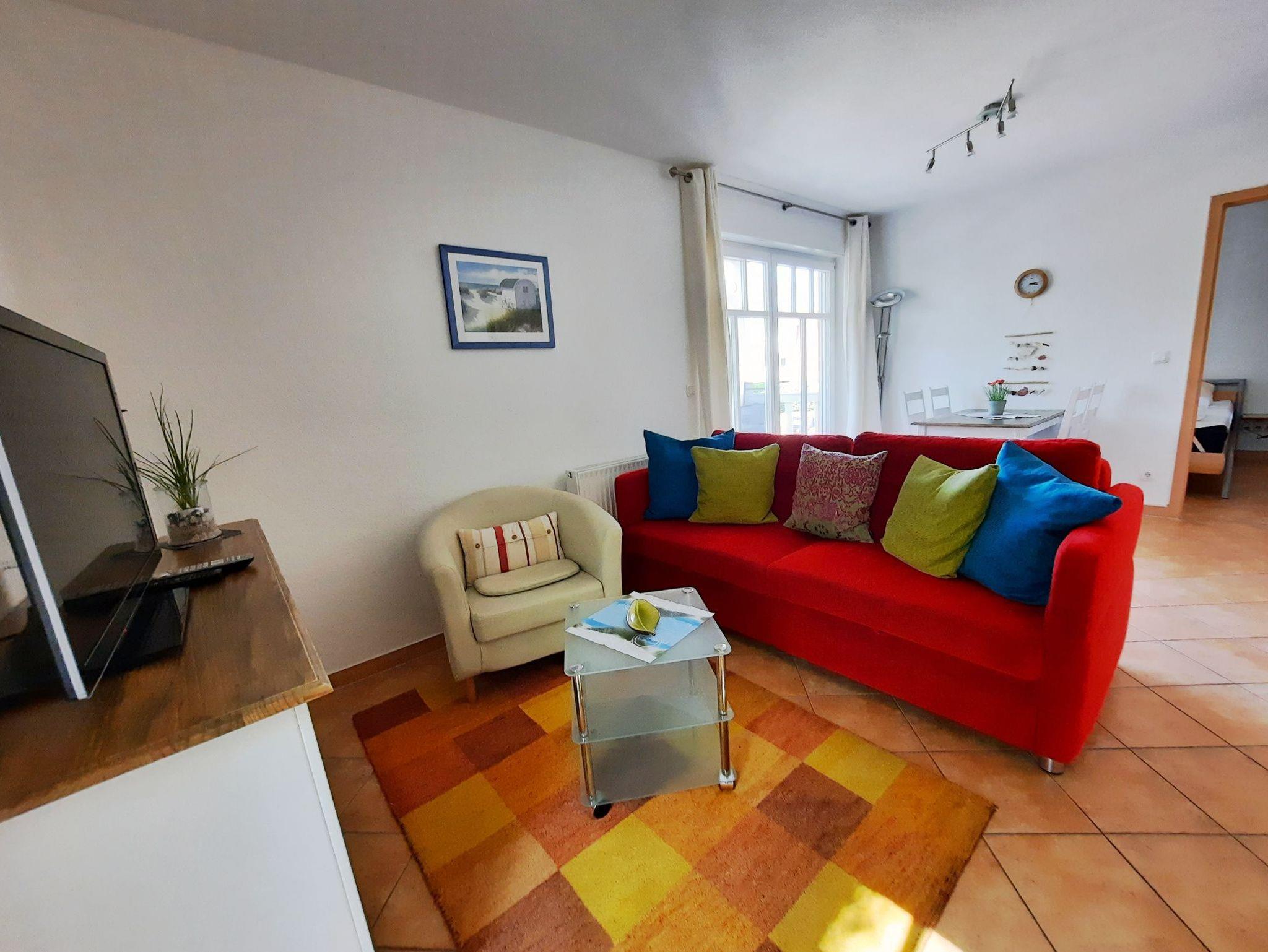 Die Ferienwohnung verfügt über ein Wohnzimmer mit Couch und Fernseher, eine Küchenzeile mit Geschirrspüler, Kühlschrank und Cerankochfeld, ein Schlafzimmer mit Doppelbett sowie über ein Bad mit Dusche, WC, Waschmaschine und Waschtisch.