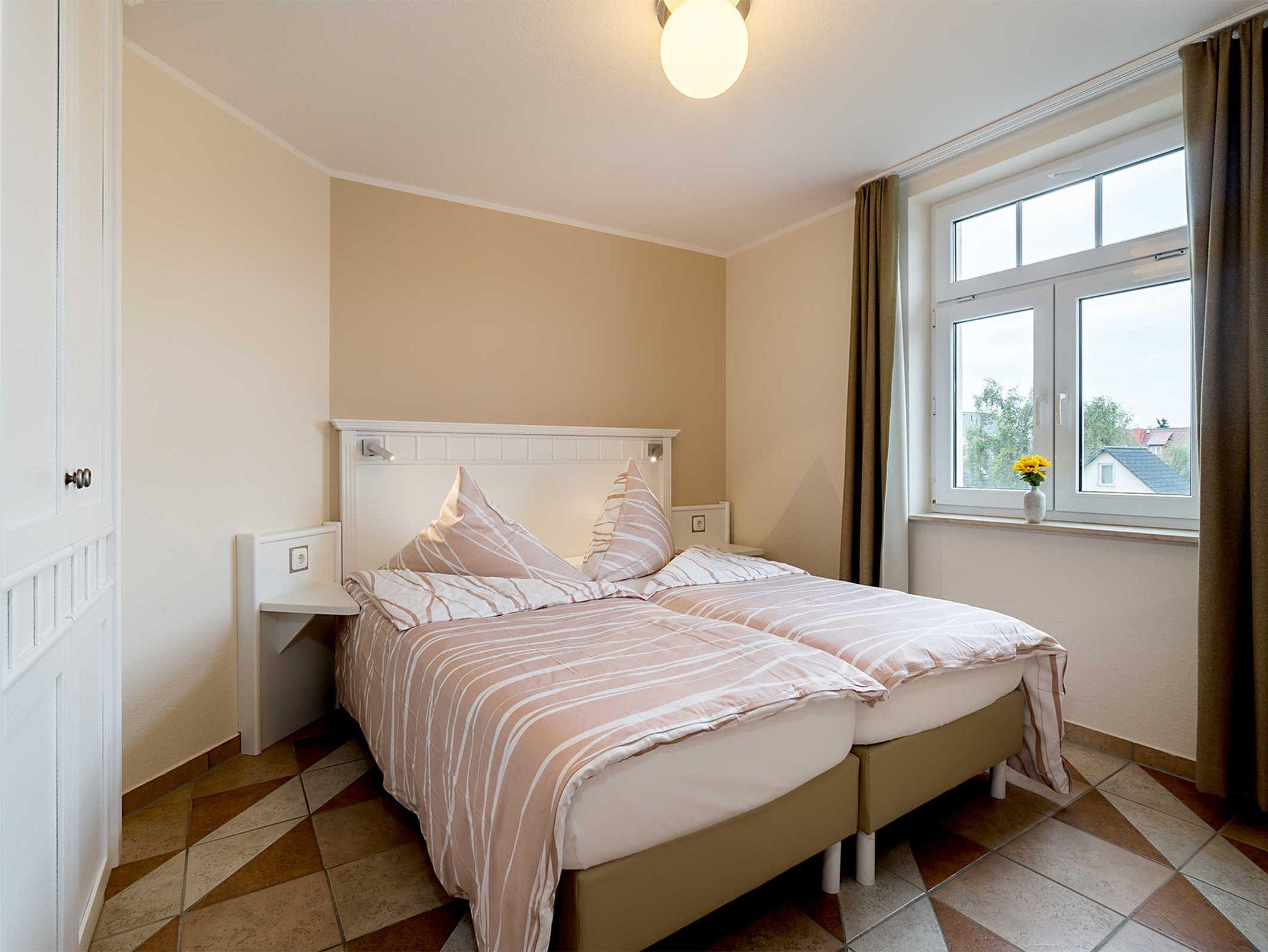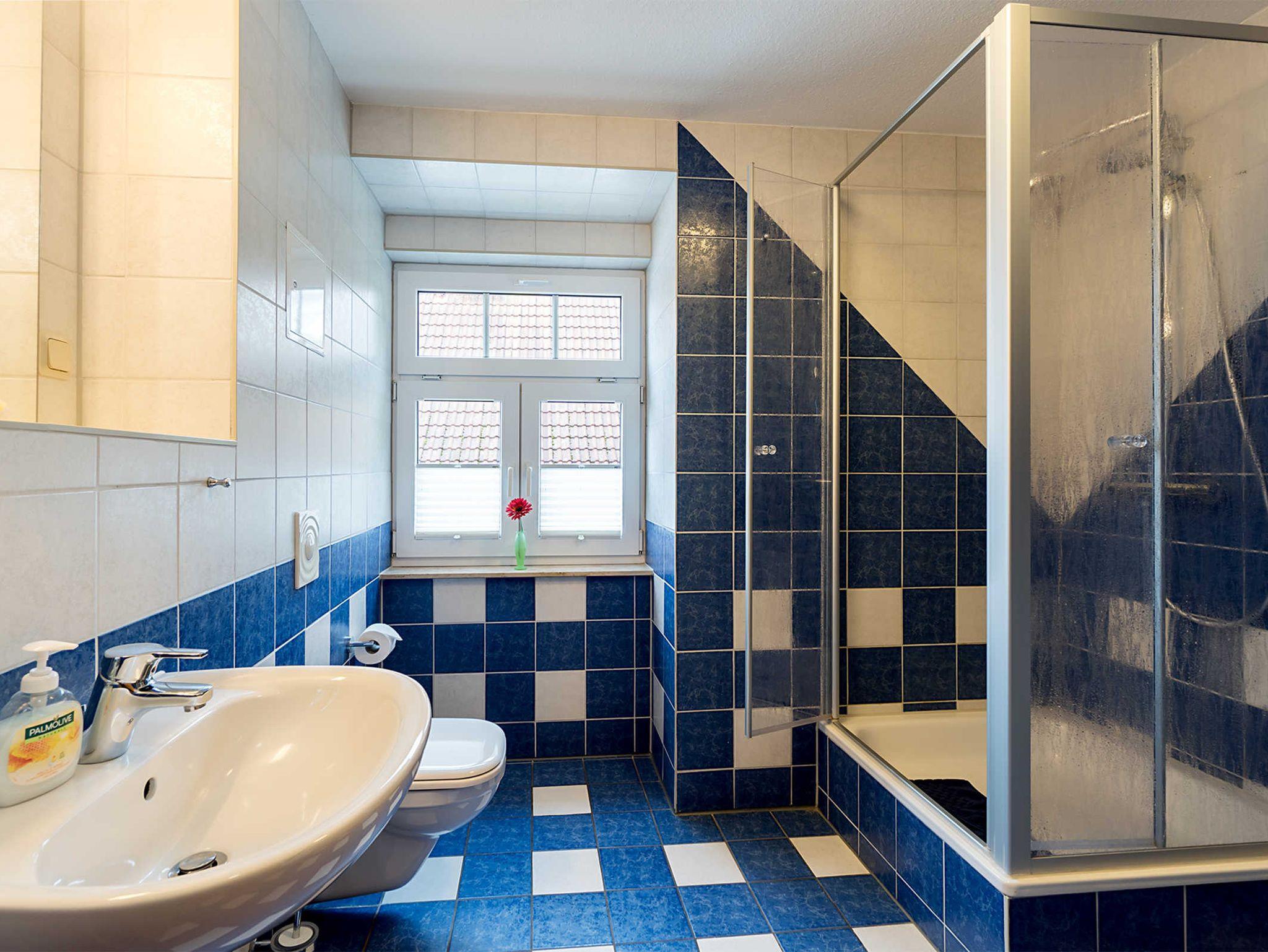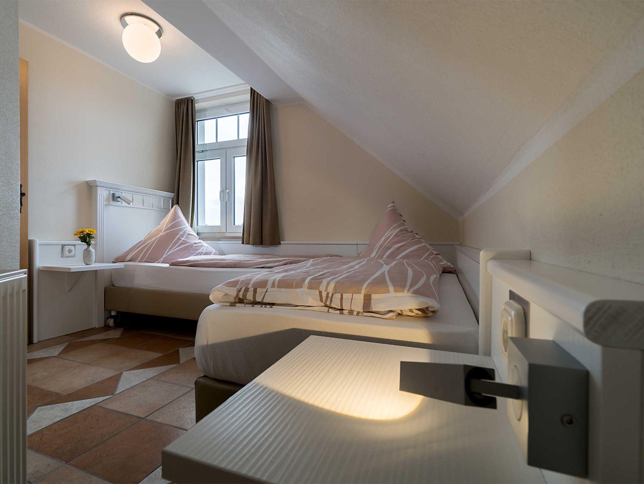 Diese Ferienwohnung bietet 85 m² Urlaub auf 2 Etagen. Neben einem Wohnbereich mit Küche und Balkon, finden Sie hier 3 Schlafzimmer, zwei mit Doppelbett und eines mit zwei Einzelbetten. Zudem verfügt diese Ferienwohnung über zwei Bäder. Eines der Bäder ist mit einer Dusche ausgestattet und das andere mit einer Badewanne.
