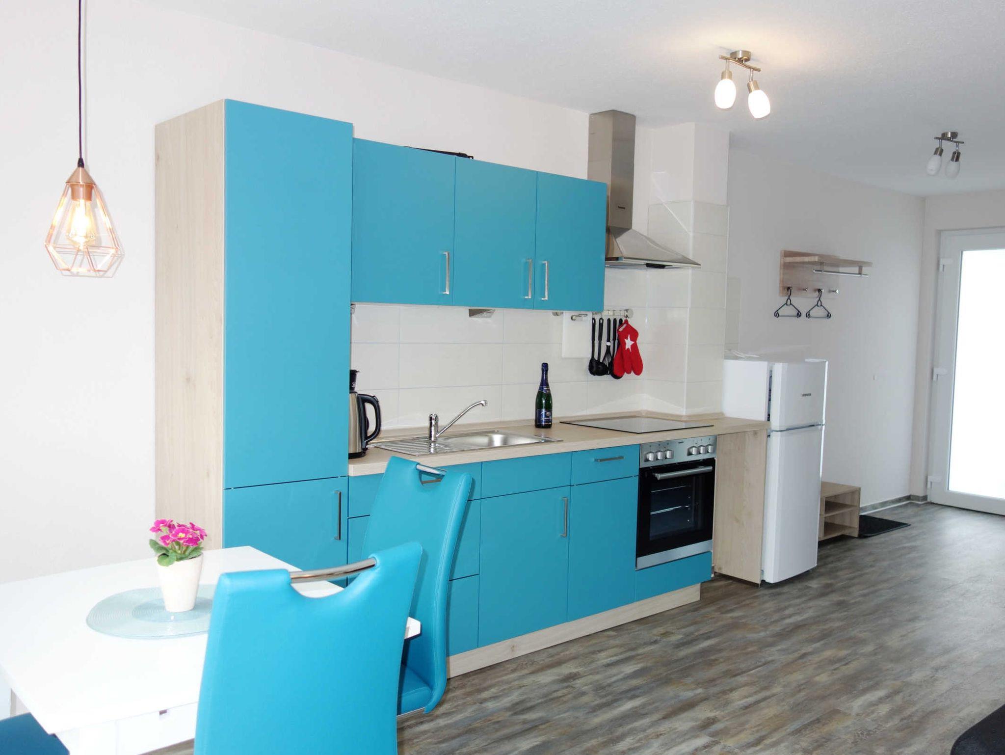 Die 2 Zimmer Ferienwohnung verfügt über ein Wohnzimmer mit einer Couch und einem Fernseher, eine offene Küche und ein Bad mit Dusche / WC. Zu der Ferienwohnung gehören außerdem ein PKW-Stellplatz und eine Terrasse sowie ein abschließbarer Fahrradschuppen.