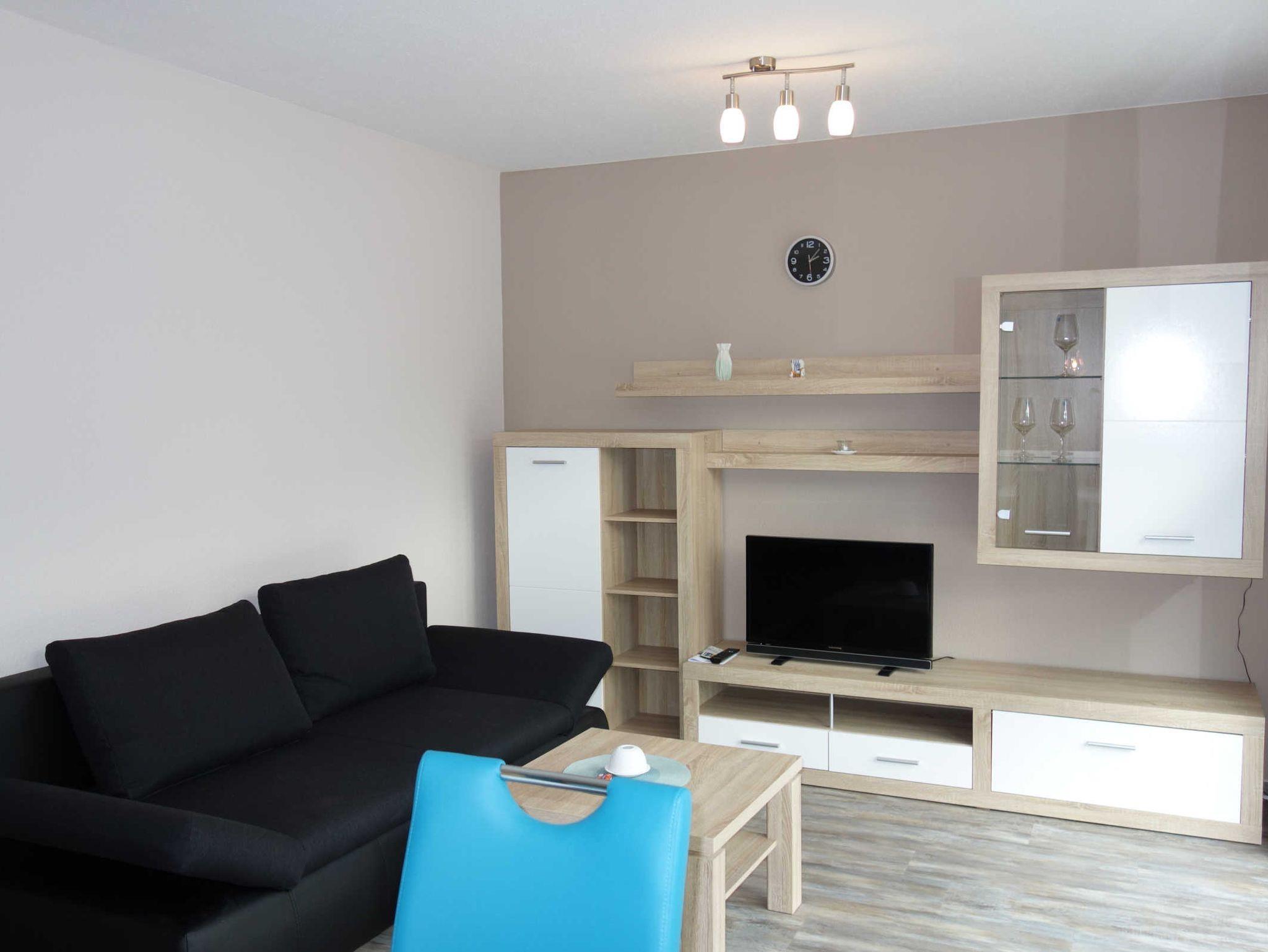 Das helle Wohnzimmer verfügt über eine Couch sowie über einen Fernseher und ein Radio.