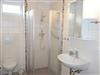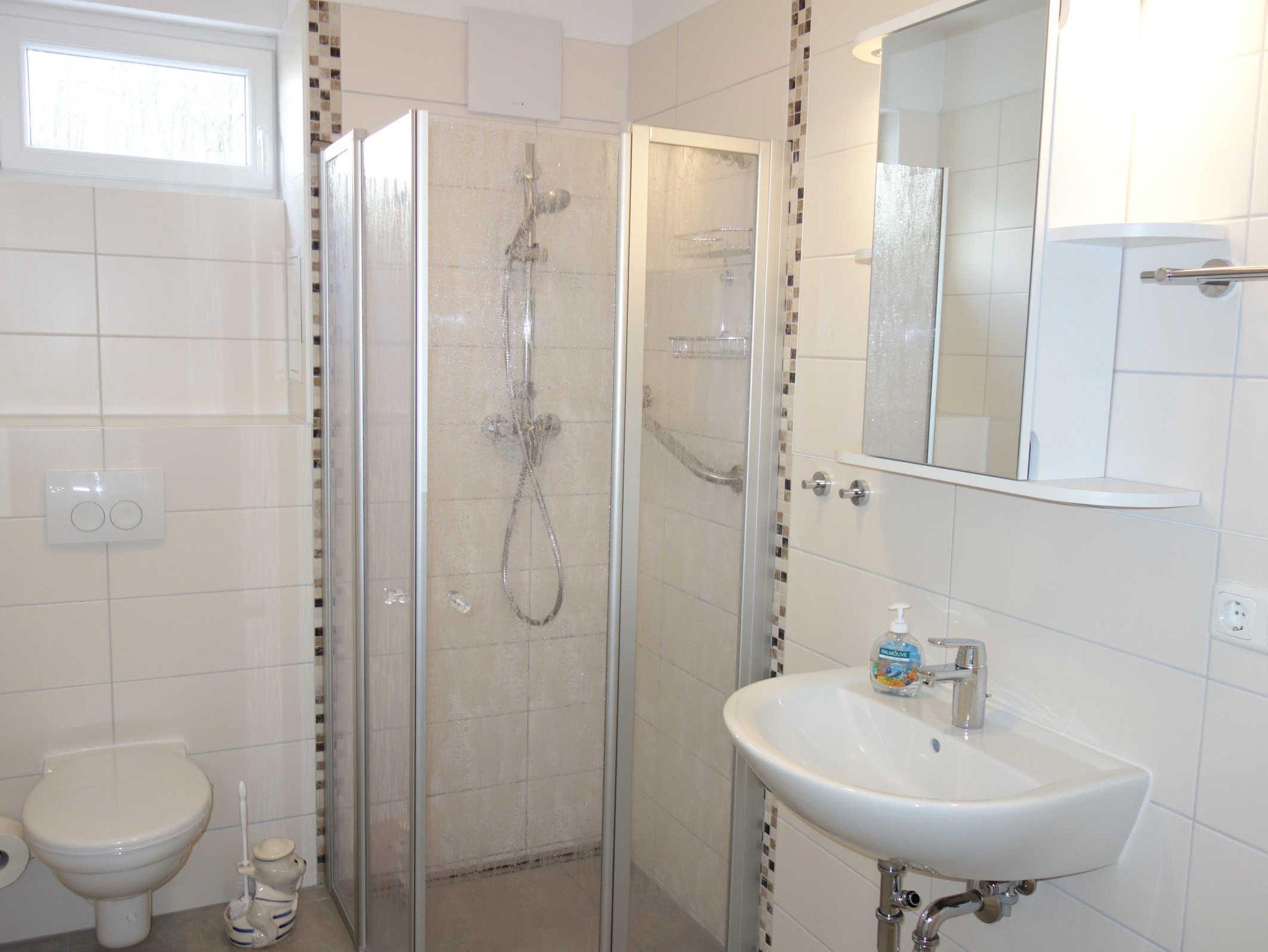 Im Bad mit kleinem Fenster befinden sich eine Dusche, ein WC und ein Waschtisch.