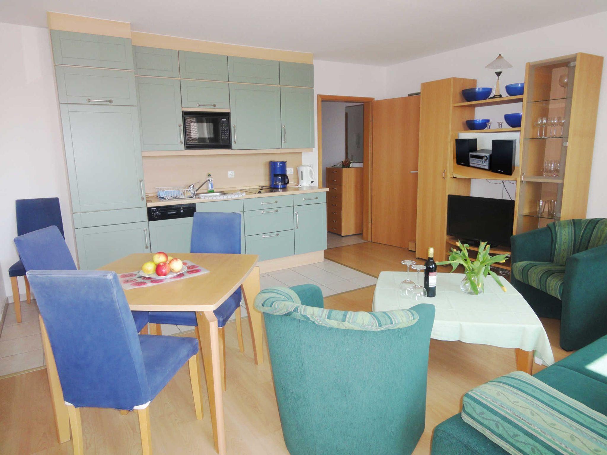 Die in das Wohnzimmer integrierte Küche hat einen einen Geschirrspüler, 2 Ceranfelder, einen Kühlschrank sowie einen Esstisch mit 3 Stühlen.