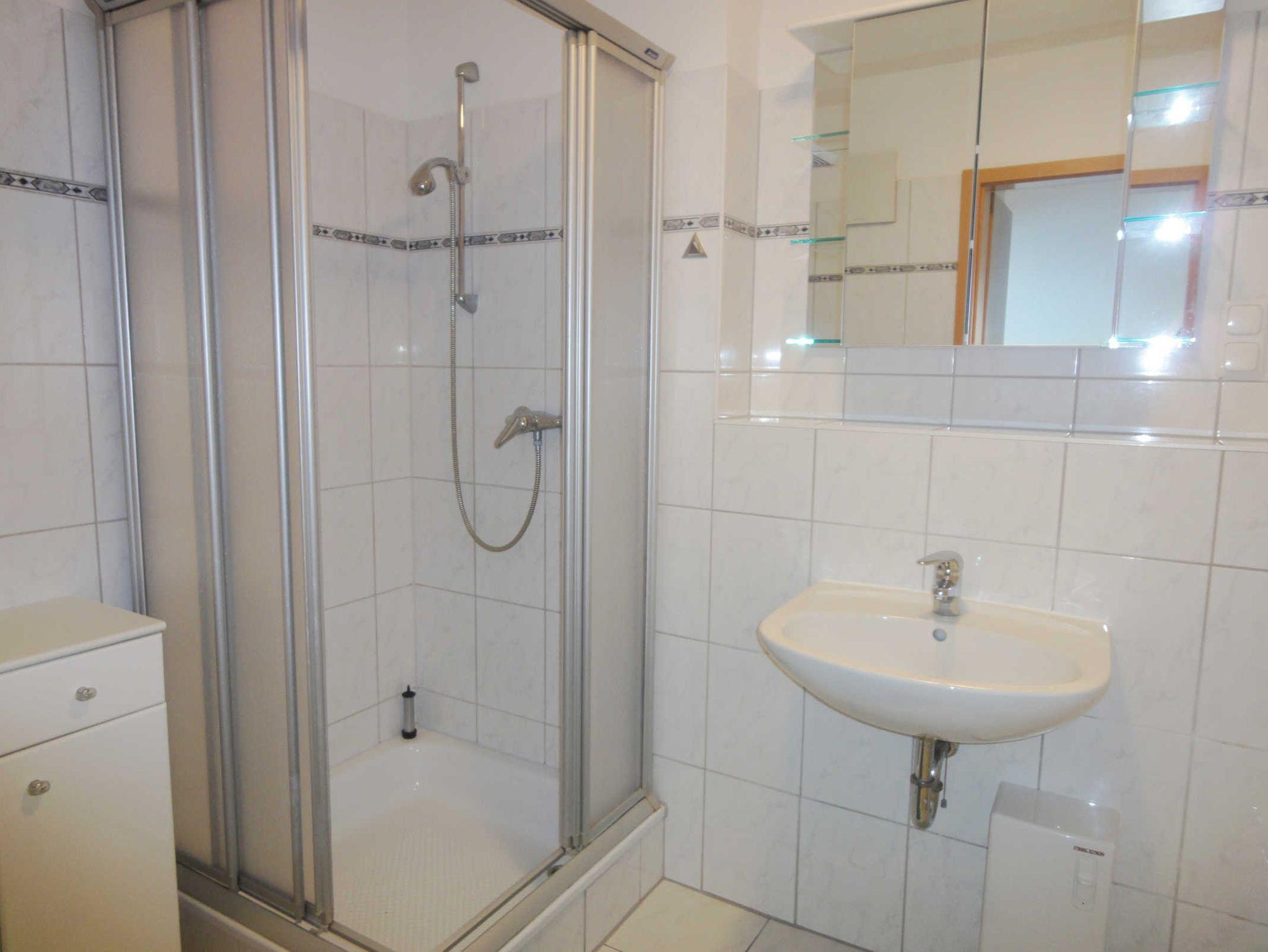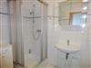 Das geflieste Bad ist mit einer Dusche, einem Waschtisch und einem WC ausgestattet.