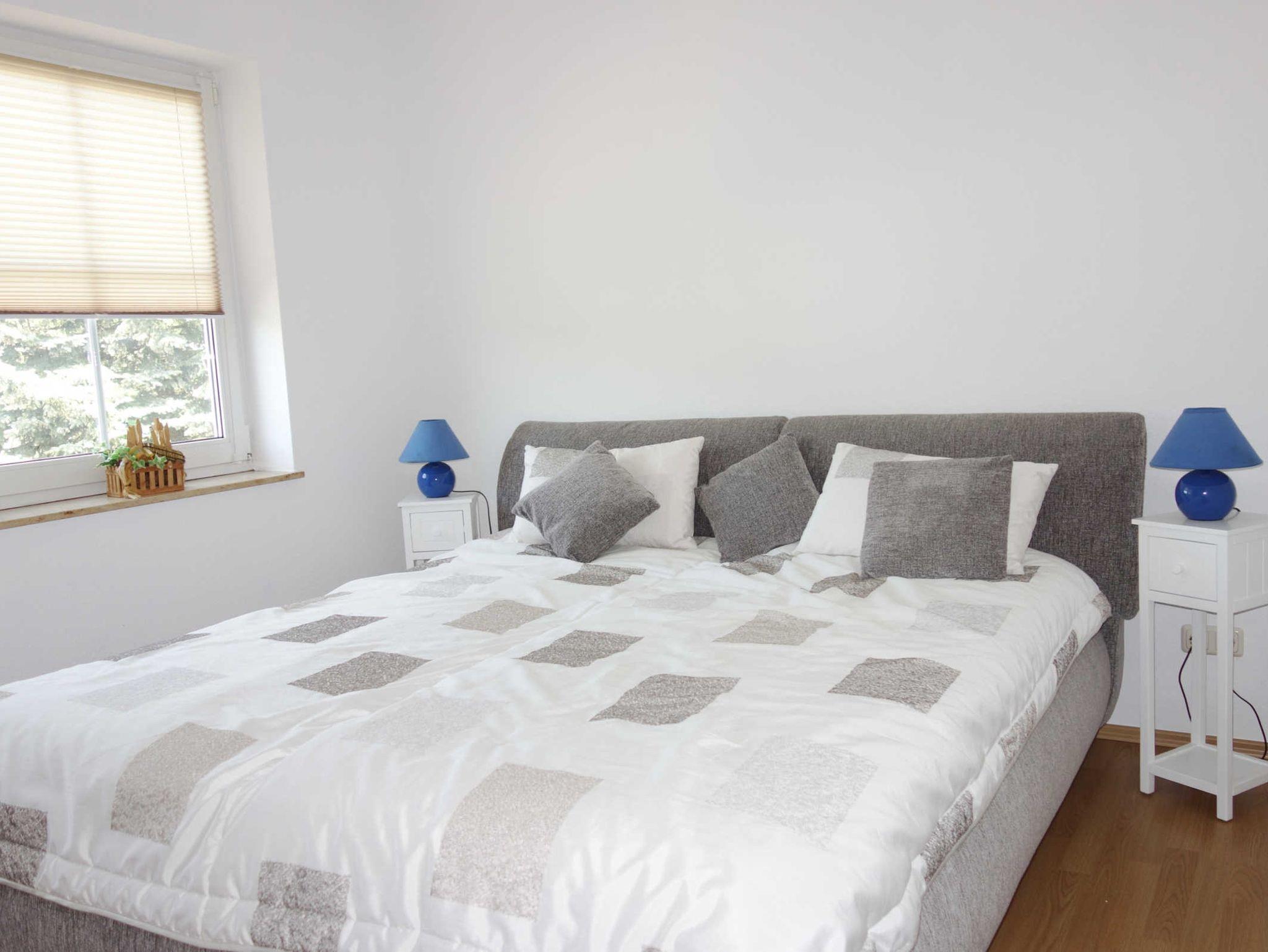 Das Schlafzimmer verfügt über ein Doppelbett und einen Kleiderschrank.