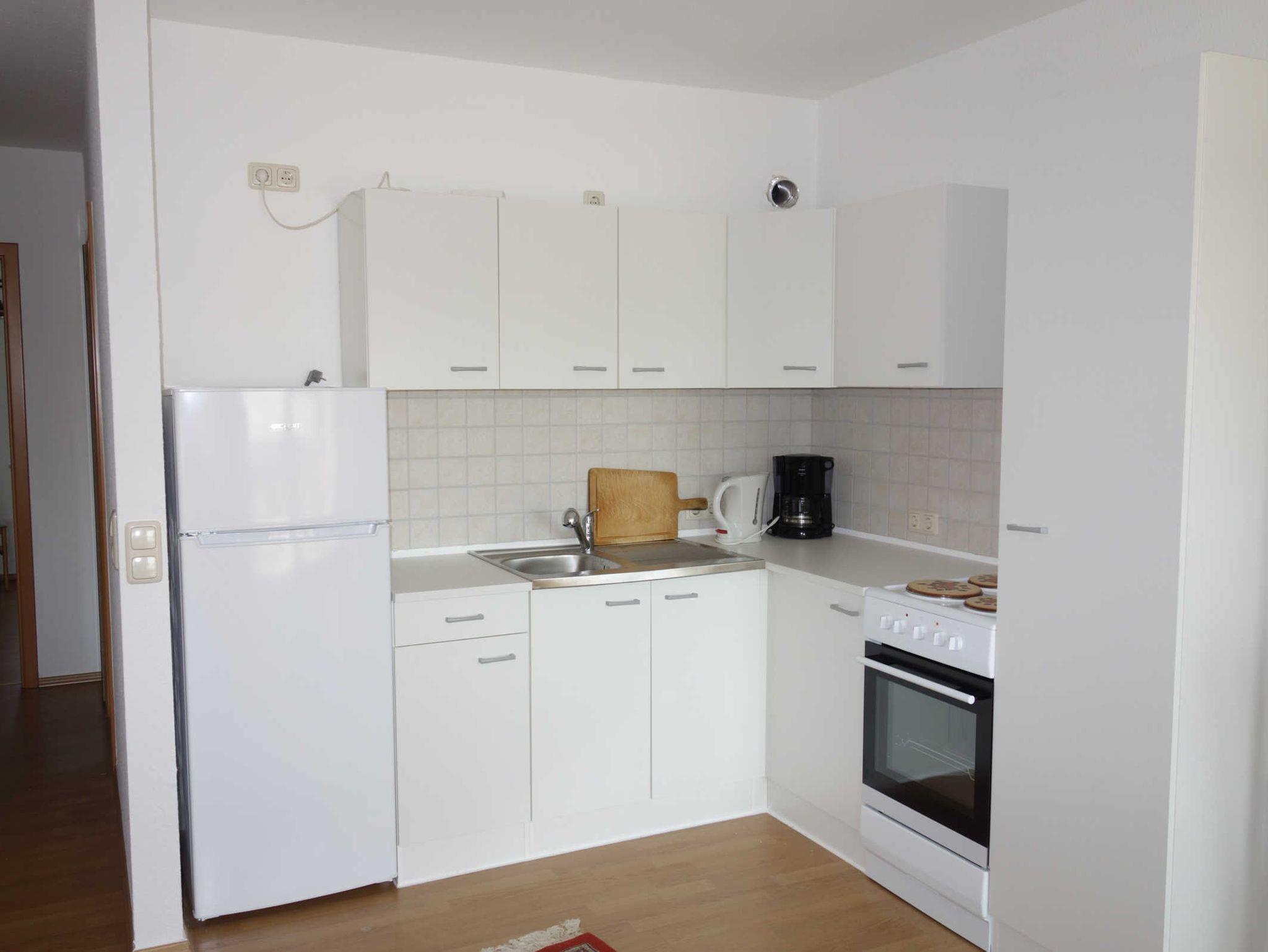 Die in das Wonzimmer integrierte Küchenzeile ist u.a. mit einem Kühlschrank, 4 Kochplatten, einer Backröhre sowie einer Kaffeemaschine und einem Wasserkocher ausgestattet.