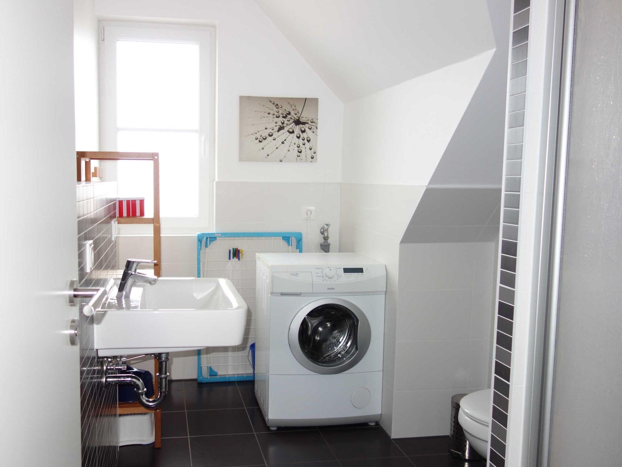 Im gefliesten Bad mit Fenster befinden sich die Dusche und das WC sowie eine Waschmaschine.