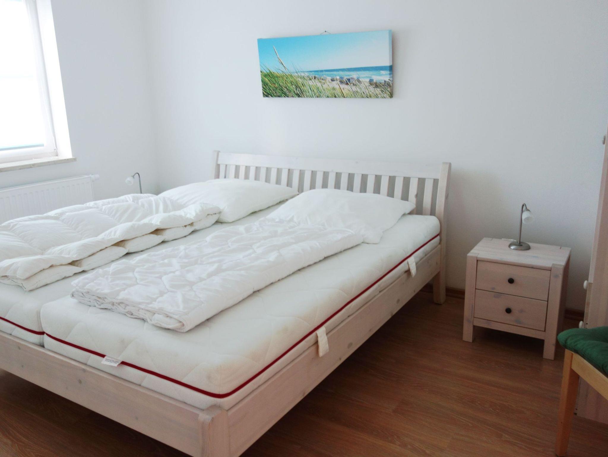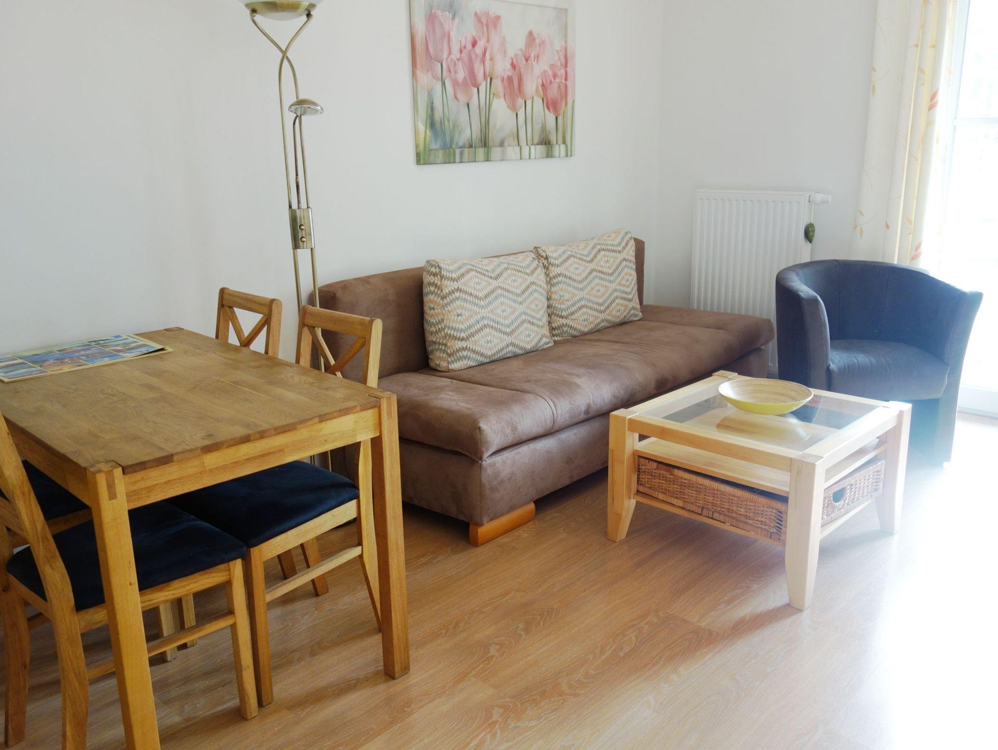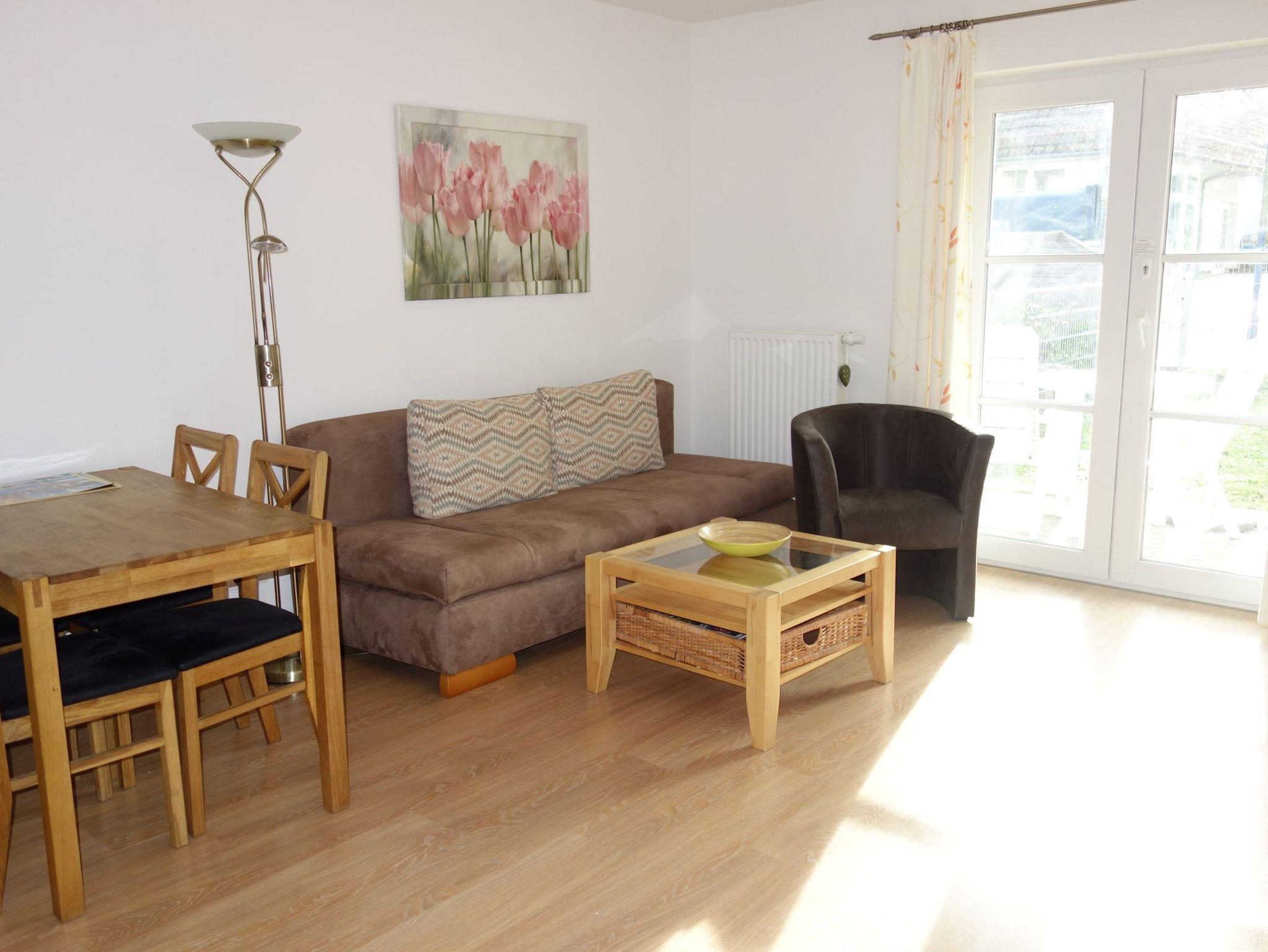 Ihre Ferienwohnung verfügt über ein Wohn- und ein Schlafzimmer. Im Wohnbereich befindet sich eine Schlafcouch sowie ein Fernseher.