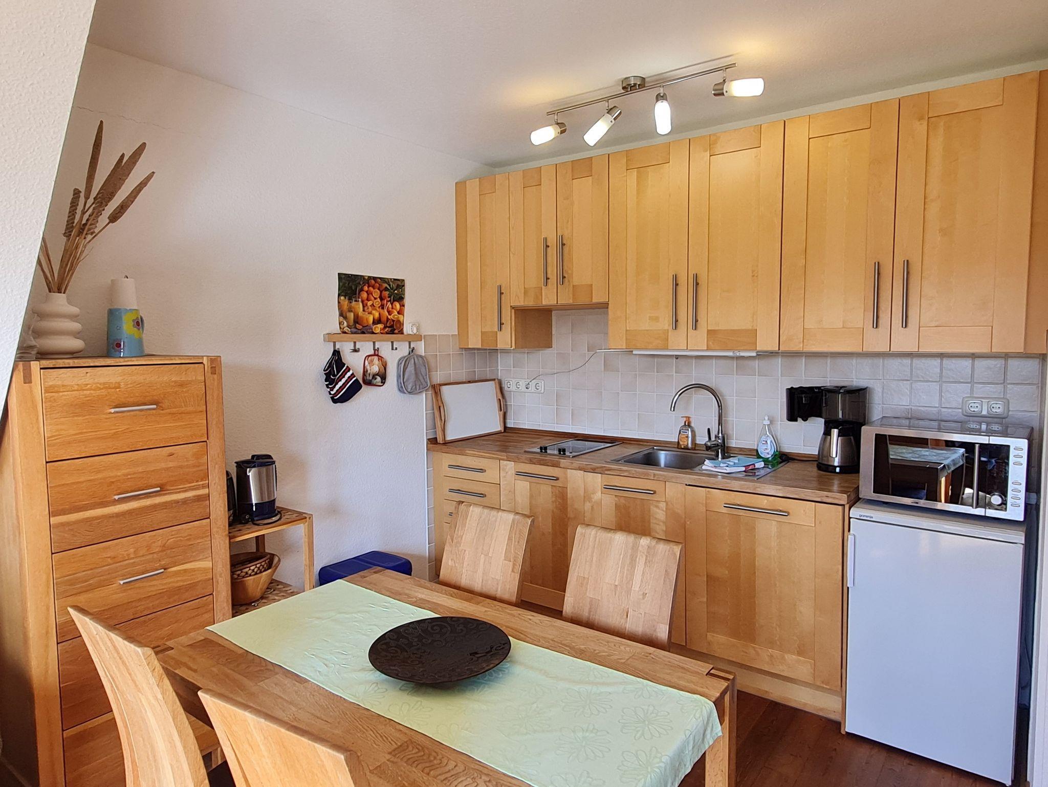 • Küche mit Essbereich für 4 Personen offen zum Wohnzimmer, mit komplett eingerichteter Einbauküche wie, Kombi-Mikrowelle/Backofen, 2 Kochfelder, Kühlschrank mit Gefrierfach, Wasserkocher, Toaster, Kaffeemaschine, Geschirrspüler