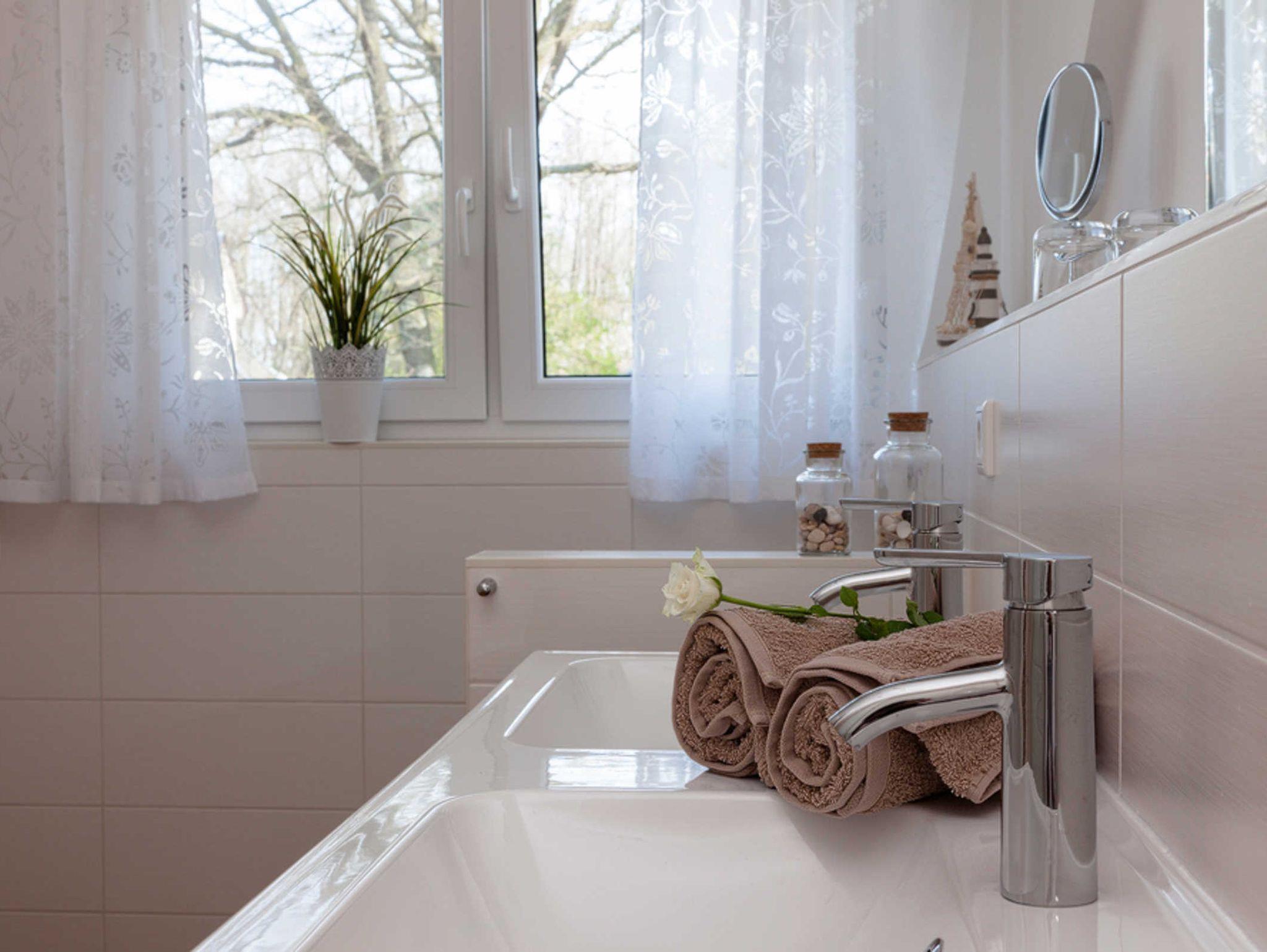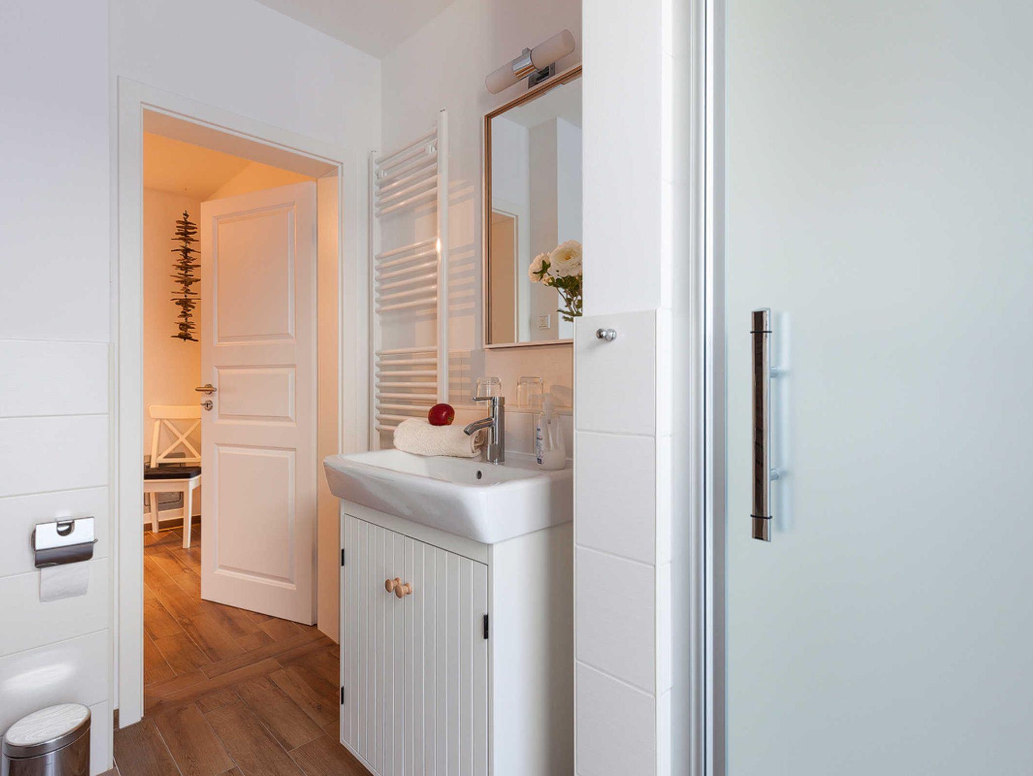 • Bad (oben): 100cm x 100 cm Dusche mit Glastür, Badewanne, Doppelwaschtisch, WC und Handtuchtrockner, Fön, Kosmetikspiegel, ausreichend Abstellfläche, gemütliche Gaube