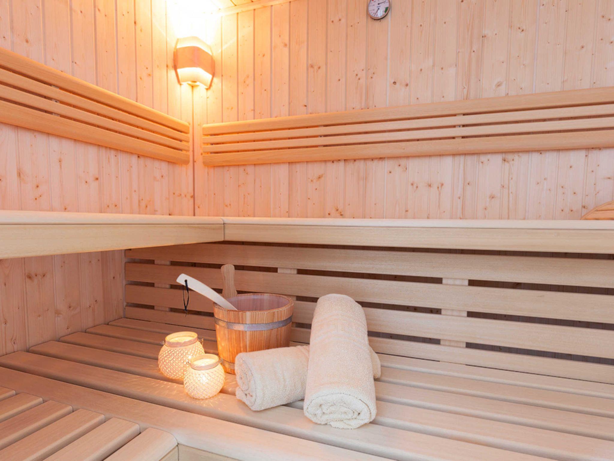 • Bad (unten): WC, Waschbecken, Handtuchtrockner, 90cm x 90cm Dusche mit Glastür, geräumiger Röger-Sauna (Innenmaß 2,20m x 1,60m) für 4-5 Personen inkl. Saunahandtücher